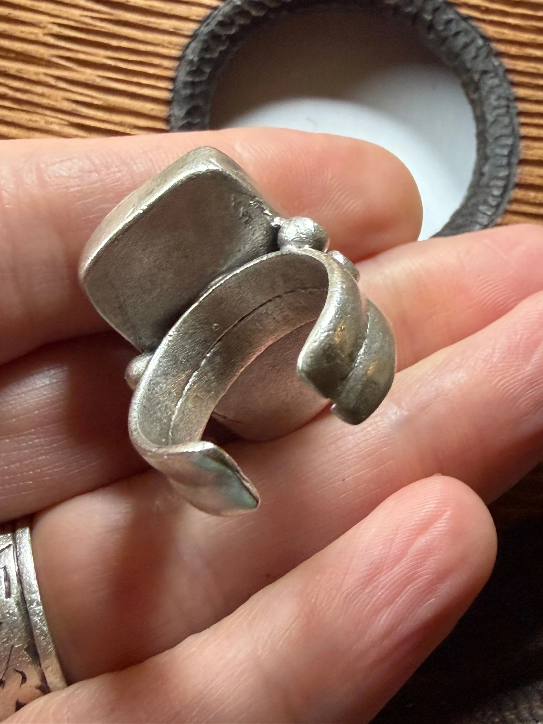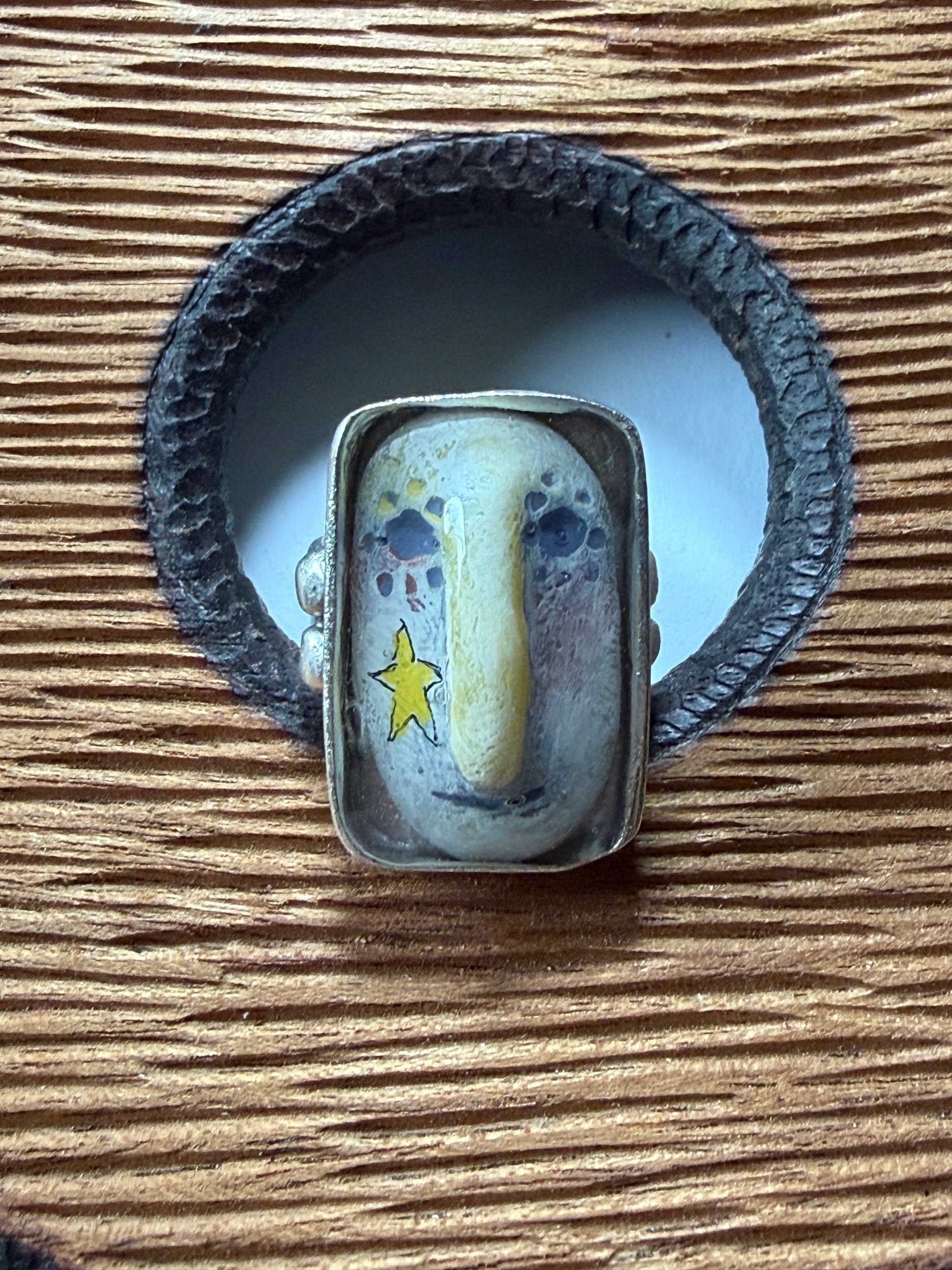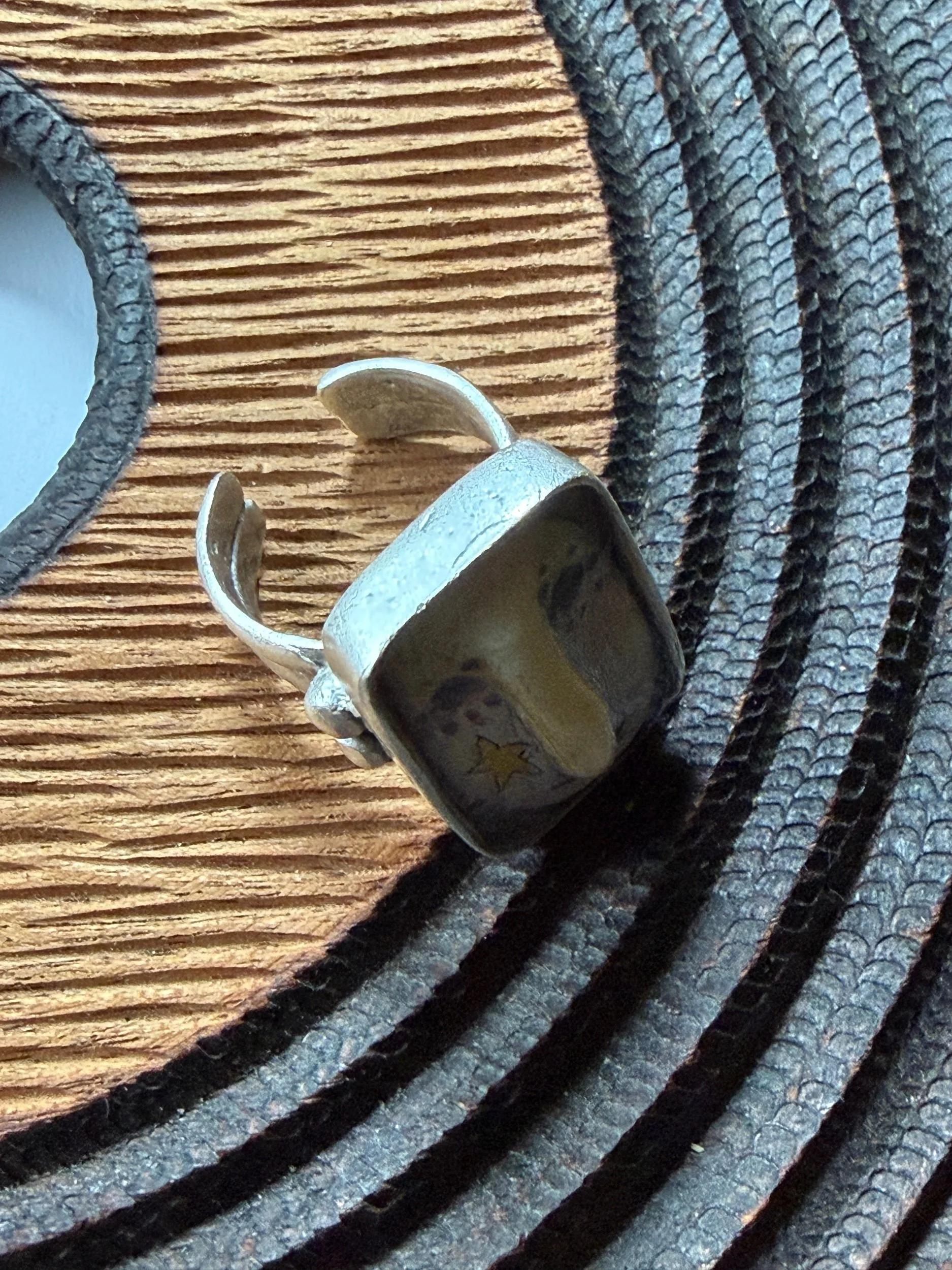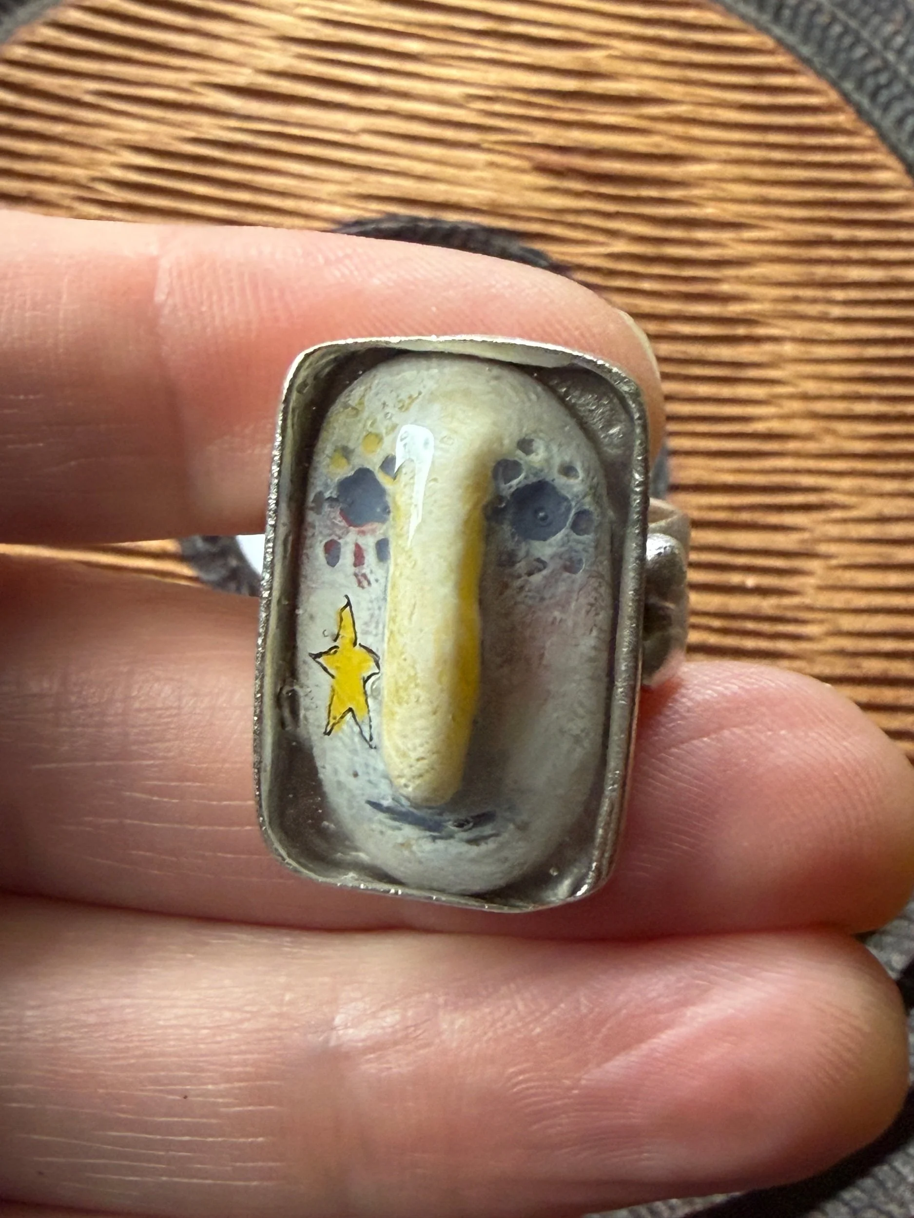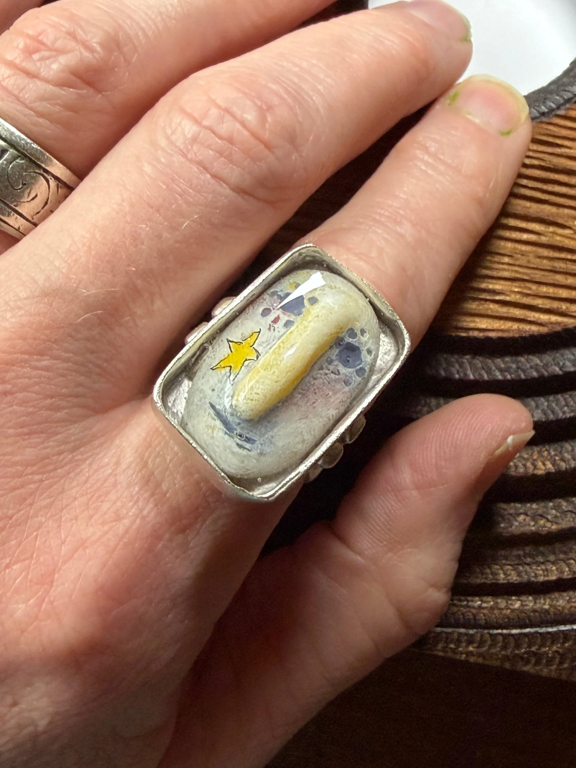 Comfortable to wear and one size fits most adjustable, this ring is 25x15mm, silver coated brass. The size is perfect for an accent ring or to wear alone! It is sculpted from polymer clay, molded, cast in resin, hand painted and then coated with several clear resin topcoats. (All of our pieces are one of a kind and may be imperfectly perfect.)