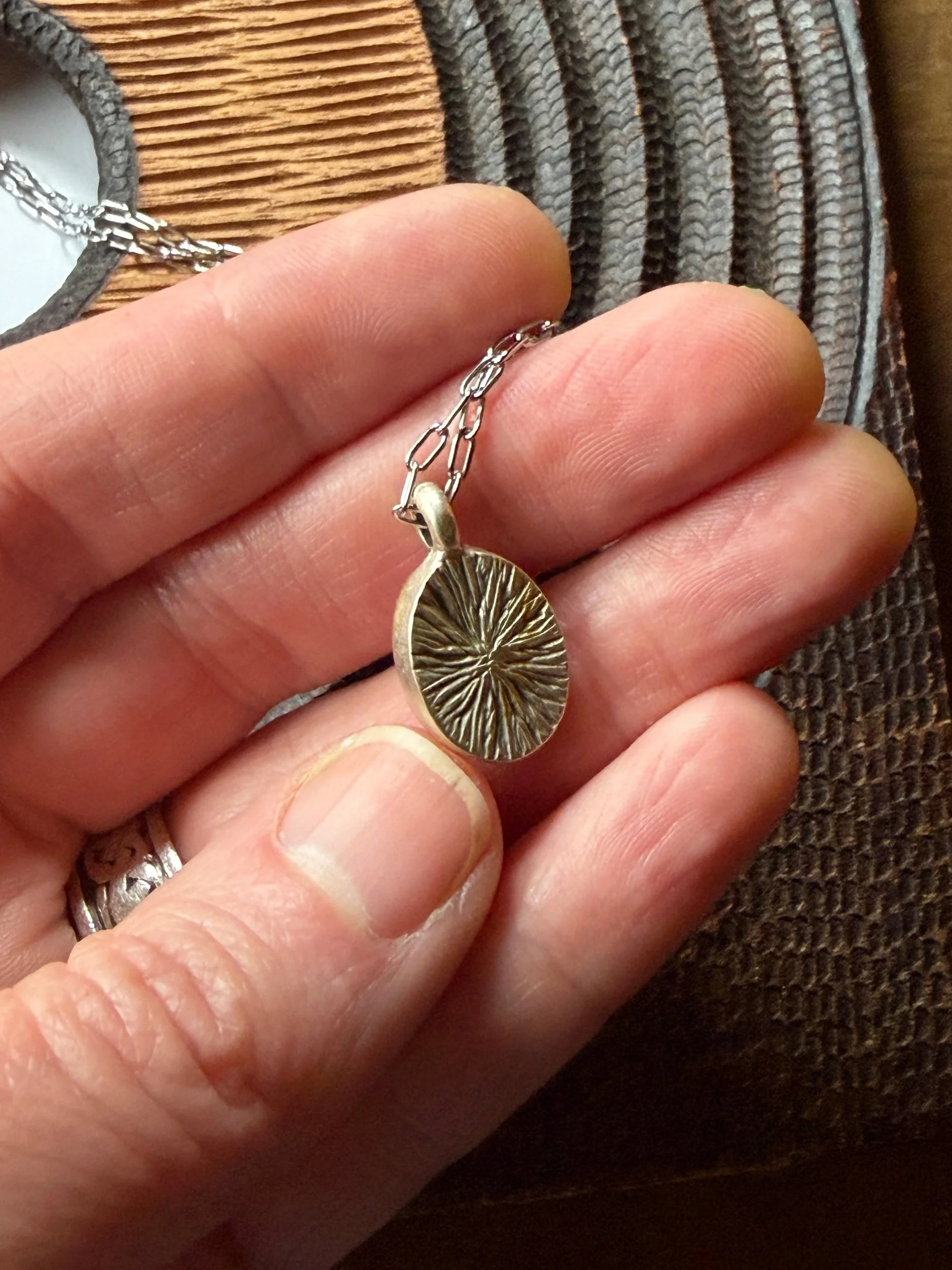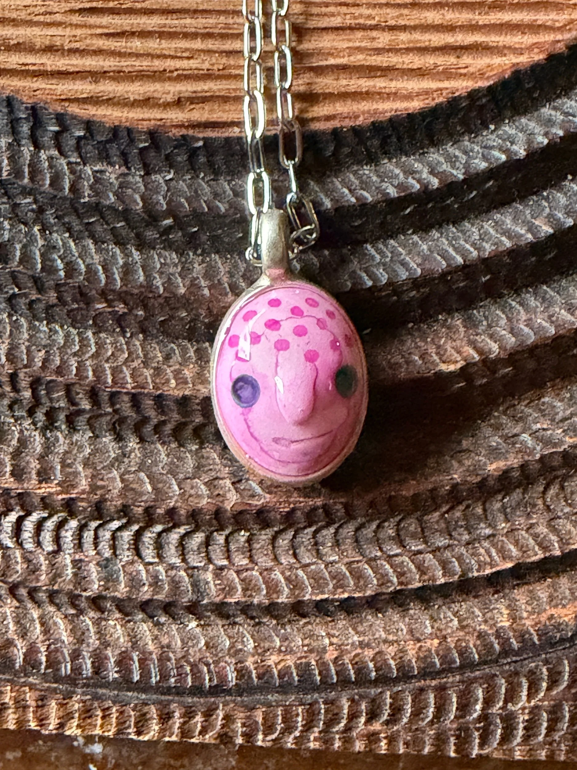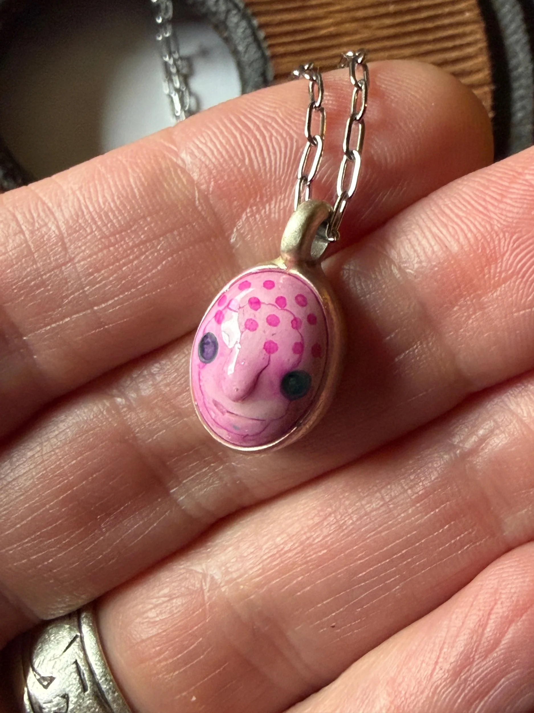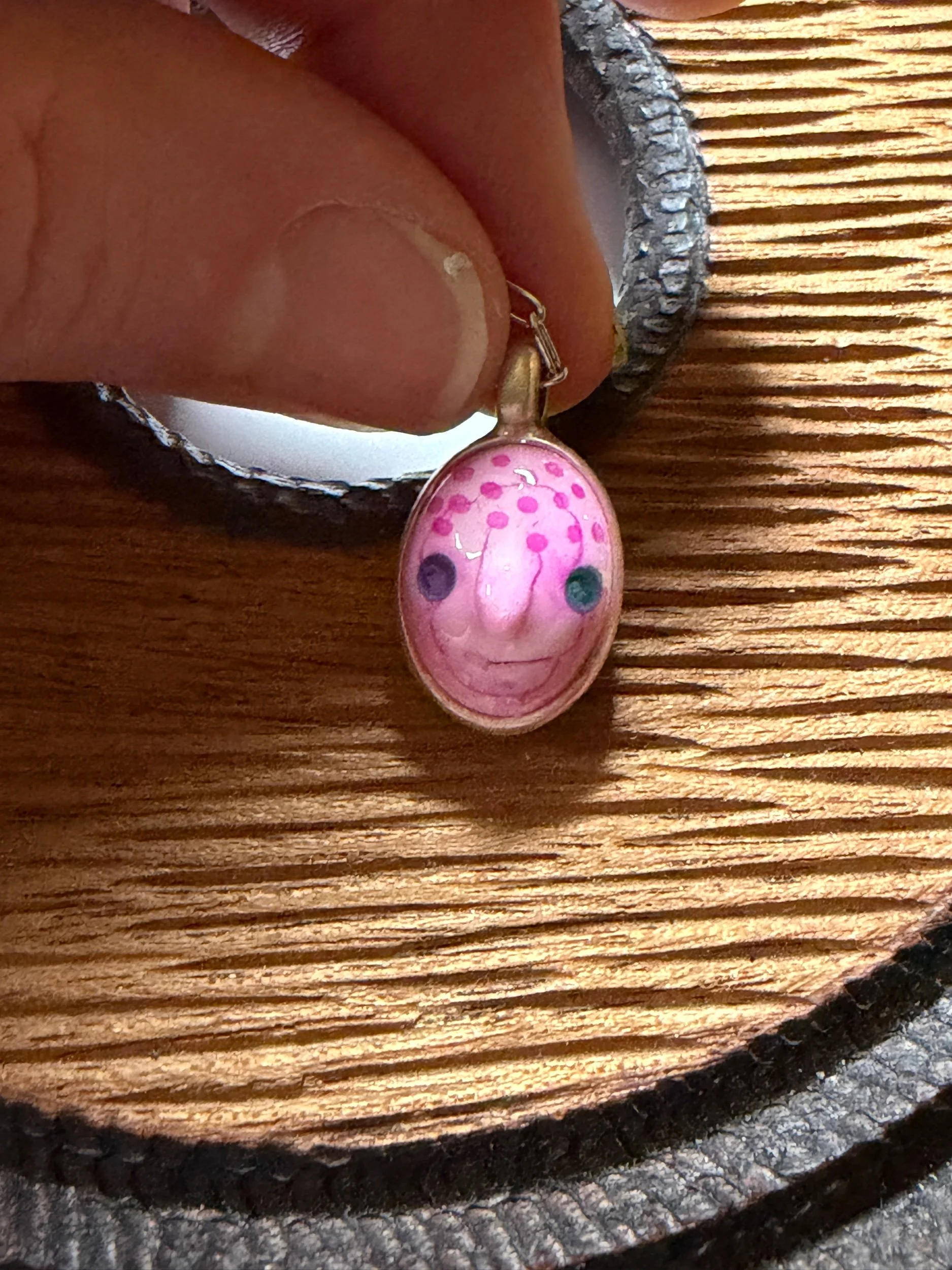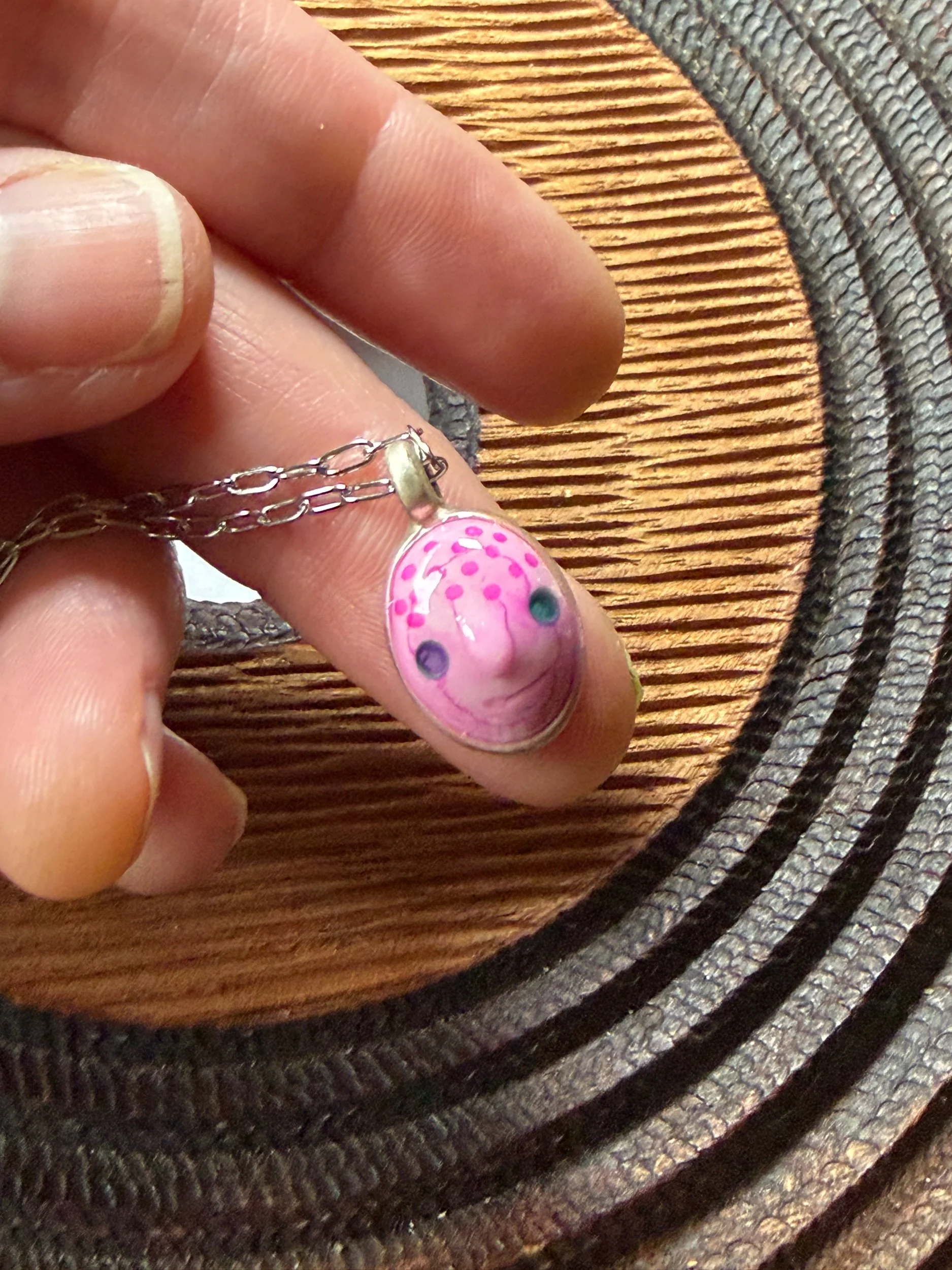 Comfortable to wear this tiny beauty is about 8mm by 5mm. The size is perfect to layer with other necklaces or to wear alone! It is sculpted from polymer clay, hand painted and then coated with several clear resin topcoats. The metal parts are not made by us but were lovingly chosen for their imperfect, rustic beauty! (All of our pieces are one of a kind and may be imperfectly perfect.)
