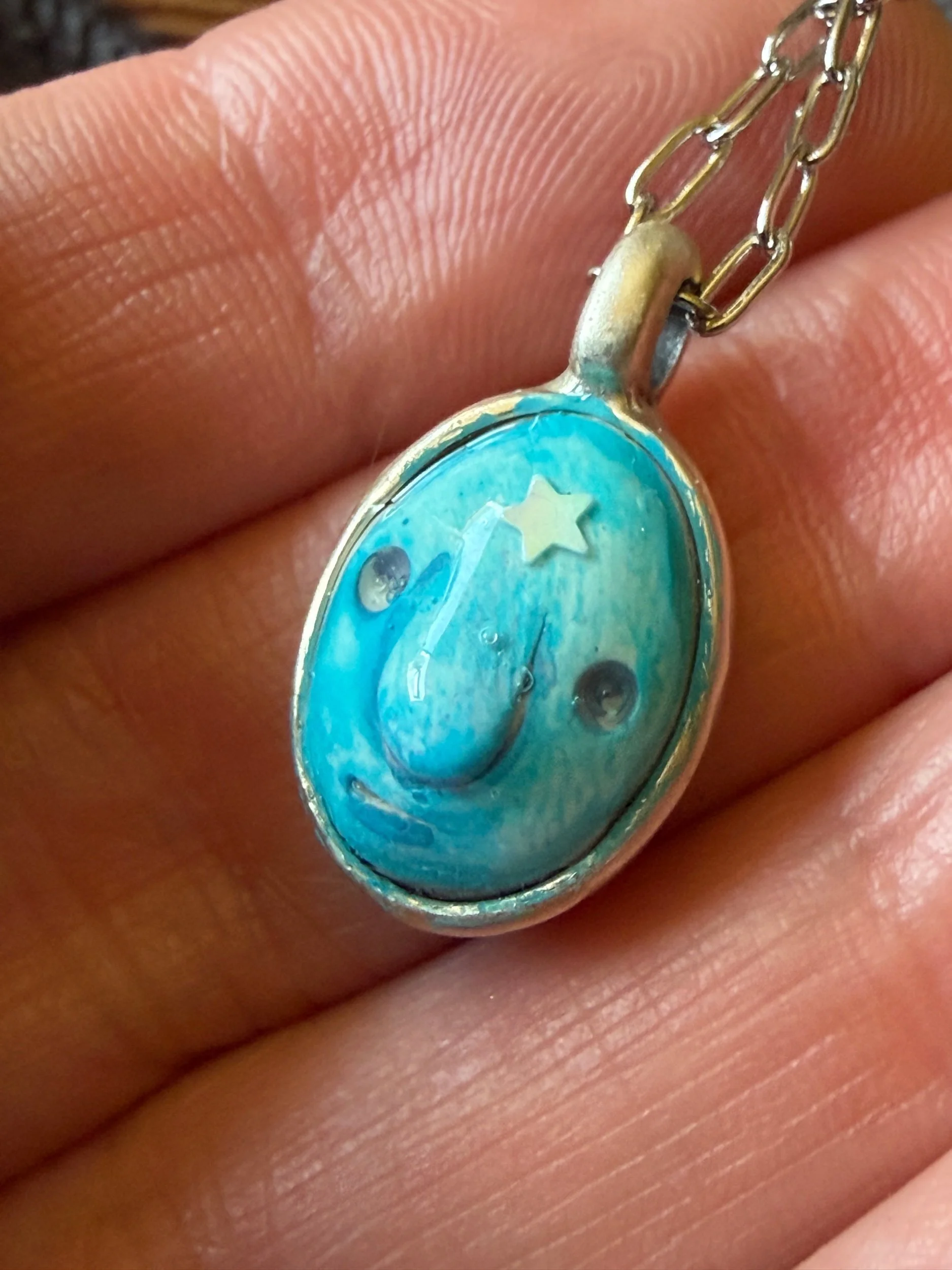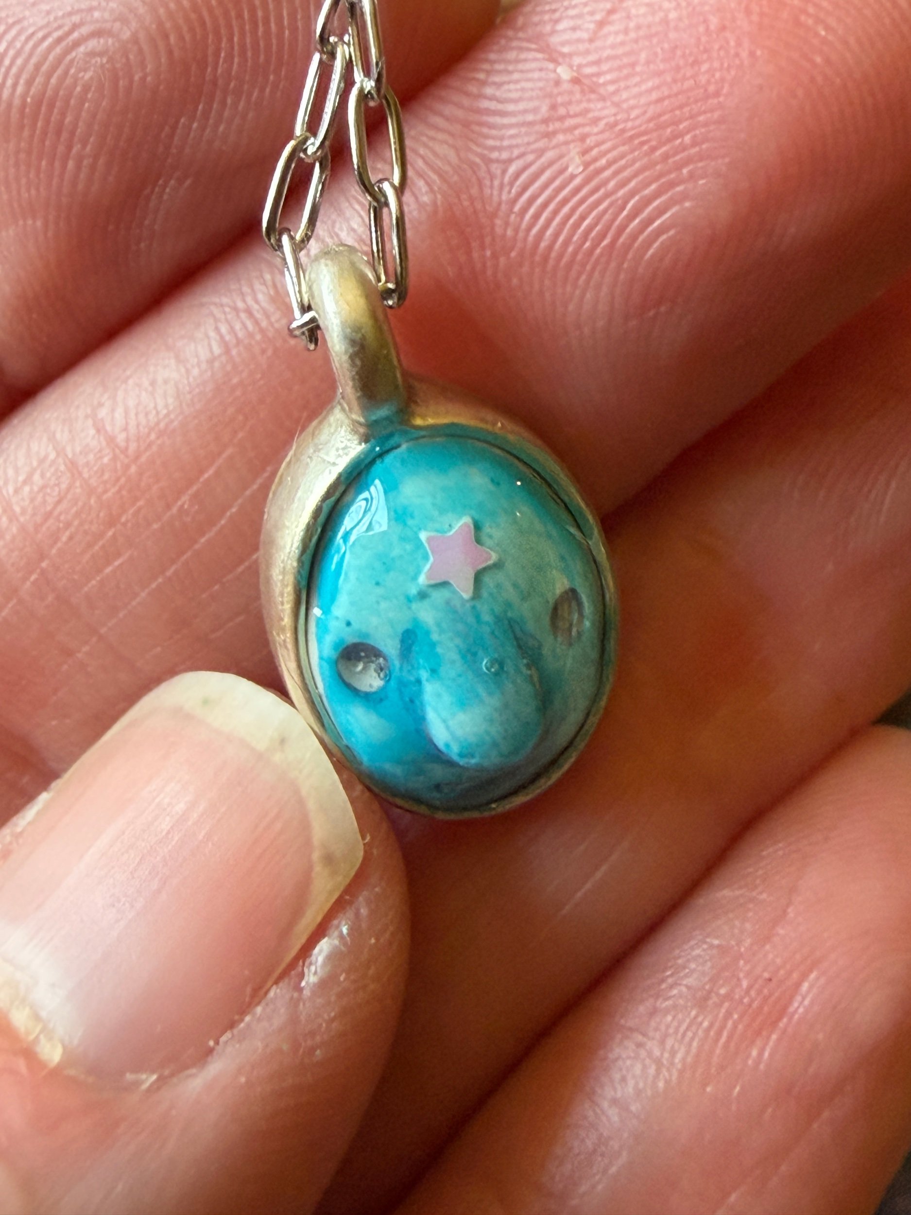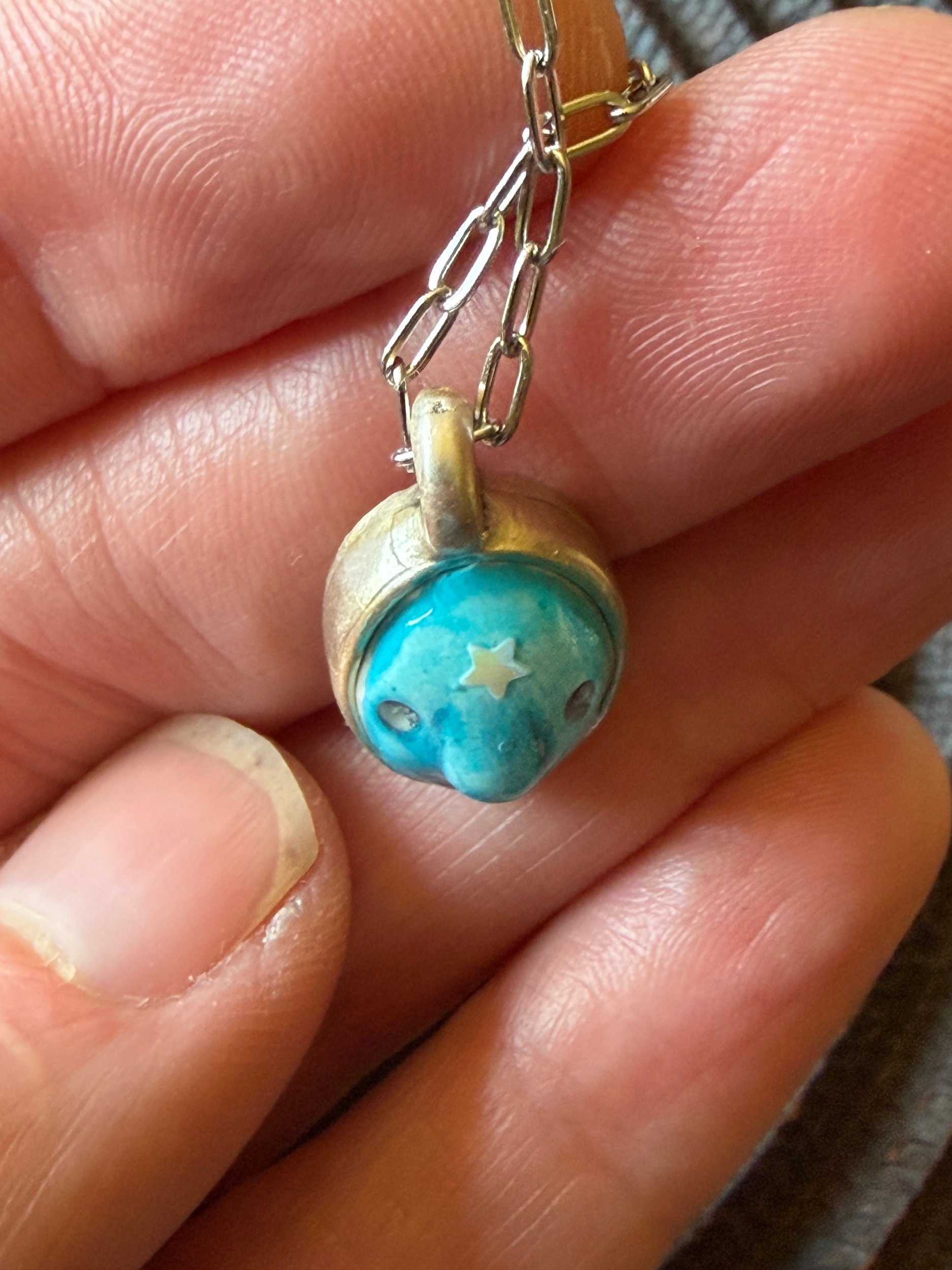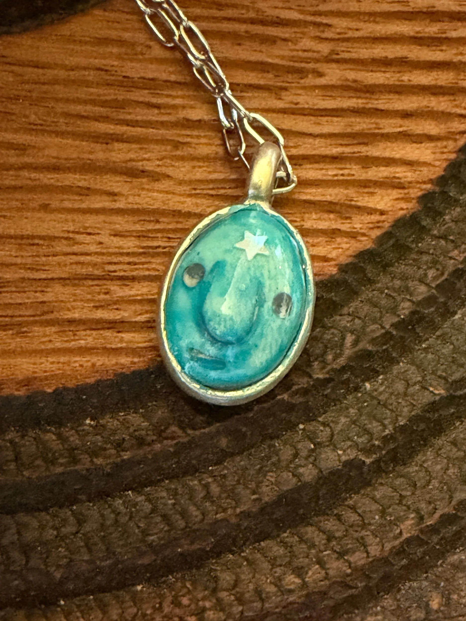 Comfortable to wear this tiny beauty is about 8mm by 5mm. The size is perfect to layer with other necklaces or to wear alone! It is sculpted from polymer clay, hand painted and then coated with several clear resin topcoats. The metal parts are not made by us but were lovingly chosen for their imperfect, rustic beauty! (All of our pieces are one of a kind and may be imperfectly perfect.)