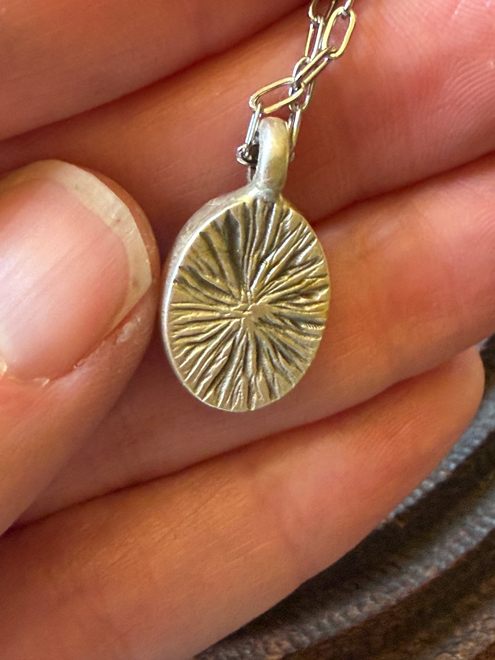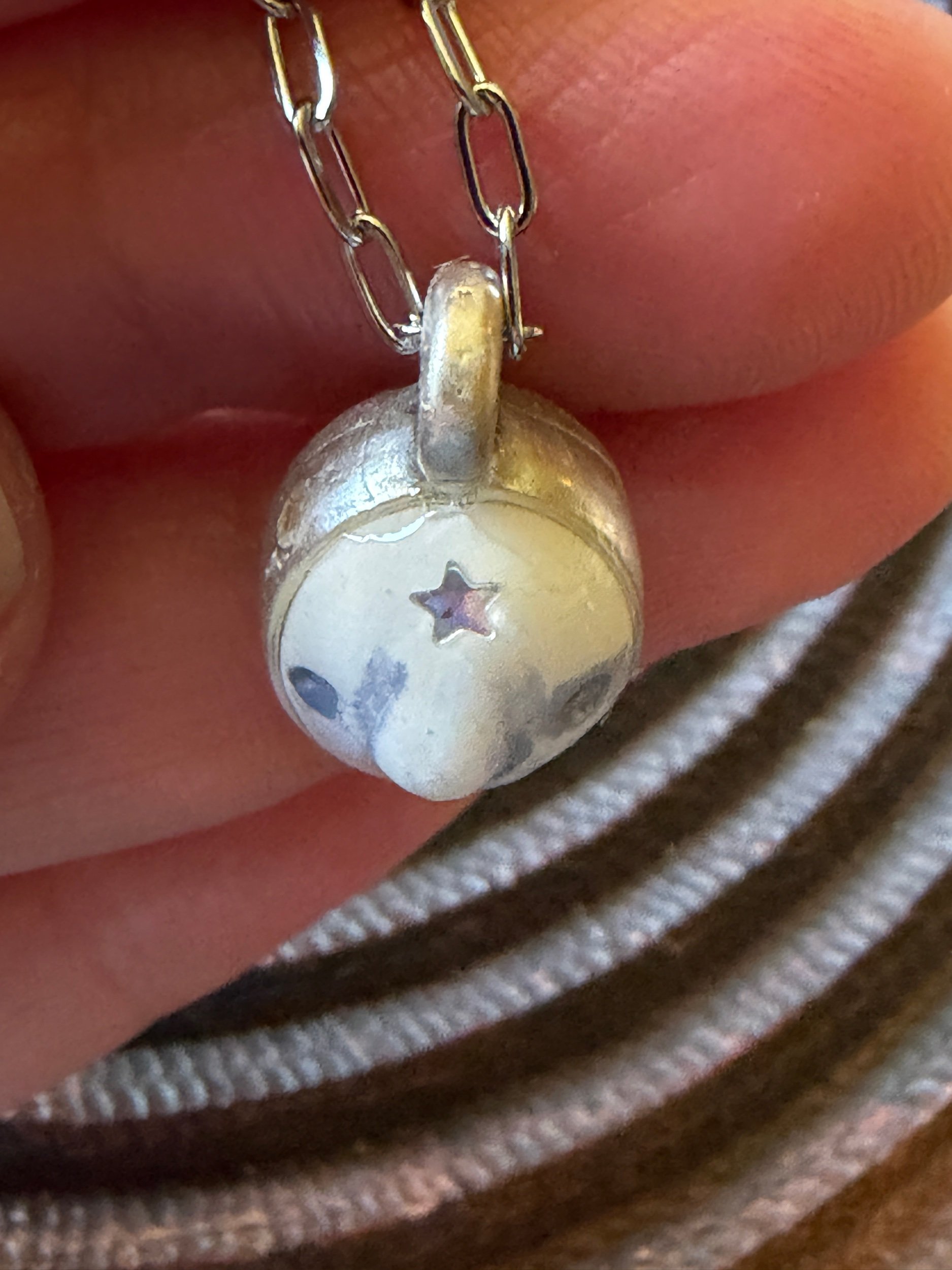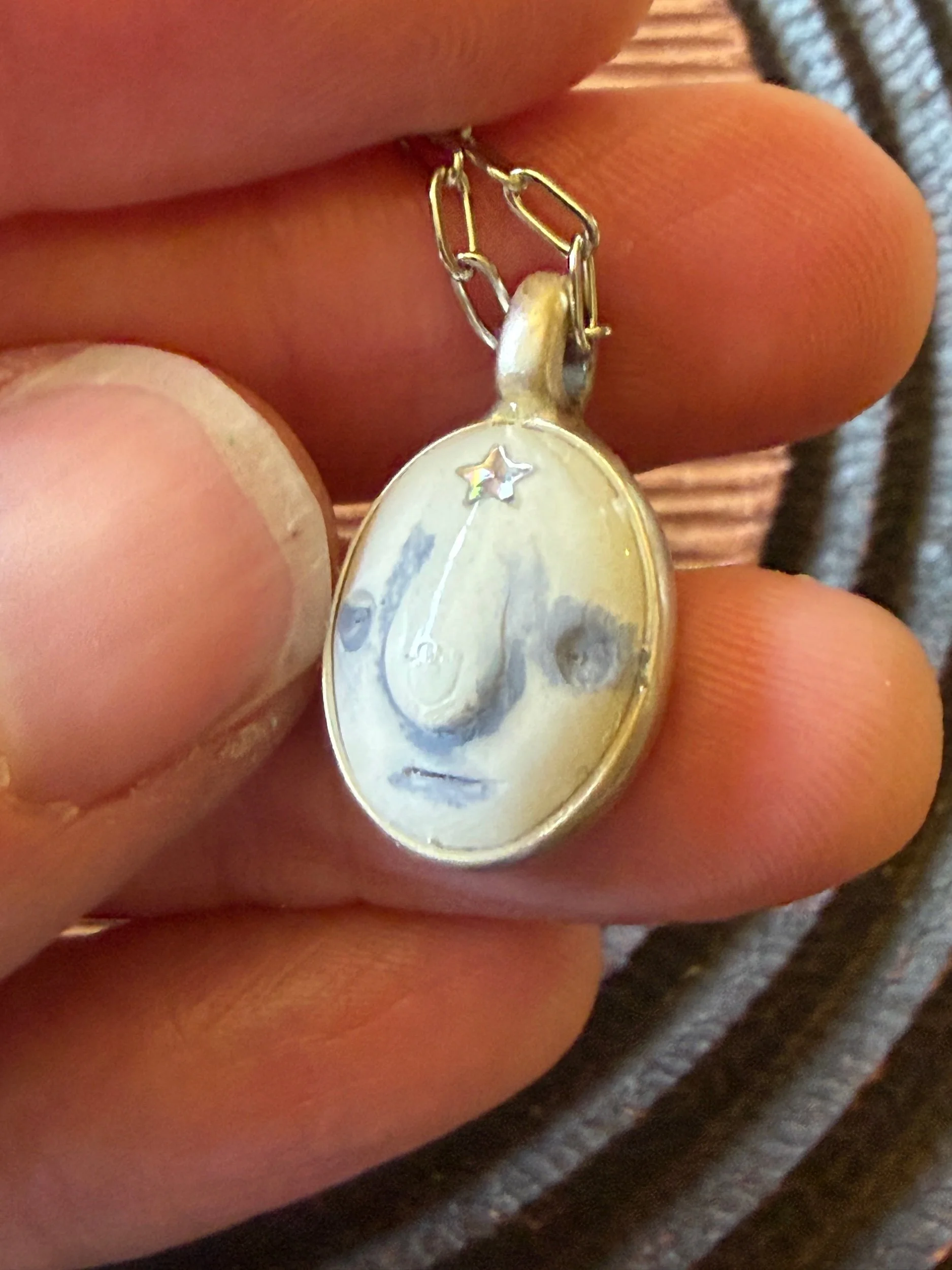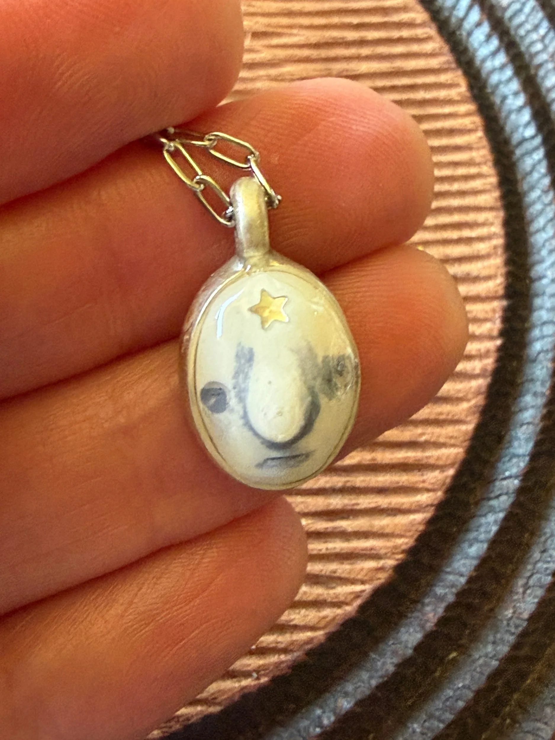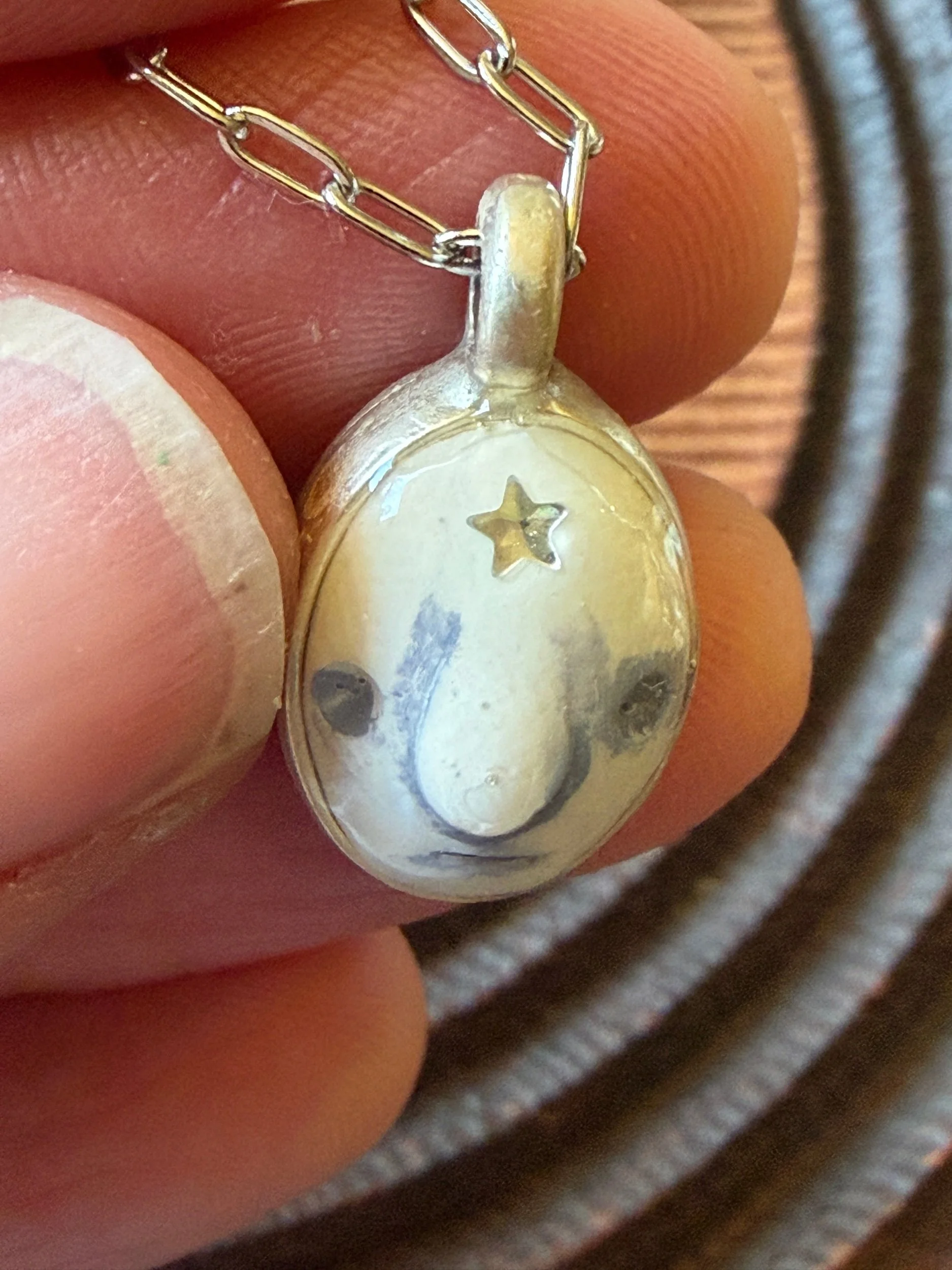 Comfortable to wear this tiny beauty is about 8mm by 5mm. The size is perfect to layer with other necklaces or to wear alone! It is sculpted from polymer clay, hand painted and then coated with several clear resin topcoats. The metal parts are not made by us but were lovingly chosen for their imperfect, rustic beauty! (All of our pieces are one of a kind and may be imperfectly perfect.)
