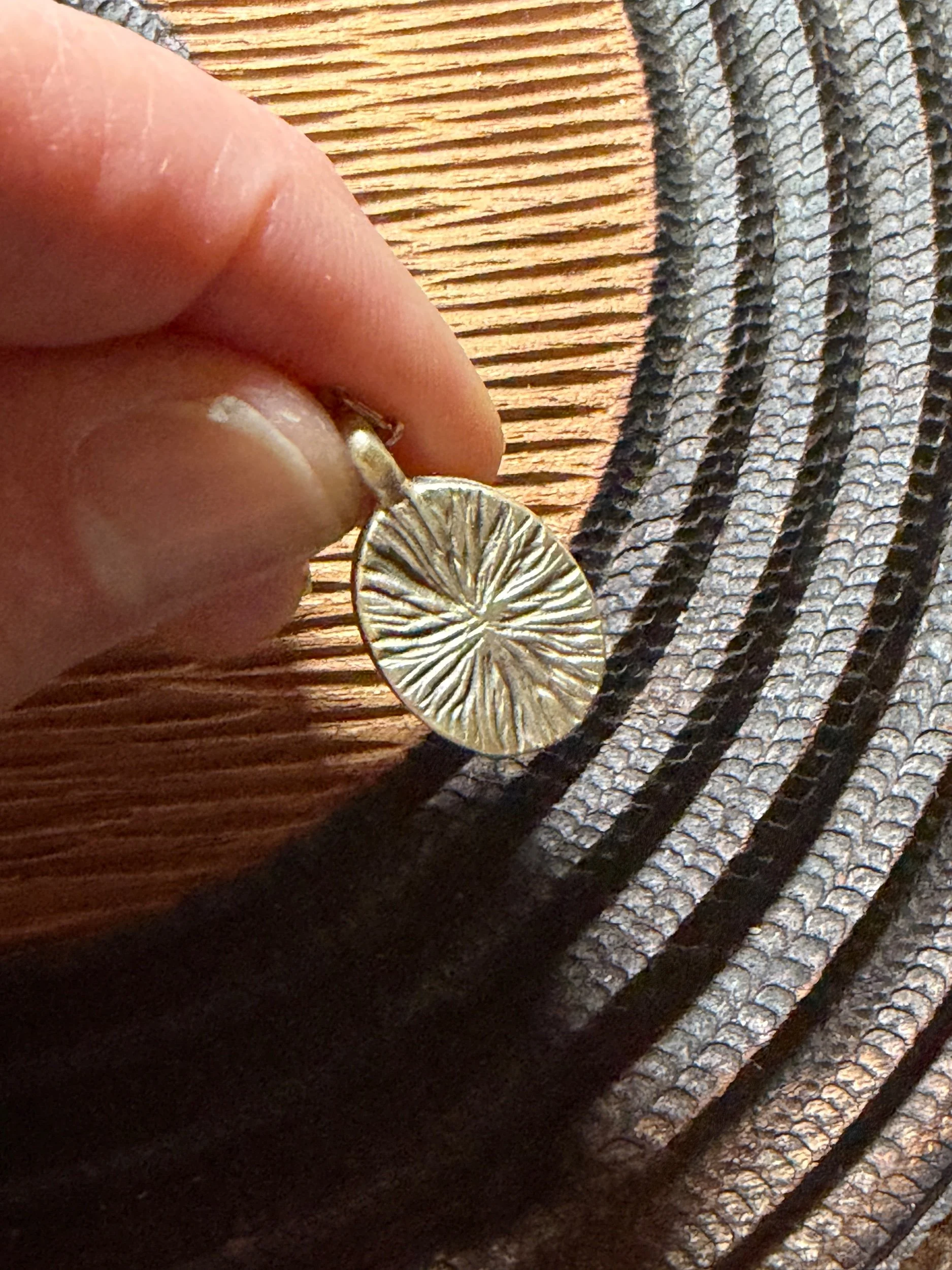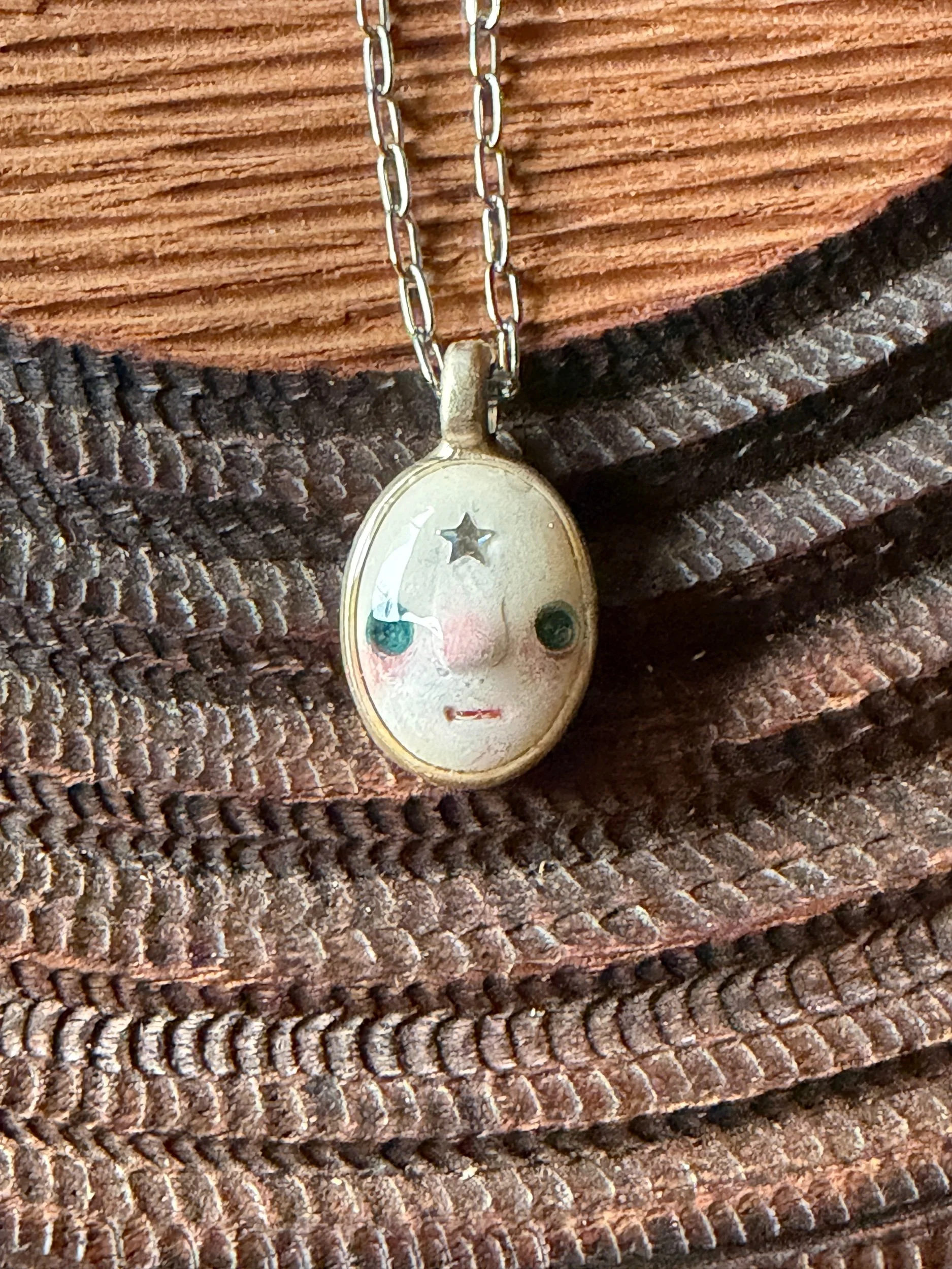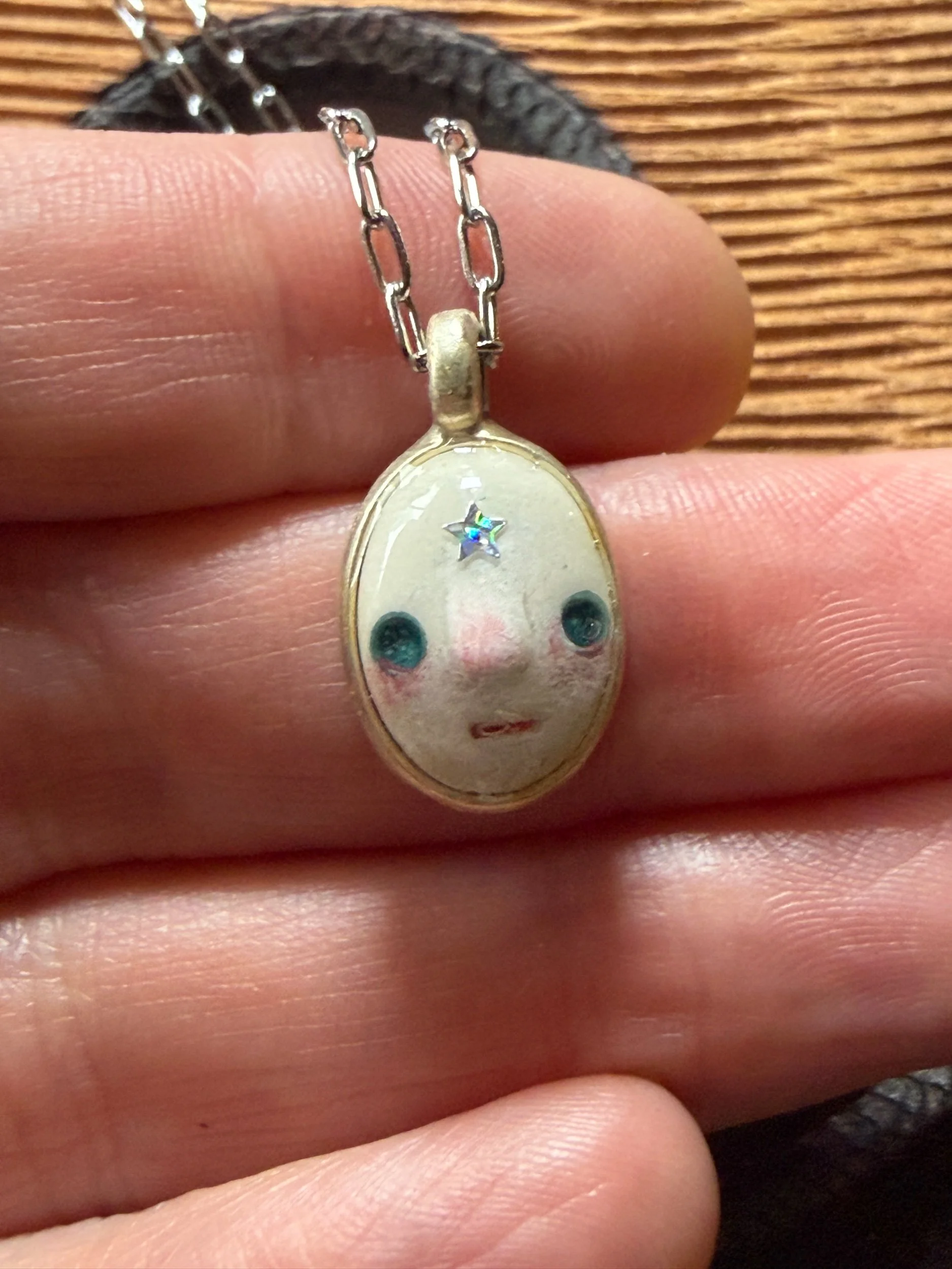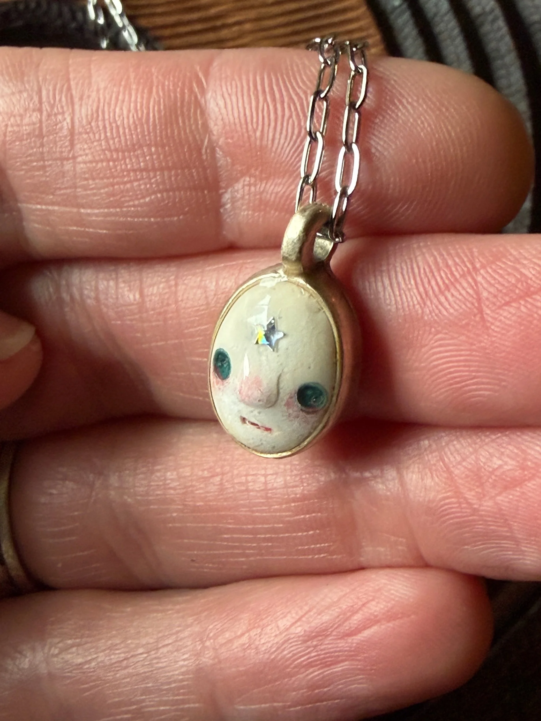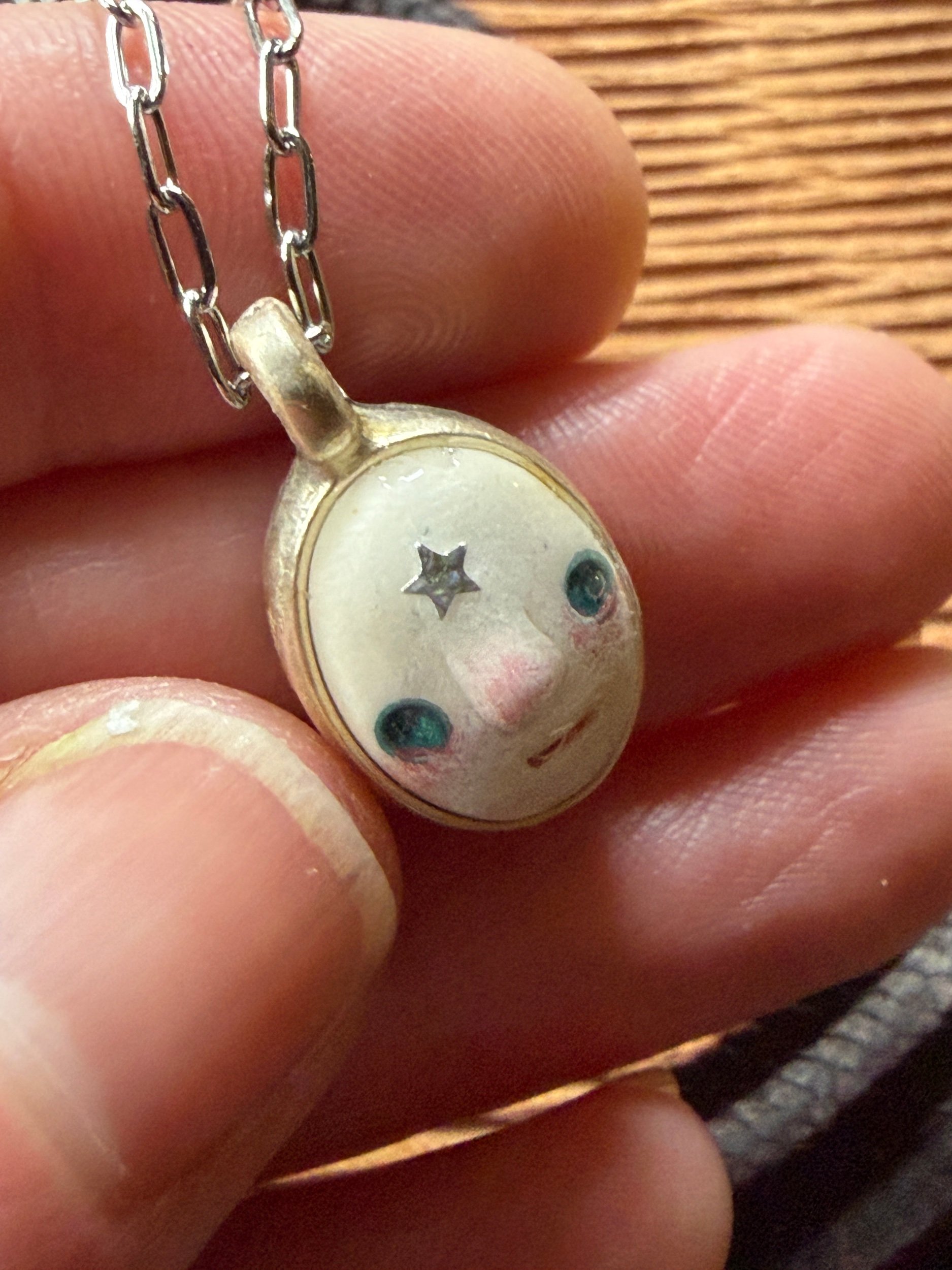 Comfortable to wear this tiny beauty is about 8mm by 5mm. The size is perfect to layer with other necklaces or to wear alone! It is sculpted from polymer clay, hand painted and then coated with several clear resin topcoats. The metal parts are not made by us but were lovingly chosen for their imperfect, rustic beauty! (All of our pieces are one of a kind and may be imperfectly perfect.)