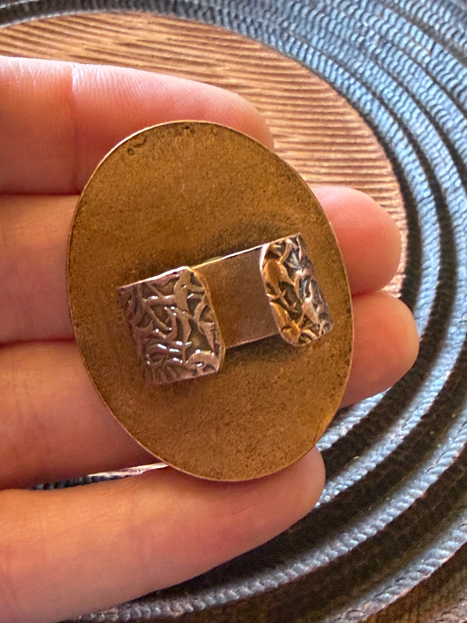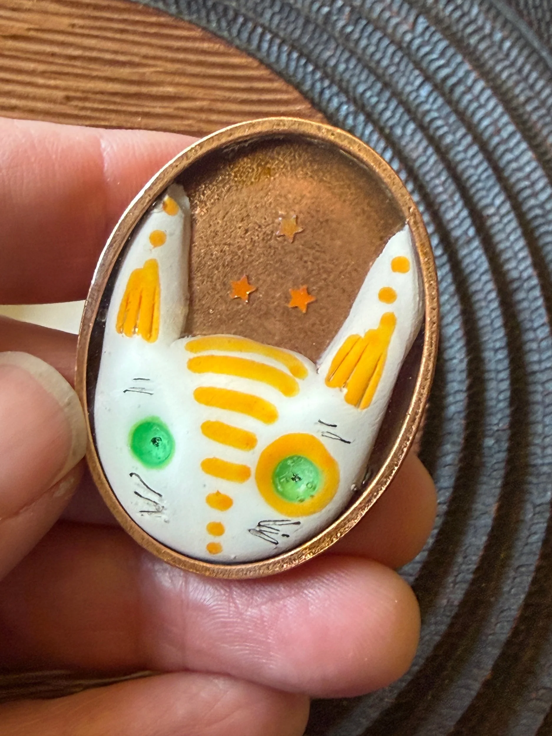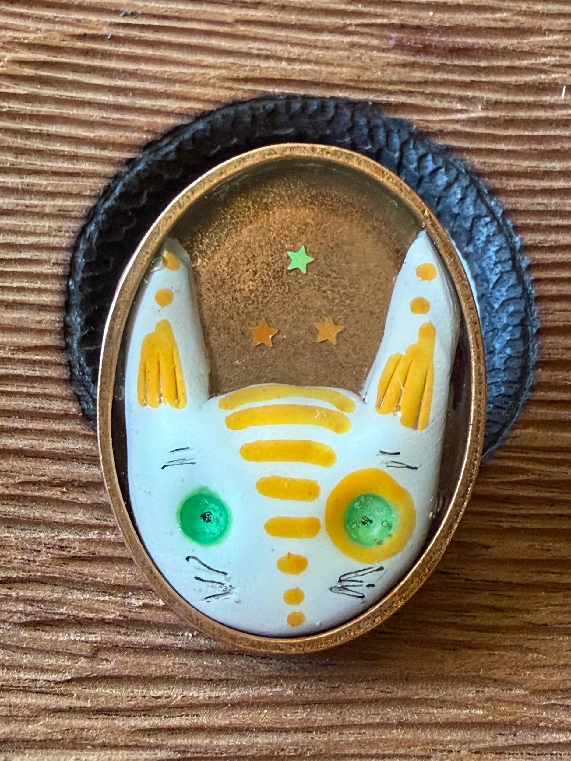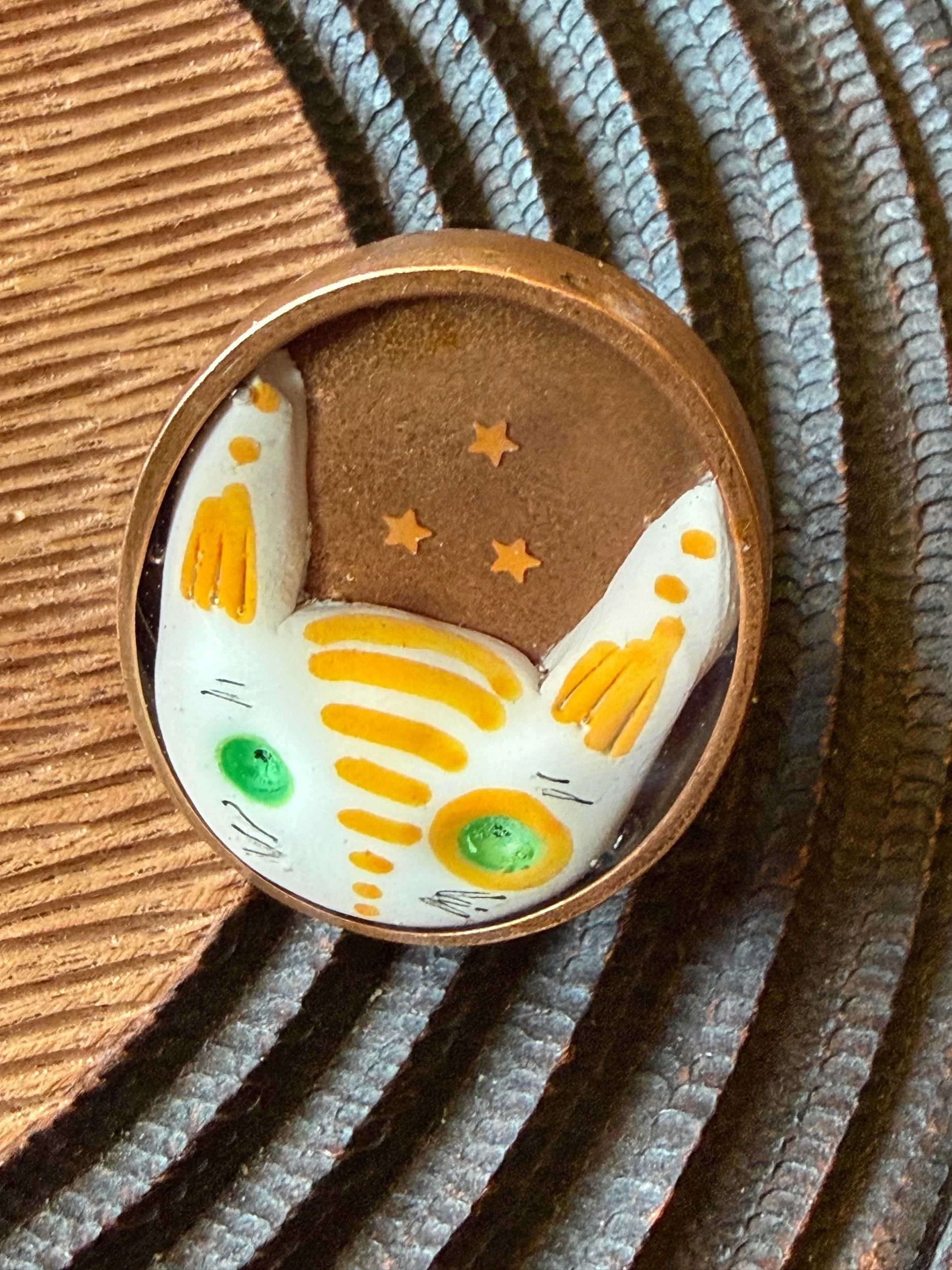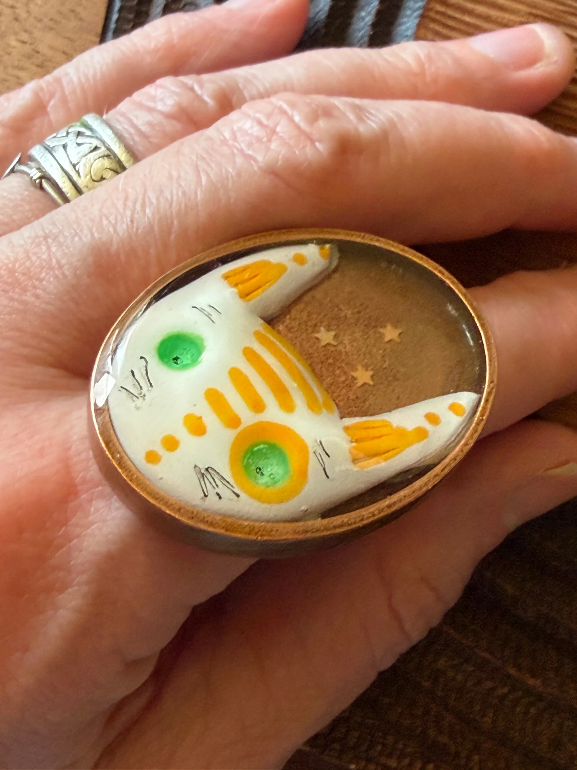 This ring is a lovingly sculpted original design. Its hand painted surface is finished in a thick clear coat of resin and set in a sturdy, adjustable, metal base (not precious metals and not made by us) for comfort and durability. Our pieces are all one of a kind and might be imperfectly perfect!