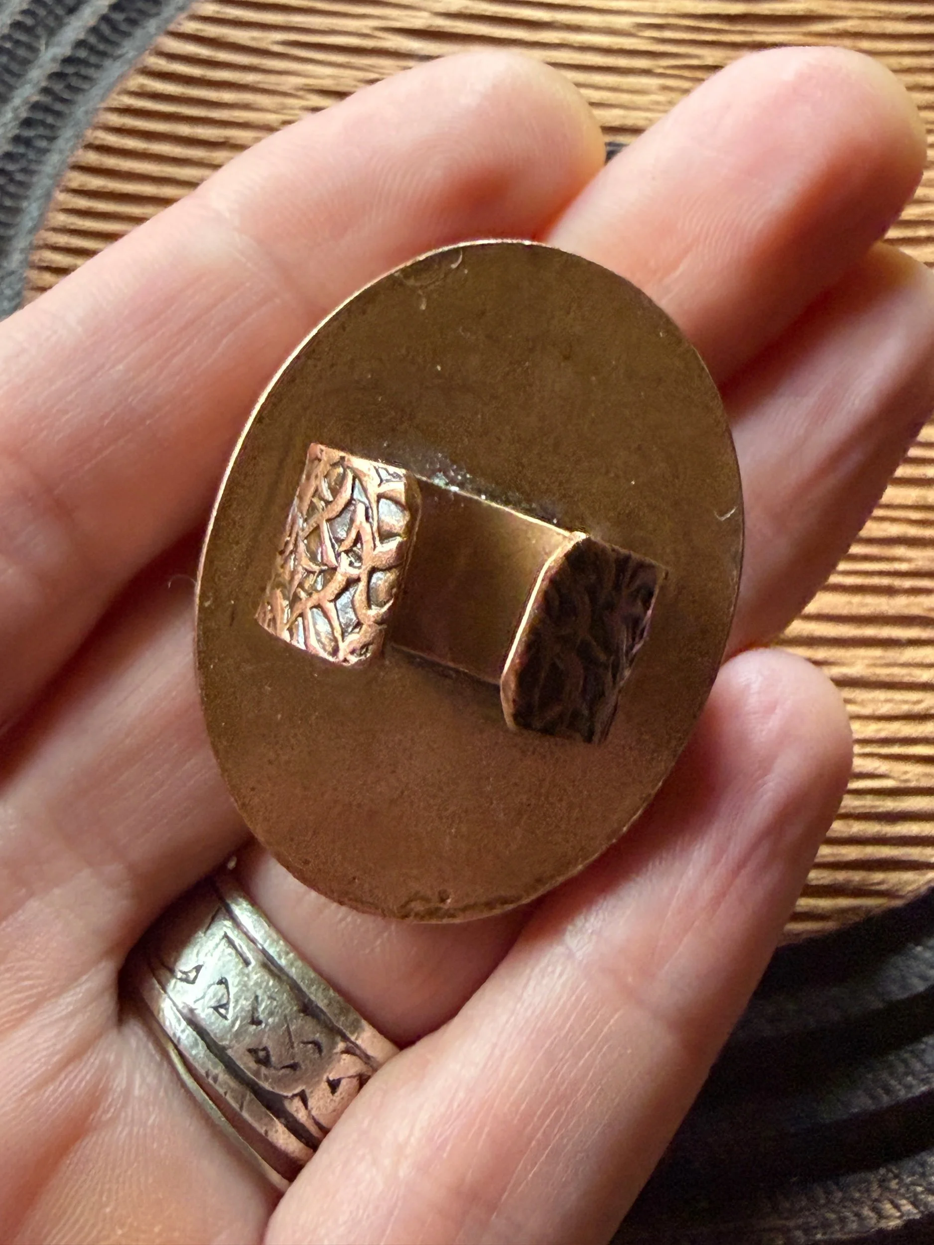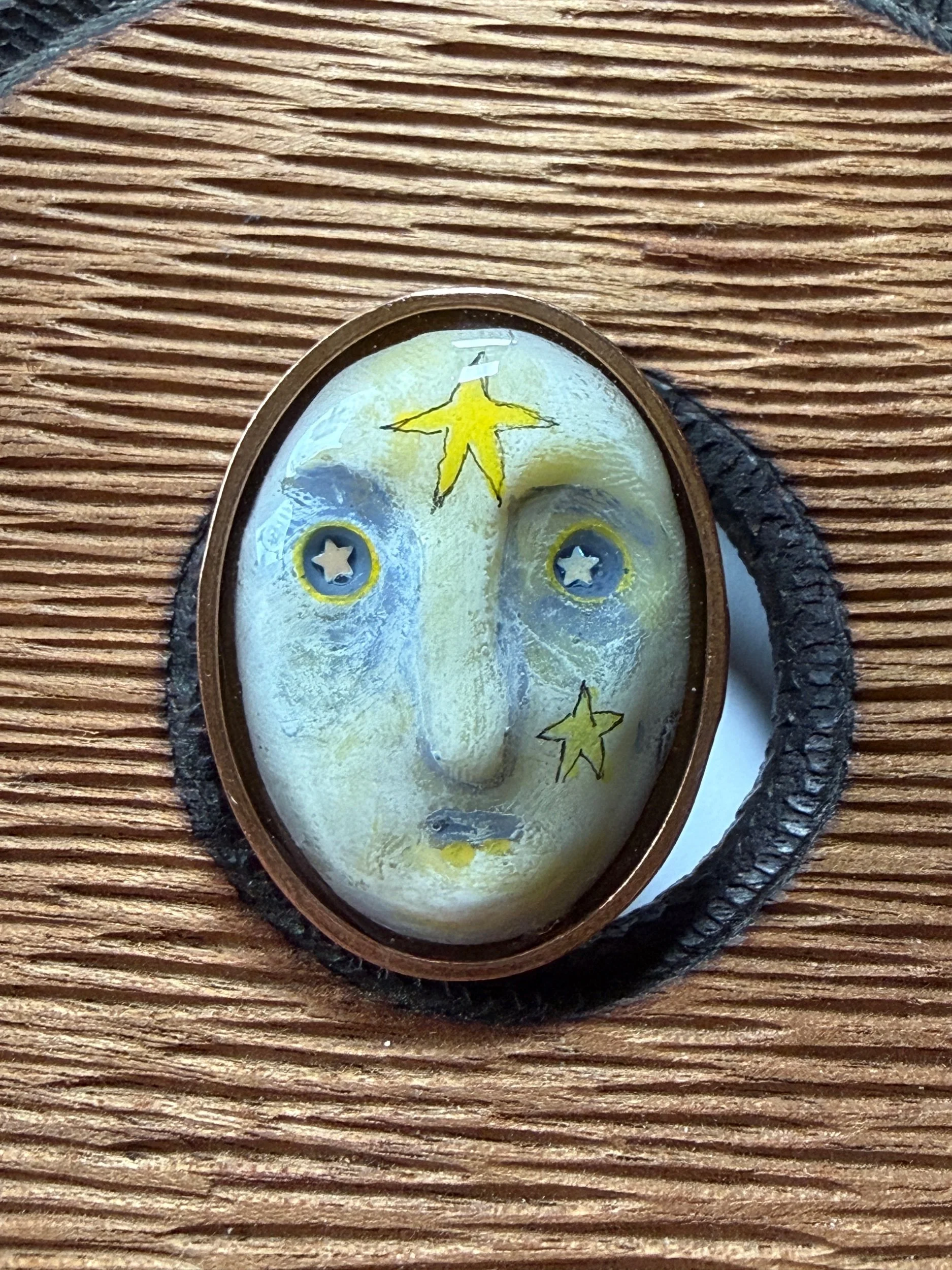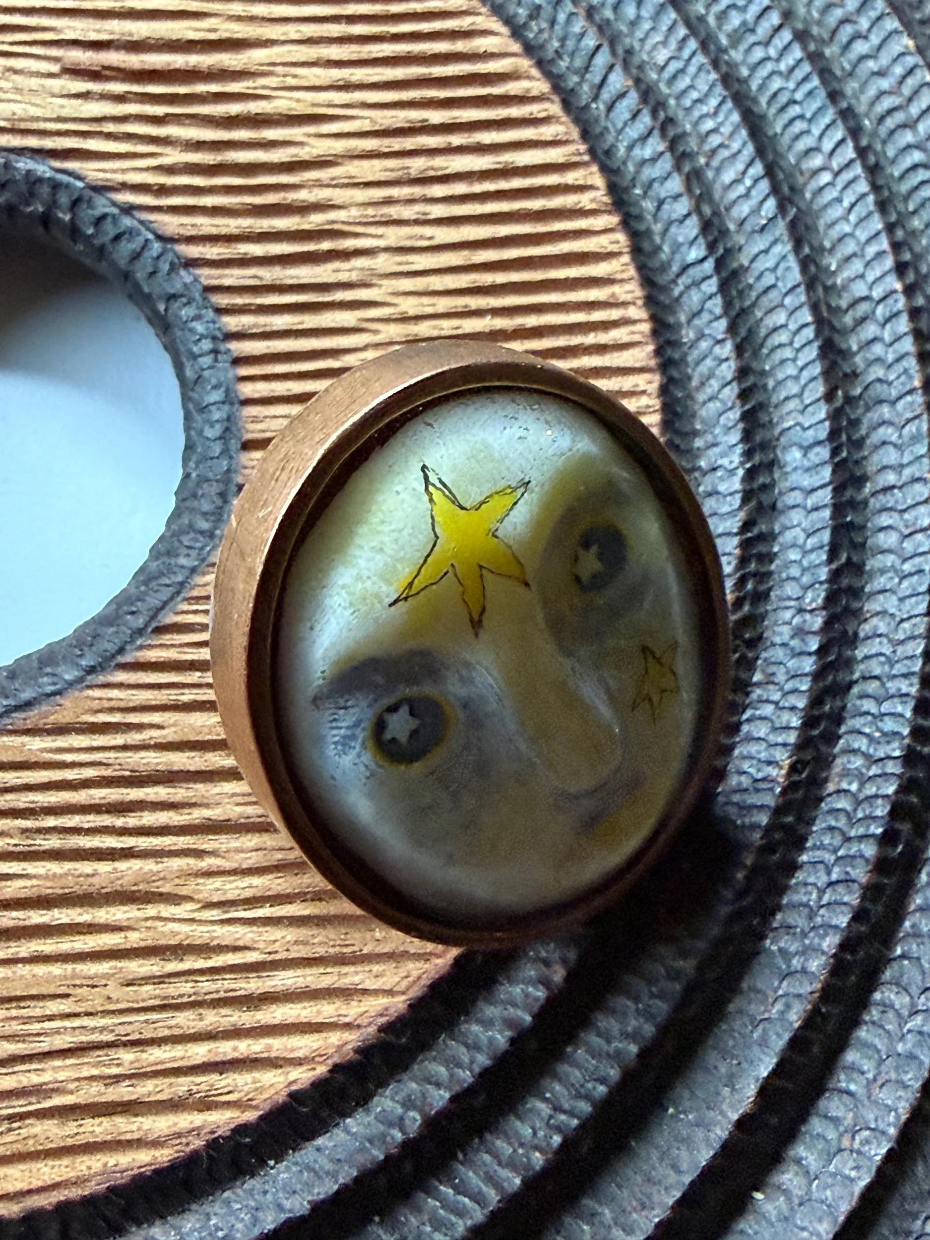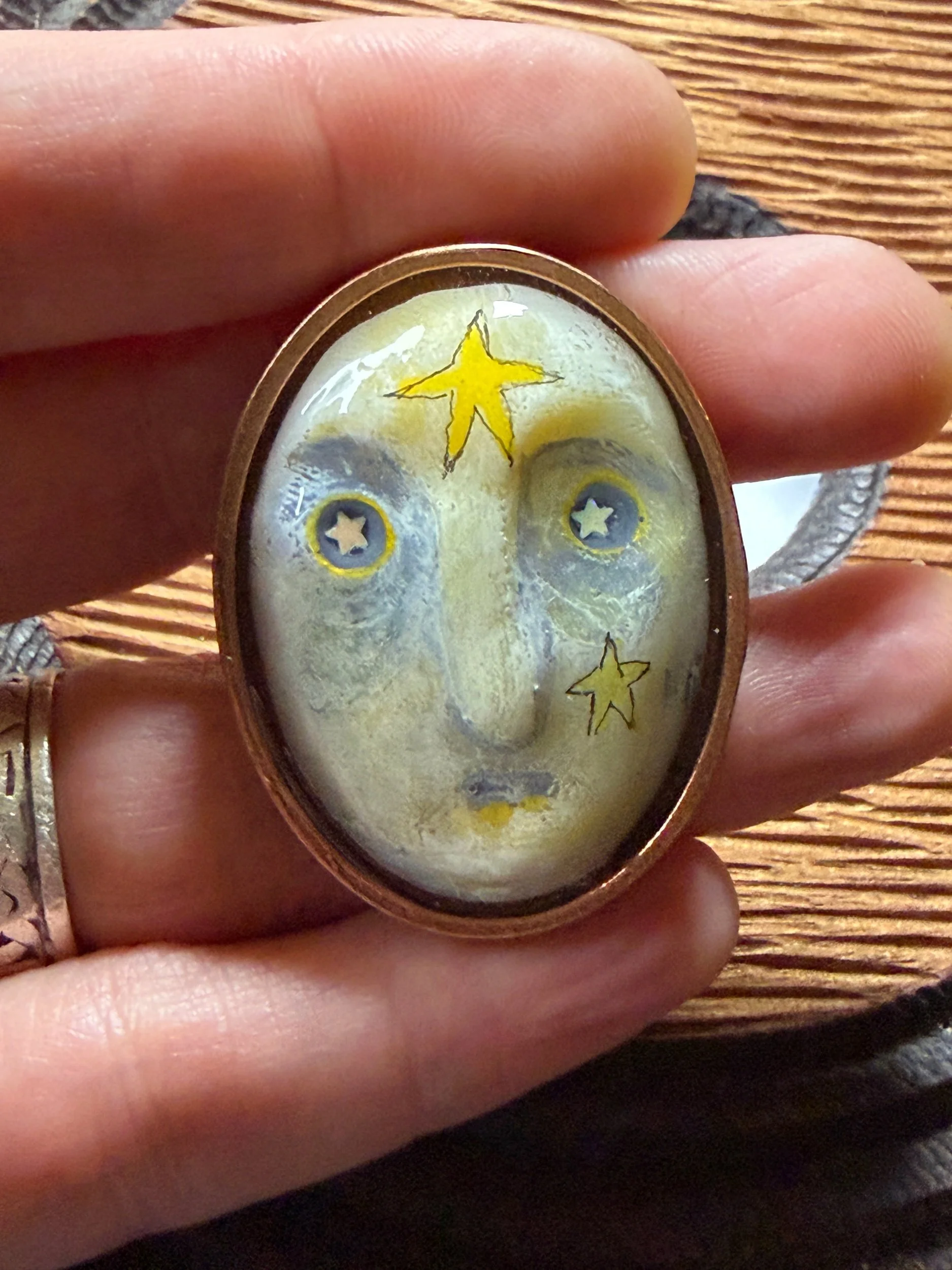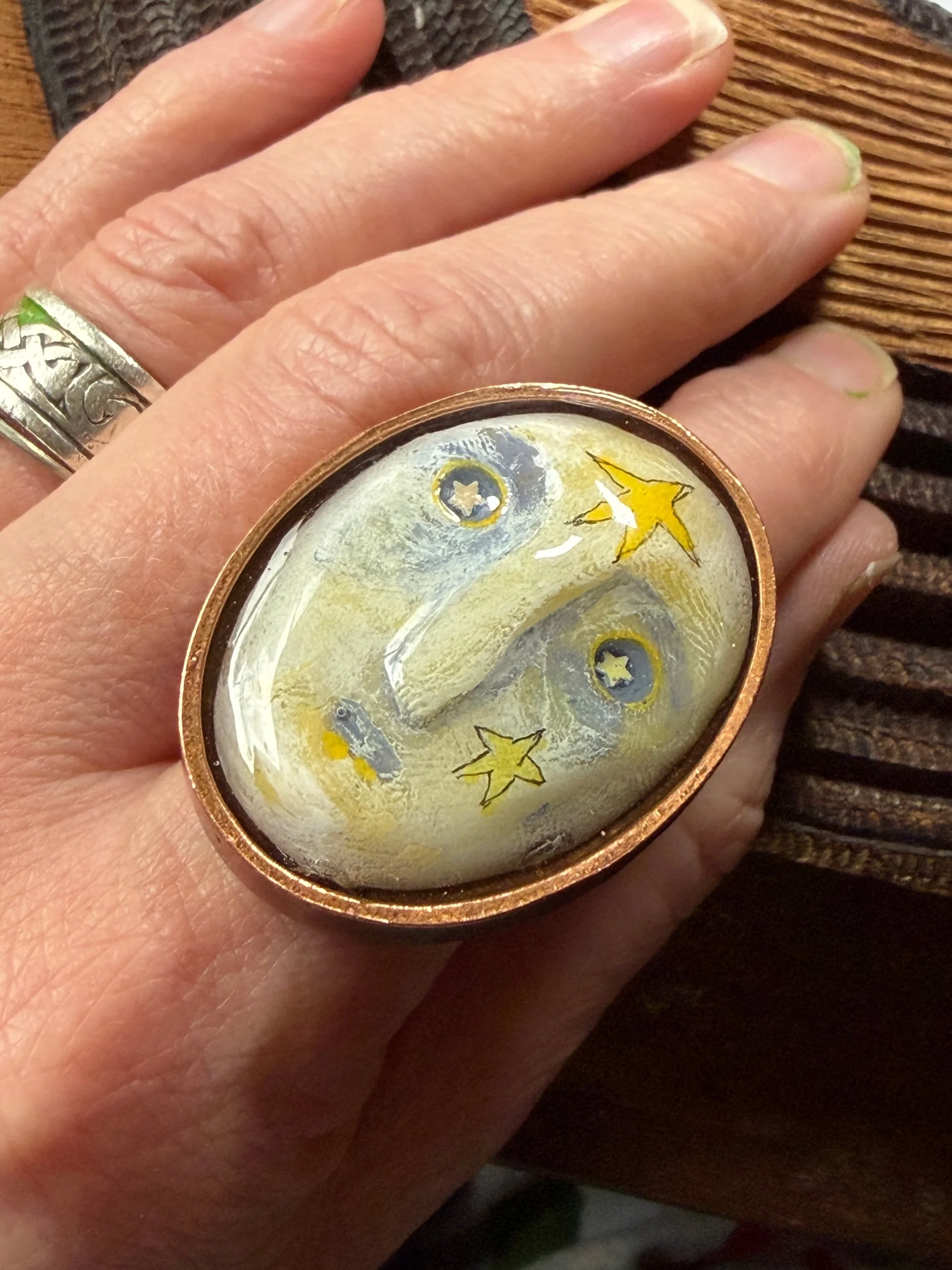 This ring is a lovingly sculpted original design, molded, cast, and poured in resin. Its hand painted surface is finished in a thick clear coat of resin and set in a sturdy, adjustable, metal base (not precious metals and not made by us) for comfort and durability. Our pieces are all one of a kind and might be imperfectly perfect!