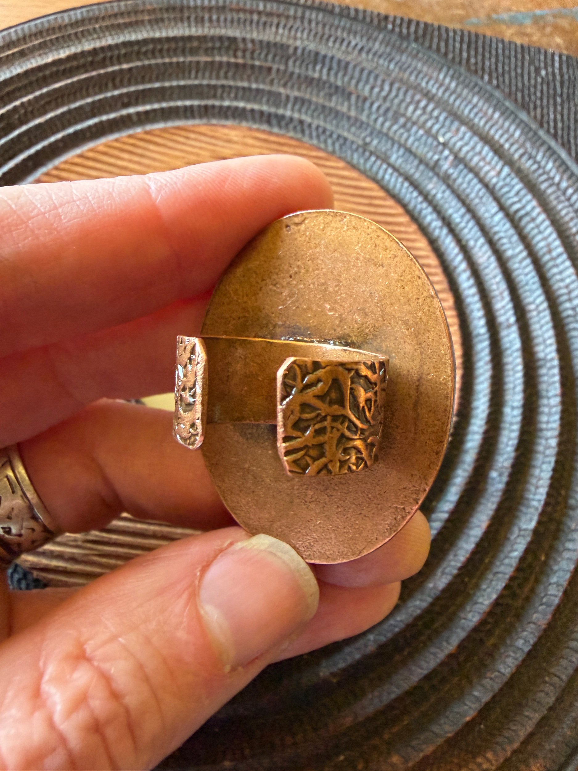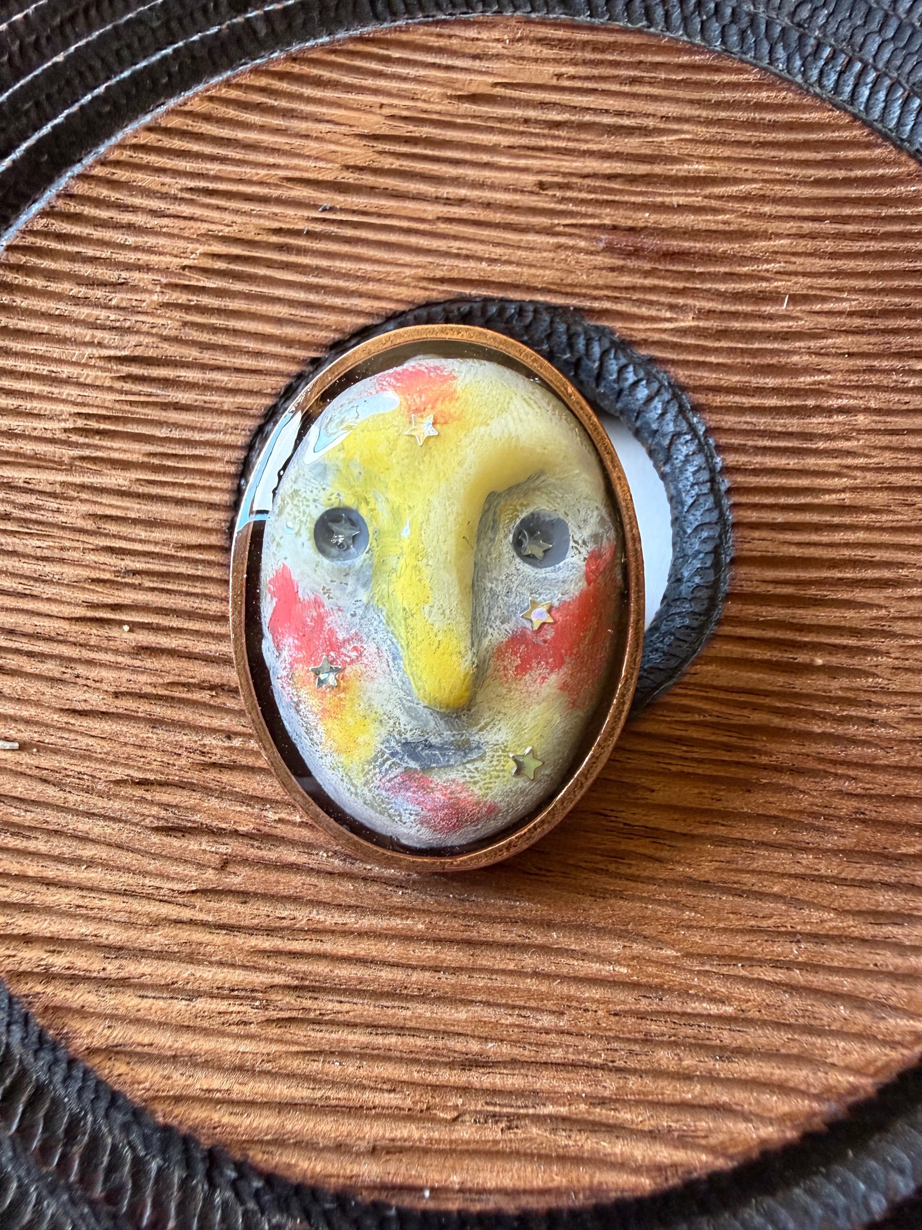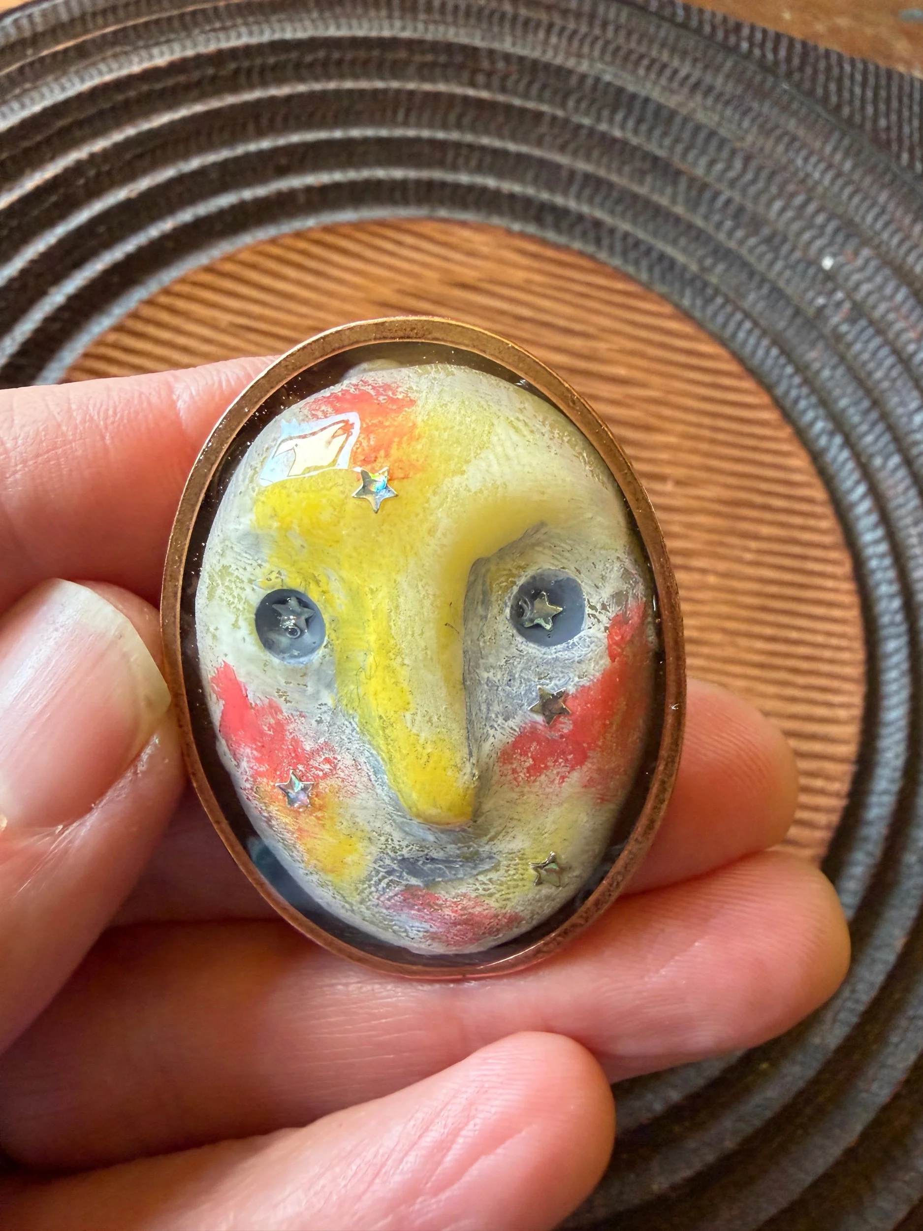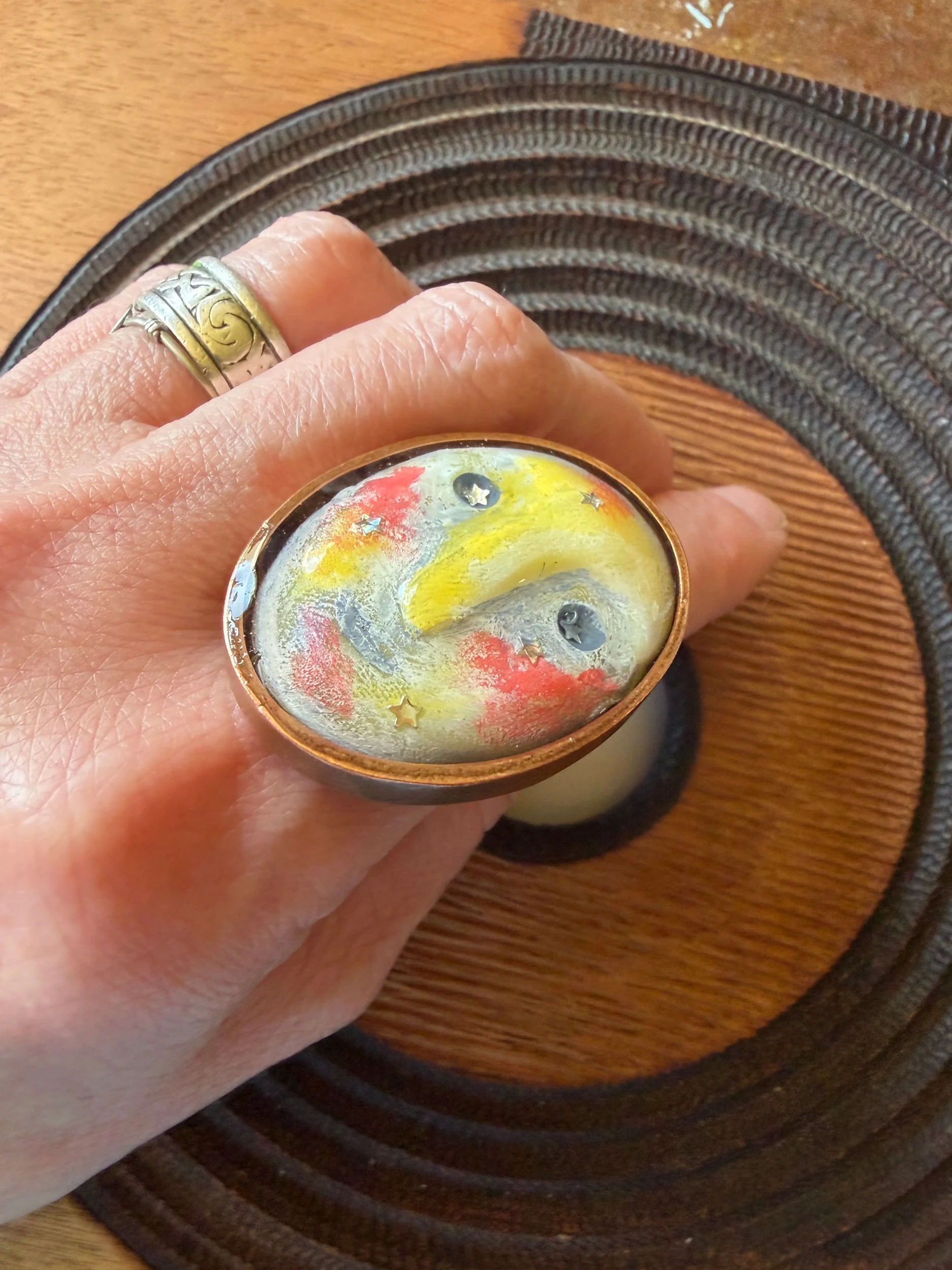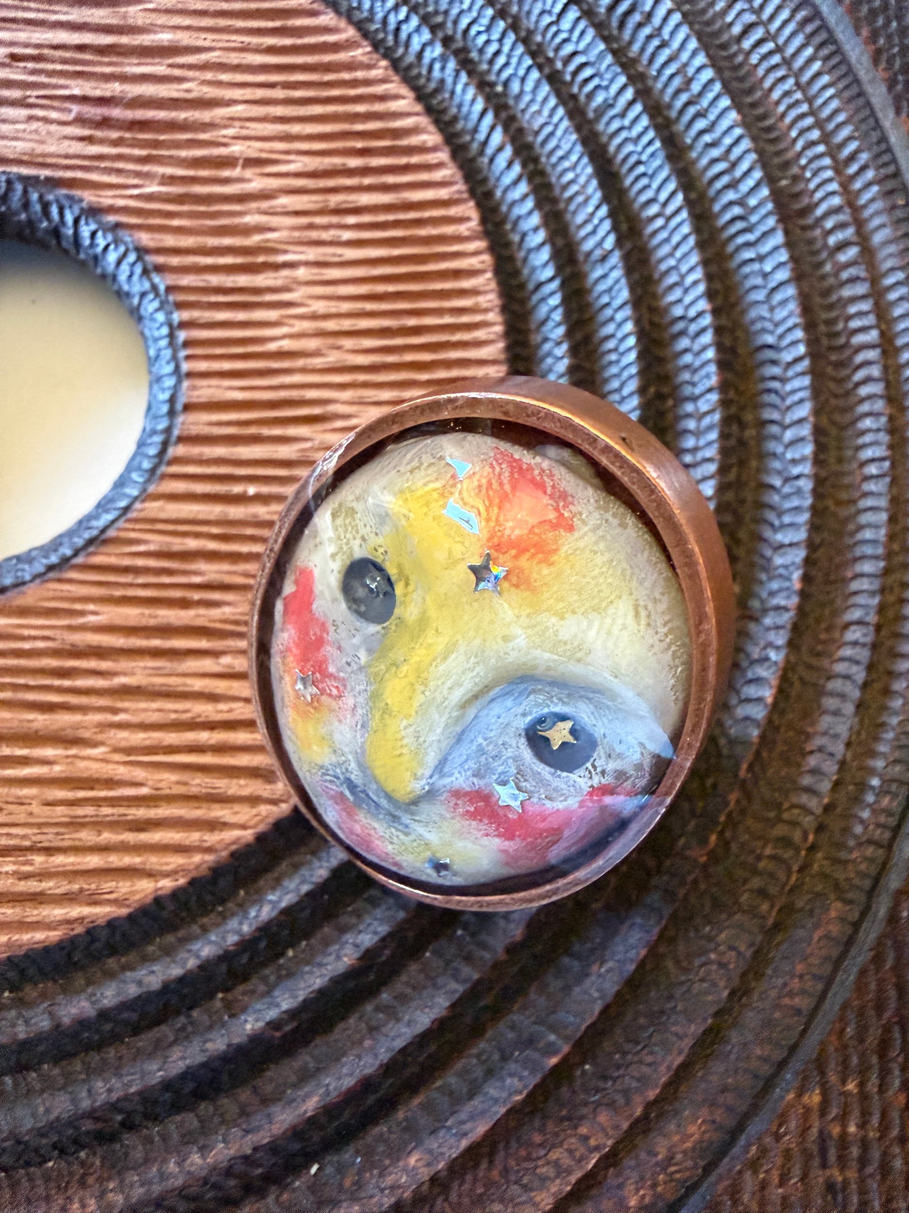This ring is a lovingly sculpted original design, molded, cast, and poured in resin. Its hand painted surface is finished in a thick clear coat of resin and set in a sturdy, adjustable, metal base (not precious metals and not made by us) for comfort and durability. Our pieces are all one of a kind and might be imperfectly perfect!