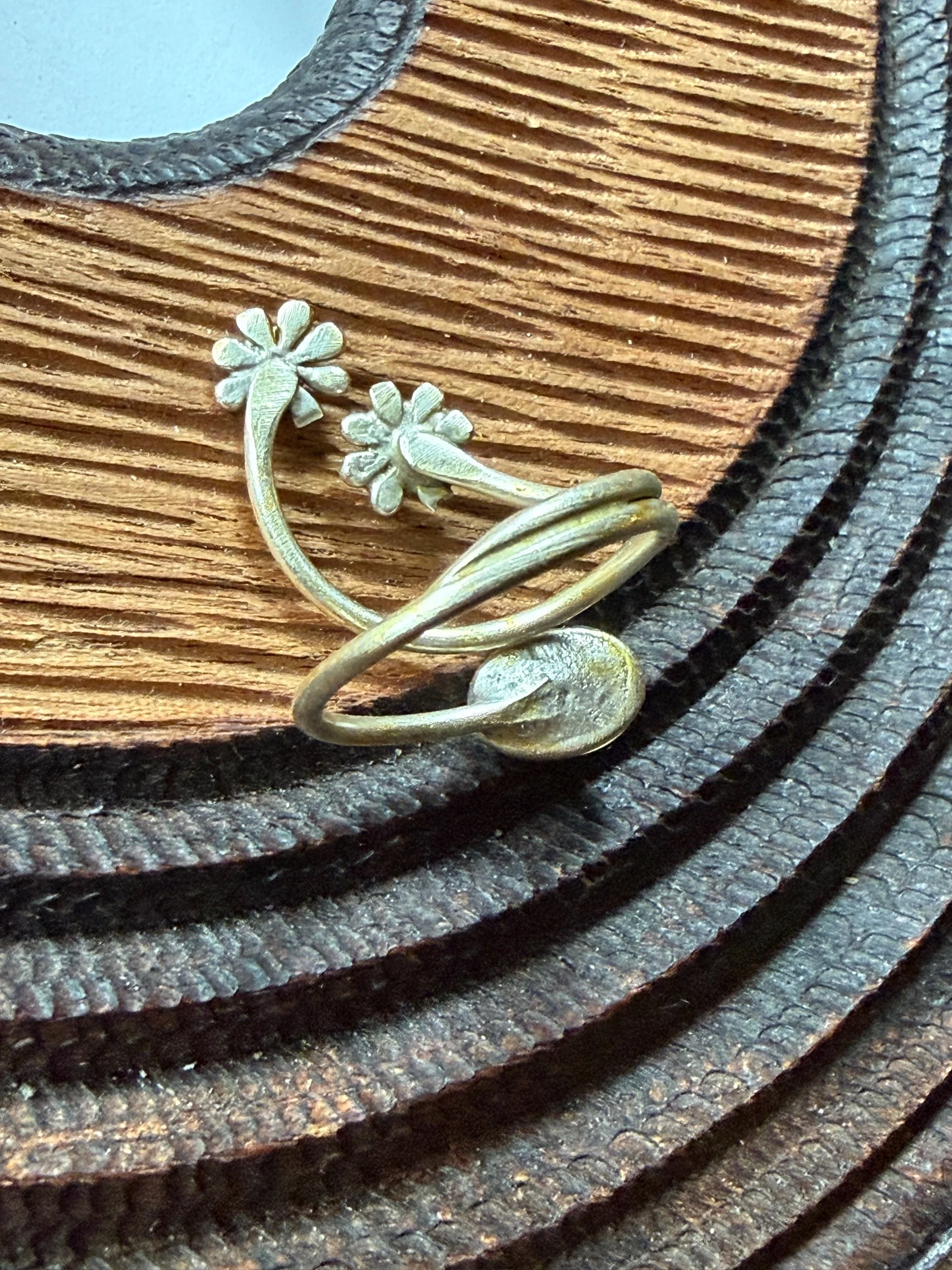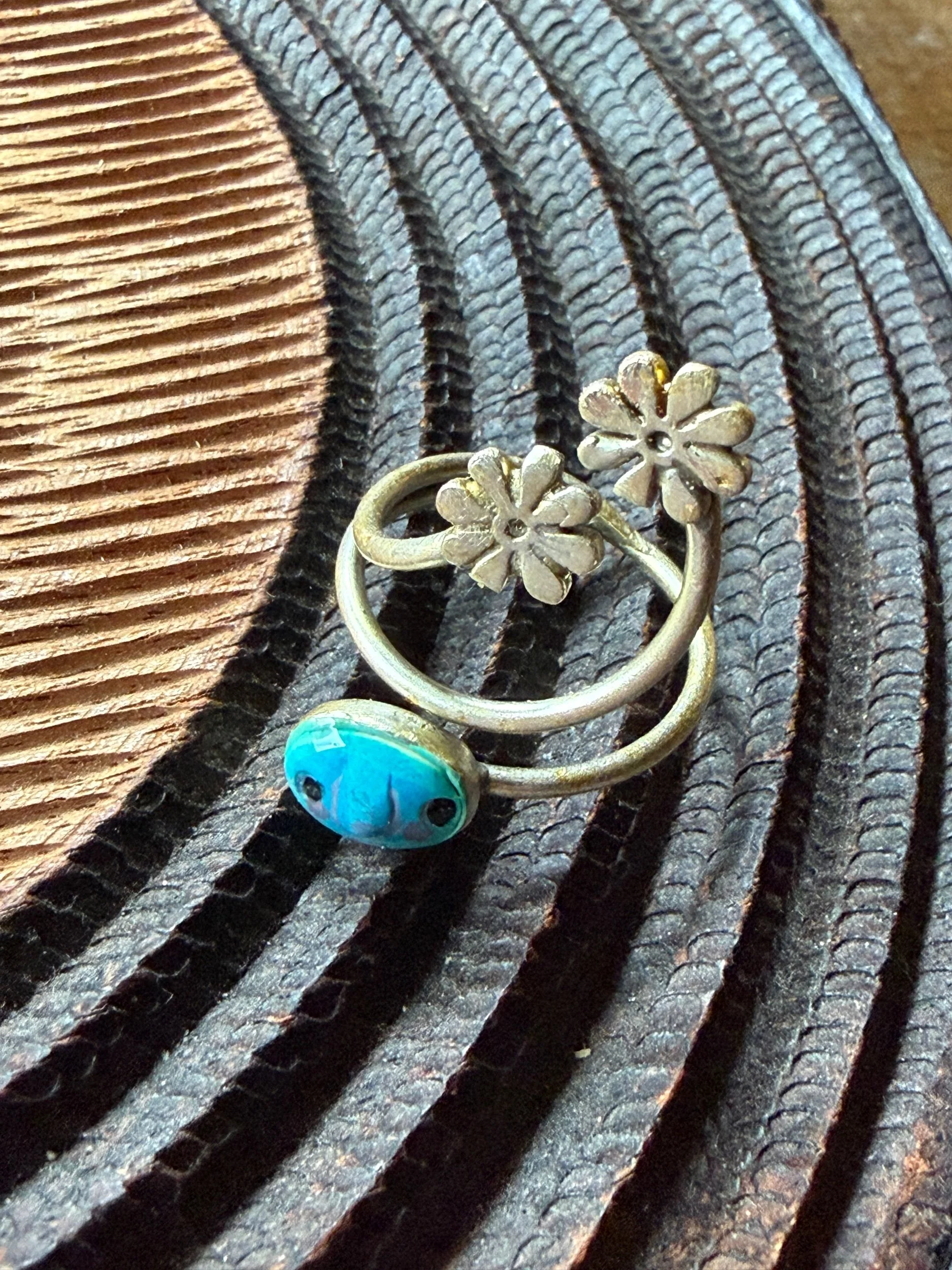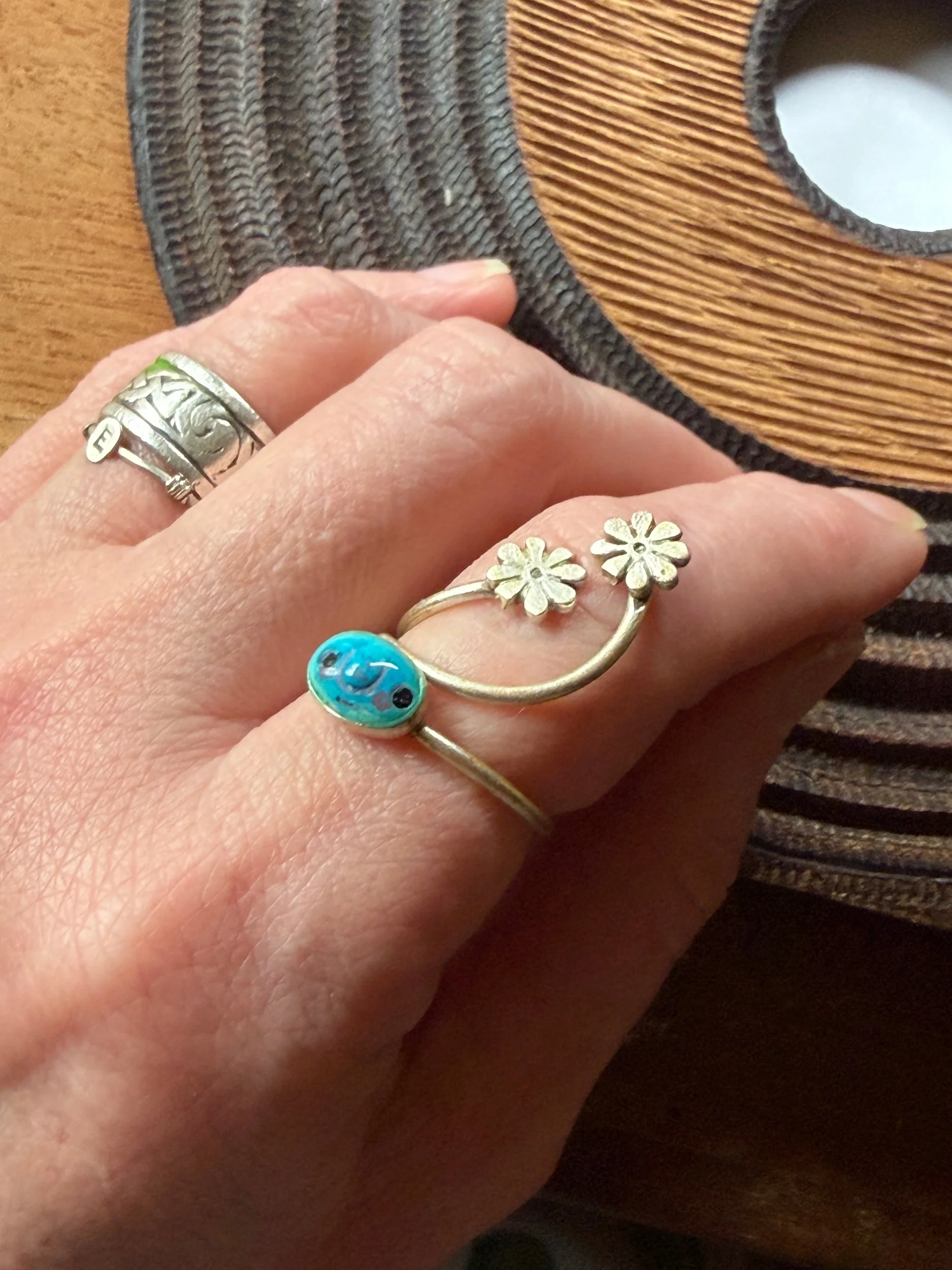 These rings are lovingly sculpted original designs. The hand painted surface is finished in a thick clear coat of resin and set in an adjustable, metal base (not precious metals, and not designed or fabricated by us). This ring is more fragile than other designs and should be treated accordingly!