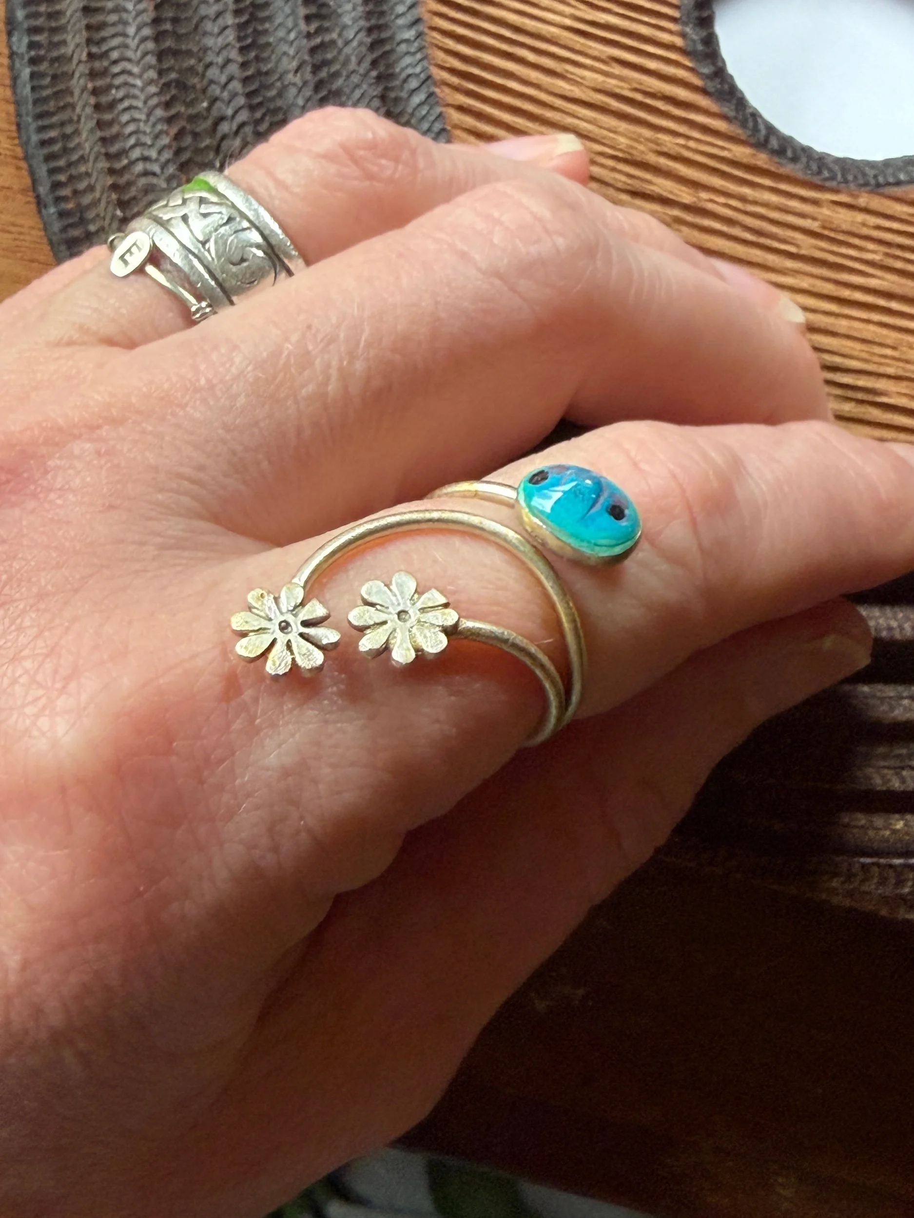 These sweet little guys are the most supportive friends. Beautiful lines and a friendly smile would make these great gifts. Fully adjustable bands can fit most ring sizes.