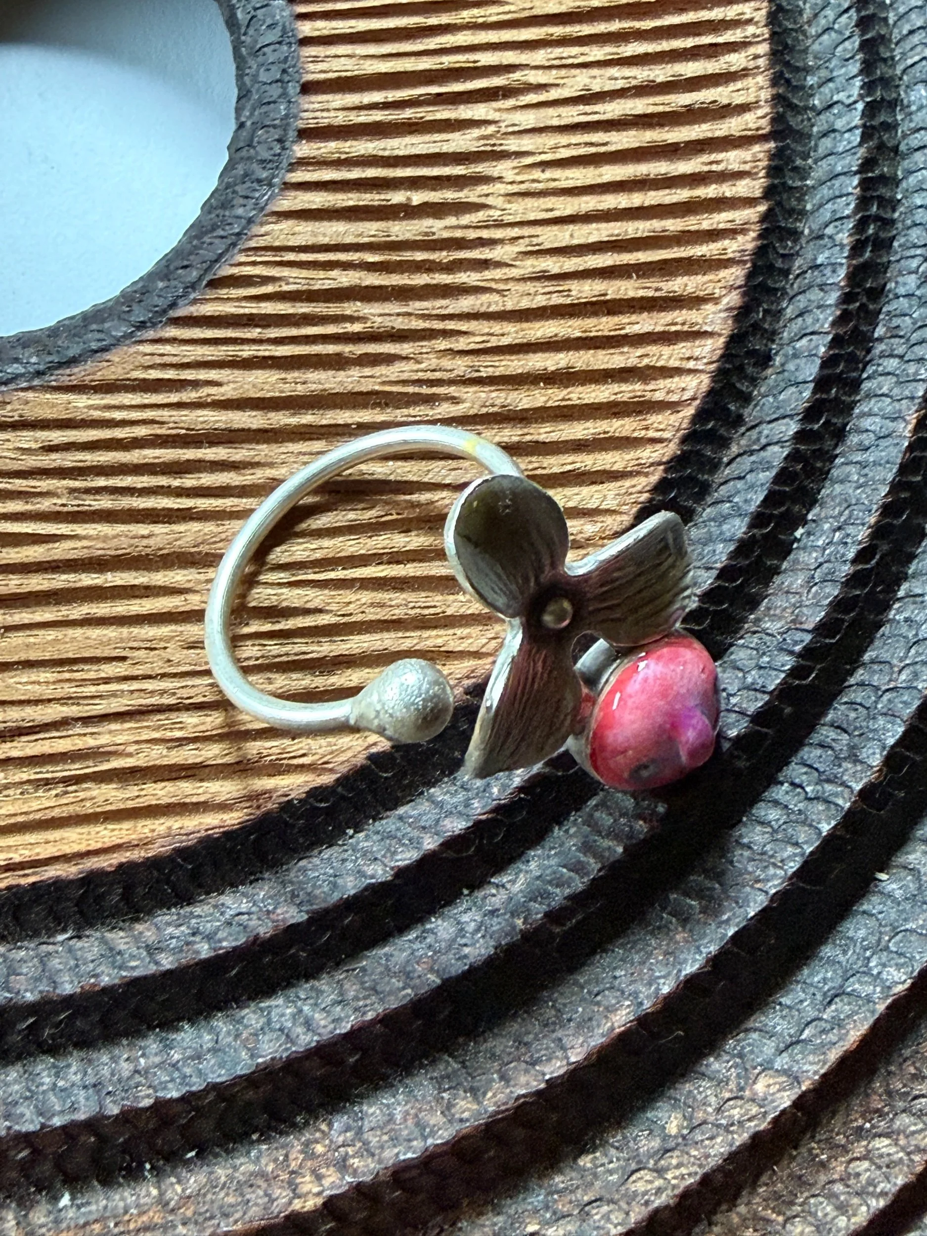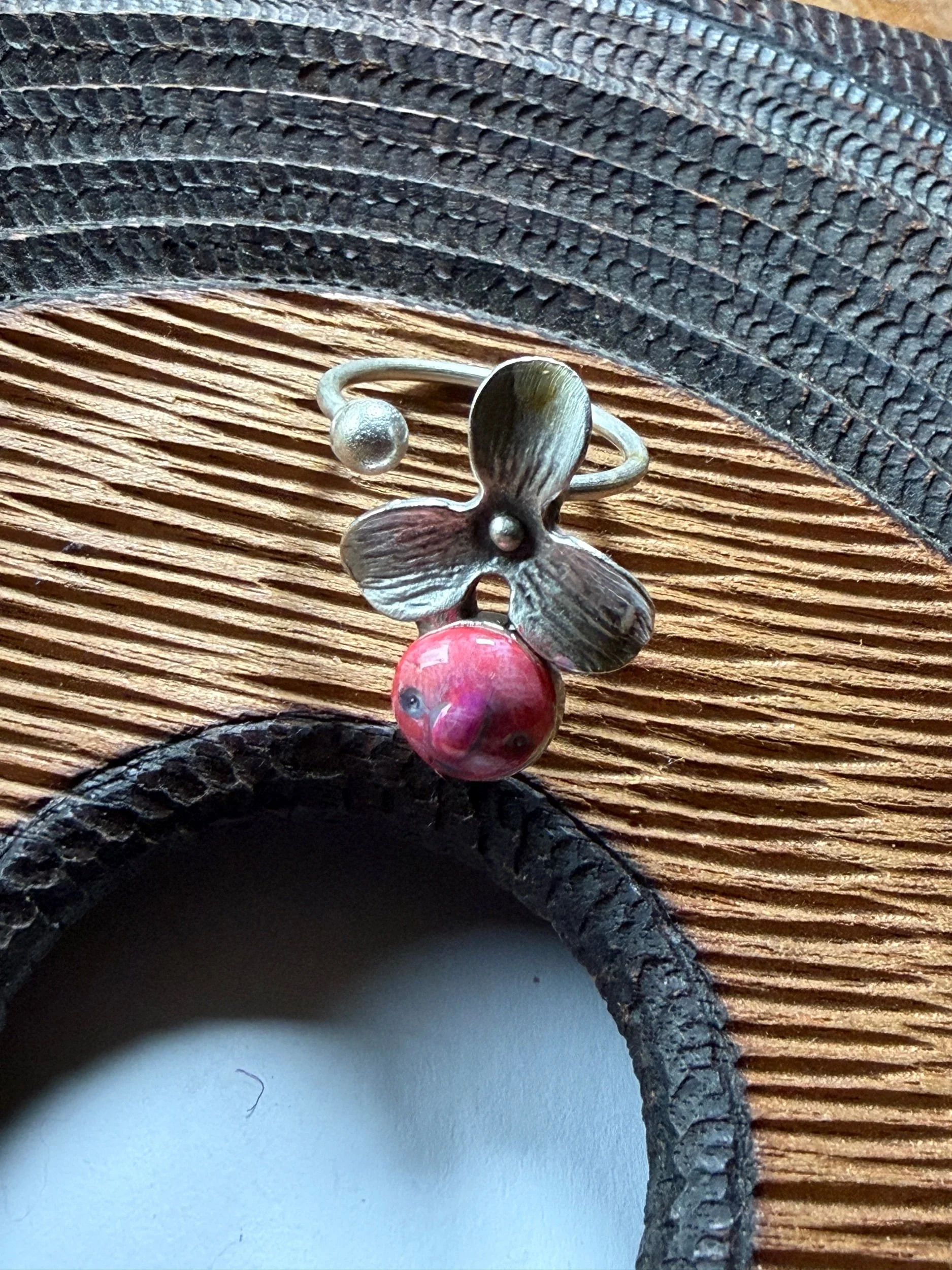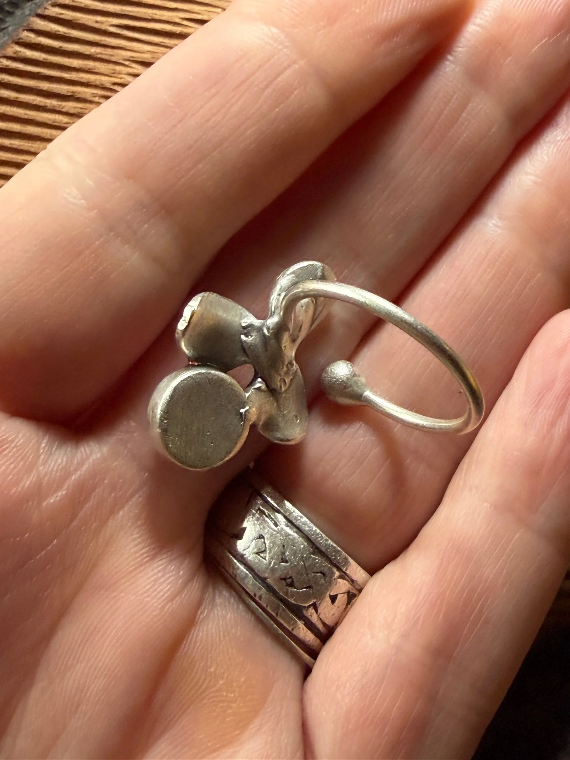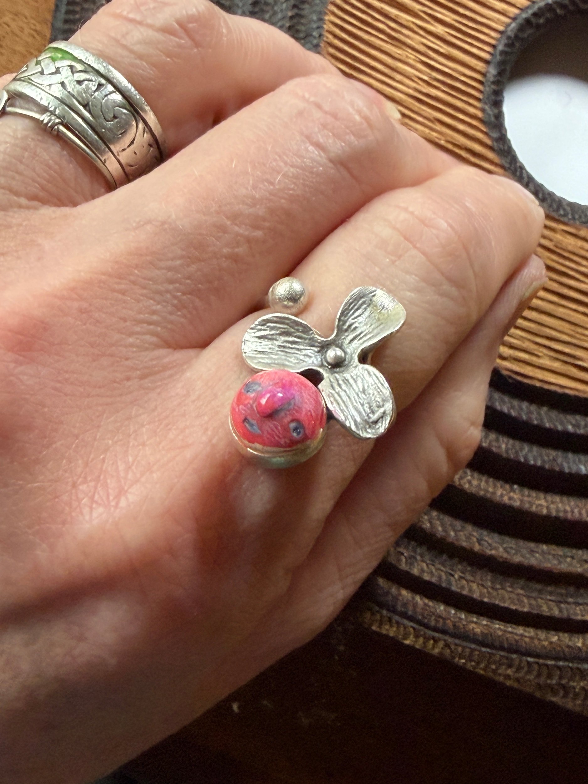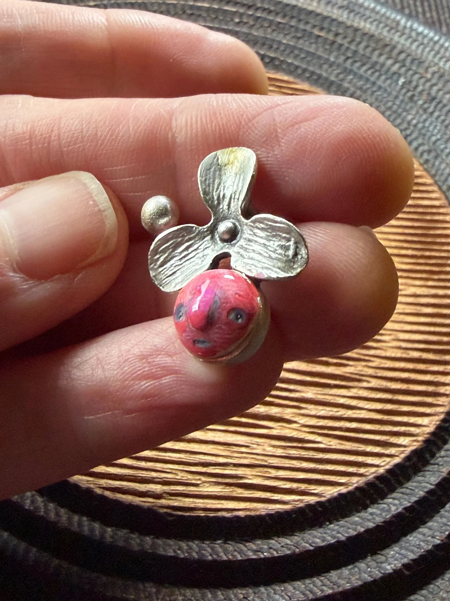 These rings are lovingly sculpted original designs. Their hand painted surface is finished in a thick clear coat of resin and set in an adjustable, metal base (not precious metals, and not designed or fabricated by us). This ring is more fragile than other designs and should be treated accordingly!