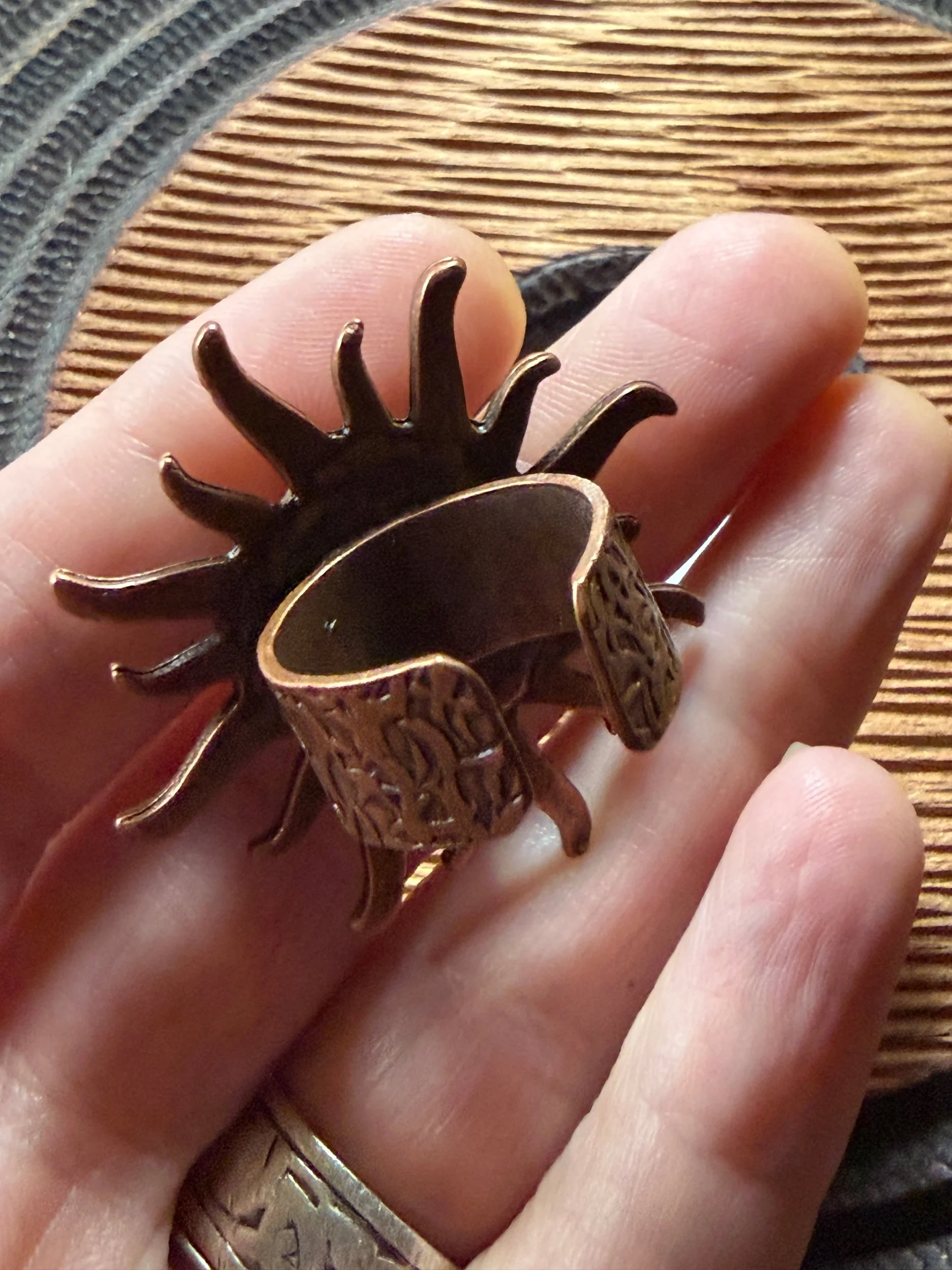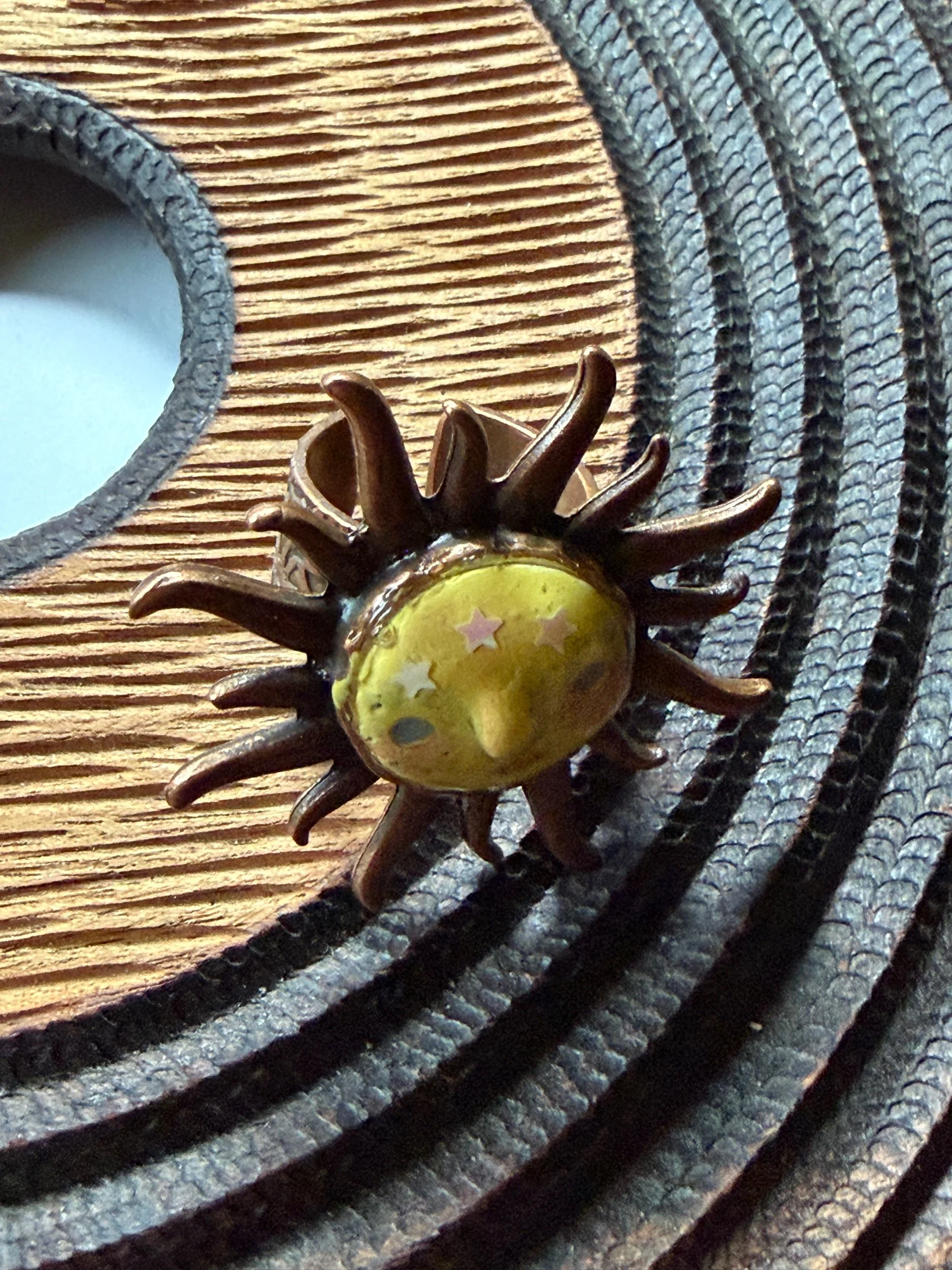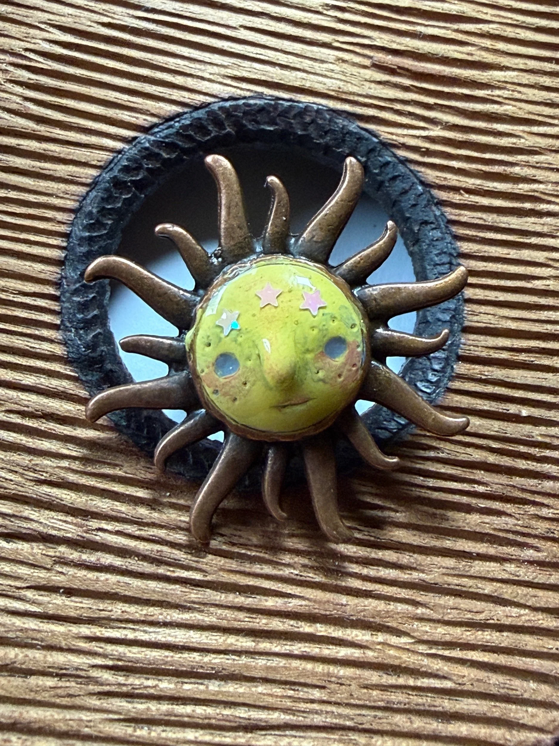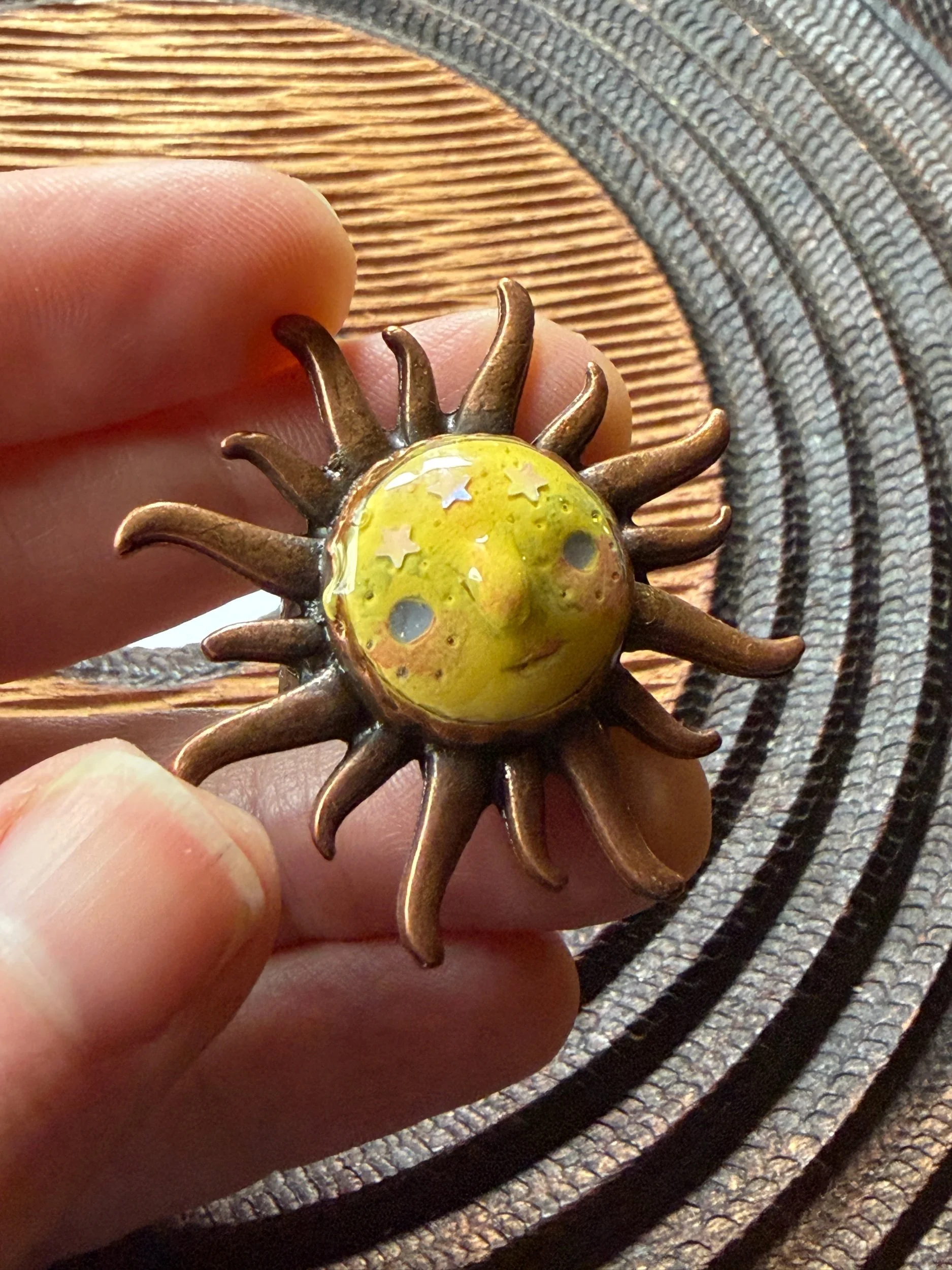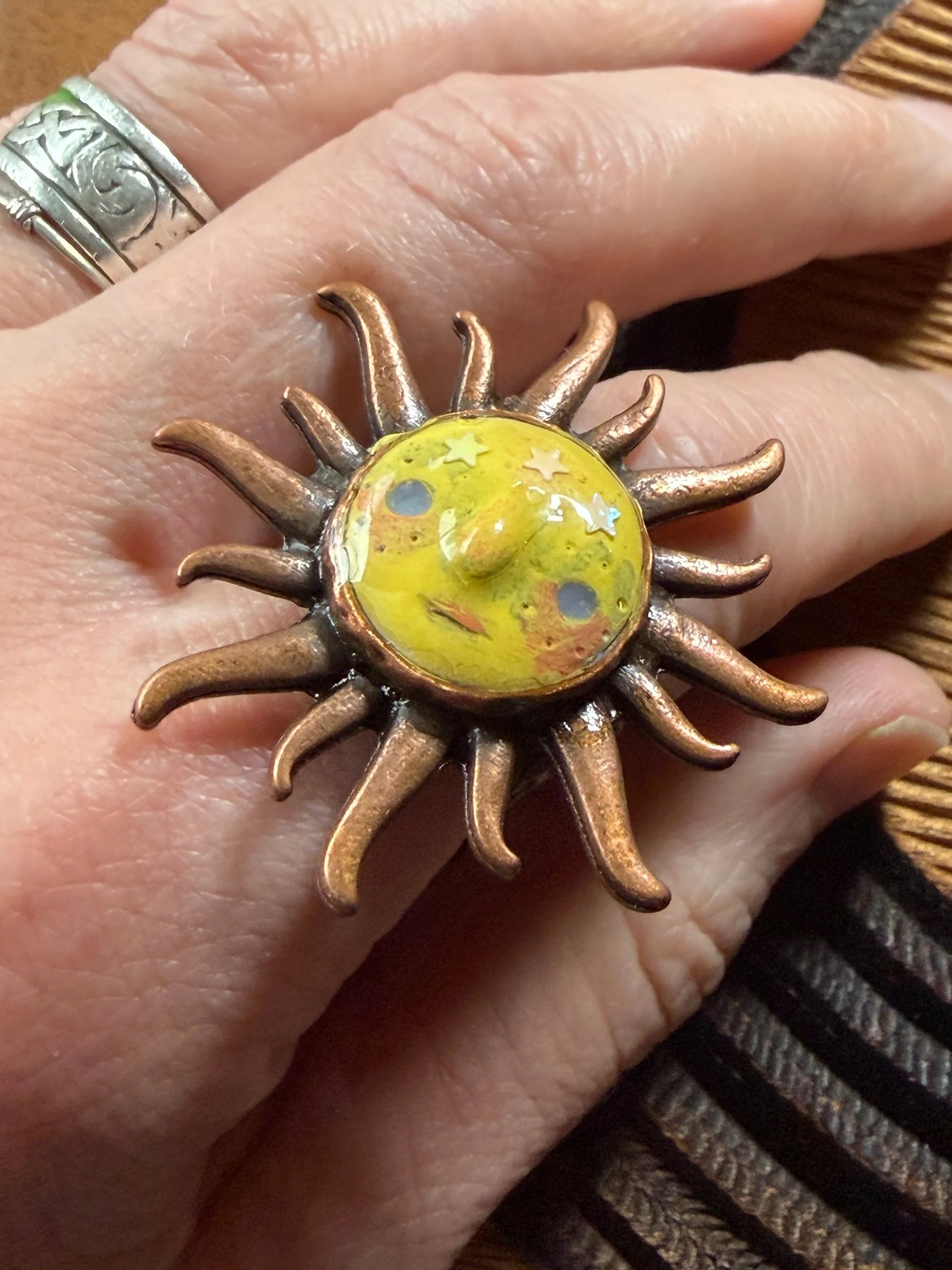 *Roughly 40mm in diameter full piece, this 15mm Art Ring is sculpted and painted in studio. Finishes with acrylic paint and layered with clear resin for durability. This sweet face is set in a rustic sturdy metal frame that we have purchased and has an adjustable band that fits most sizes, not made in studio. Our pieces are all one of a kind and might be imperfectly perfect!
