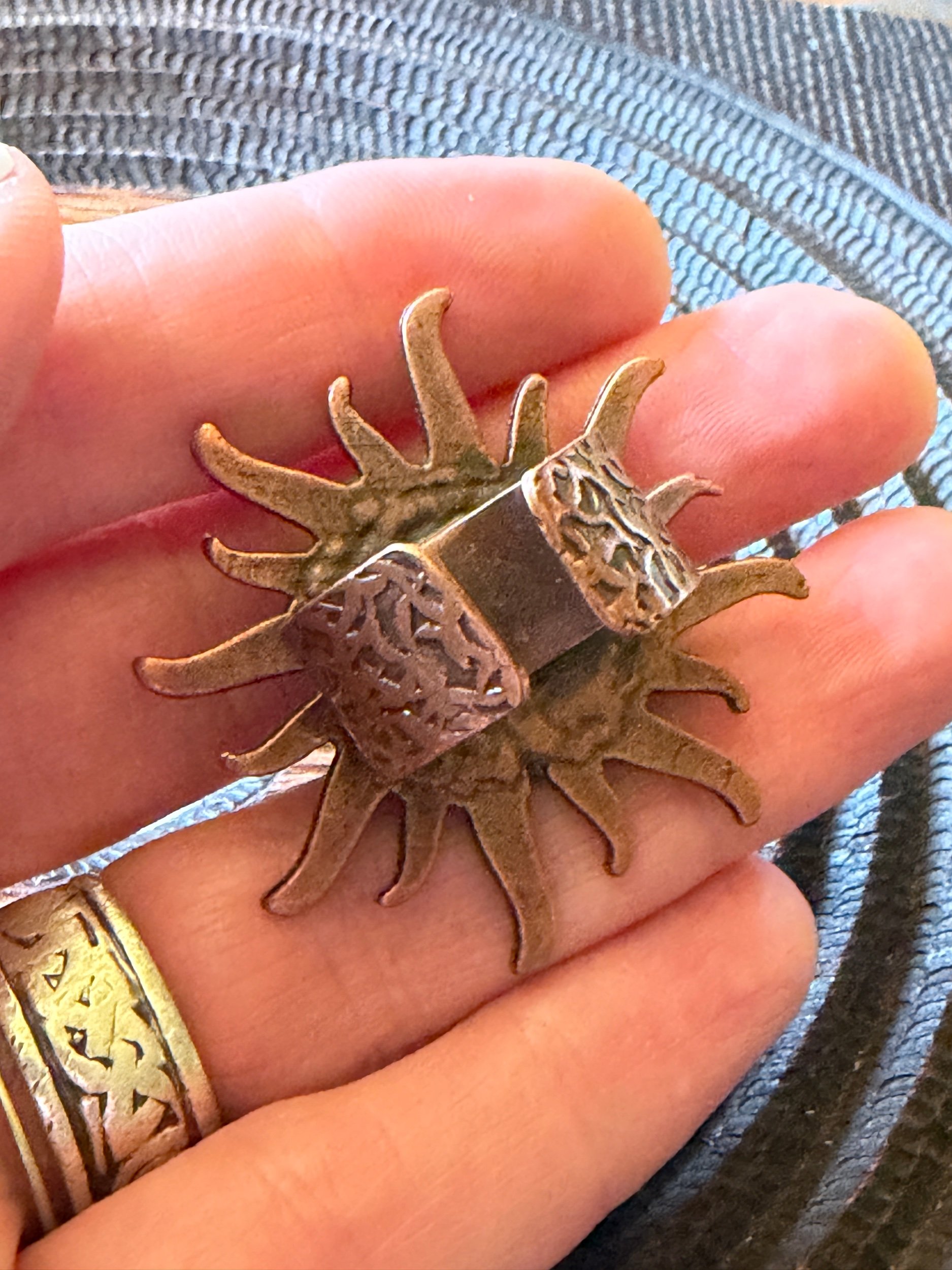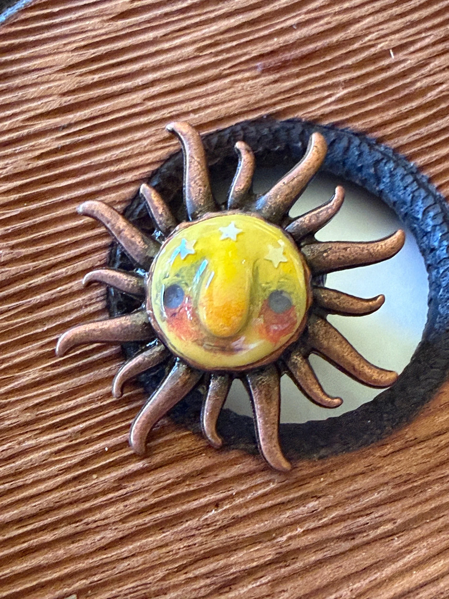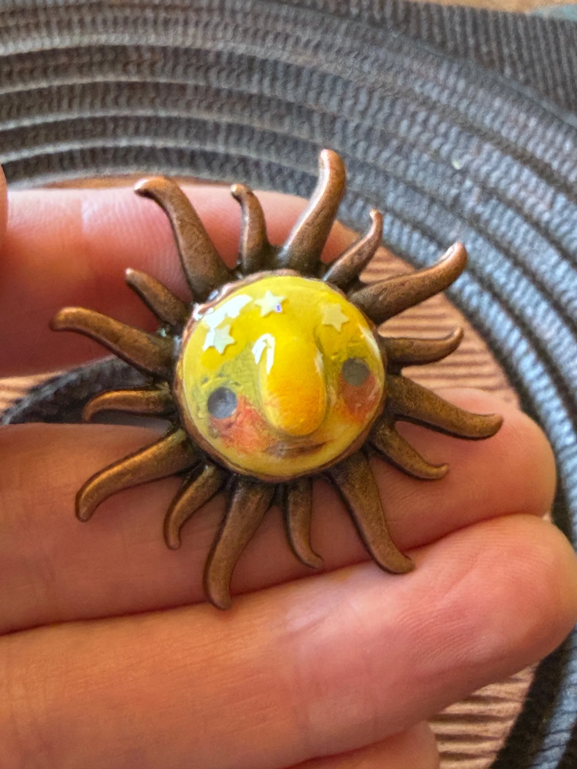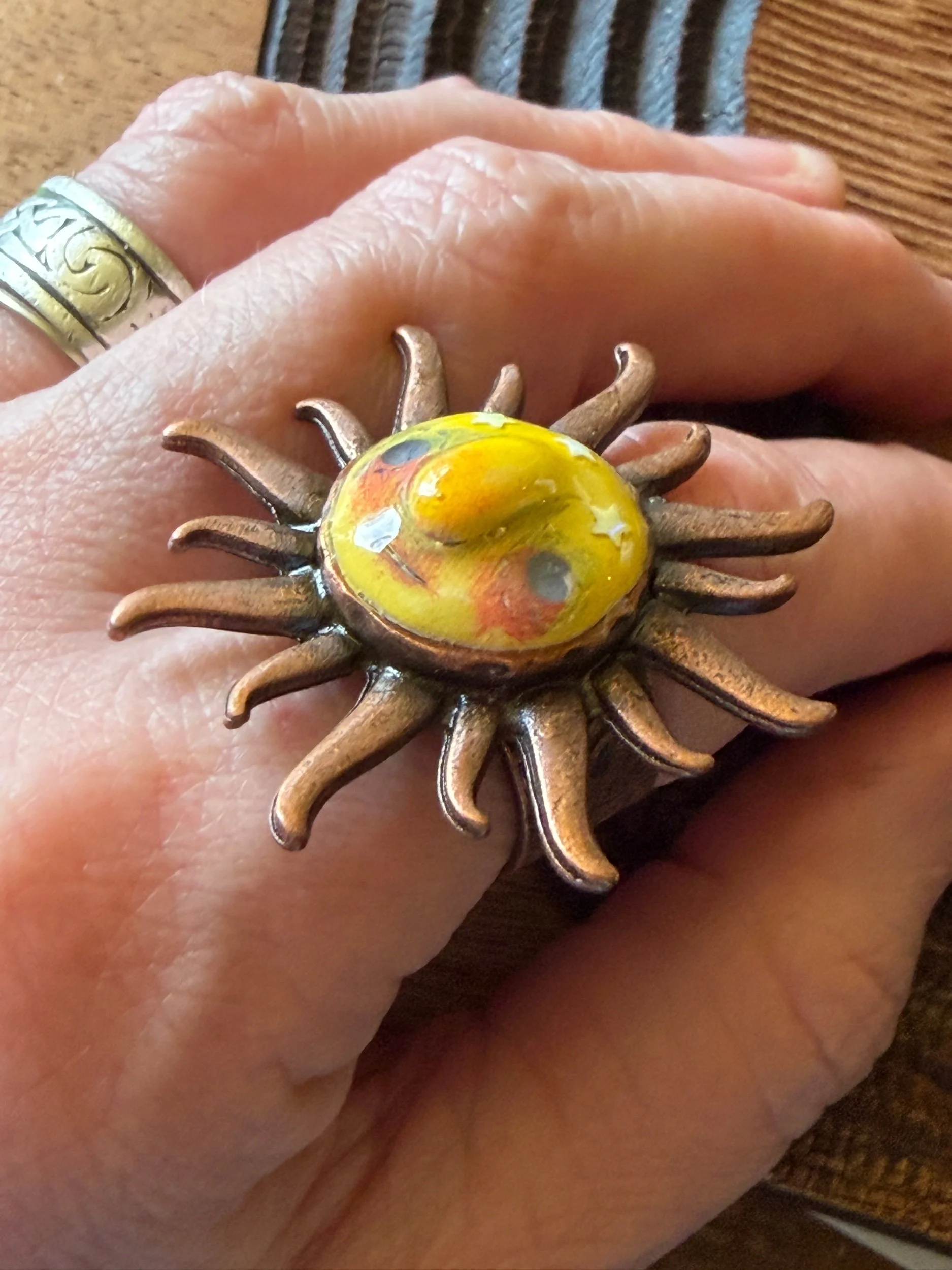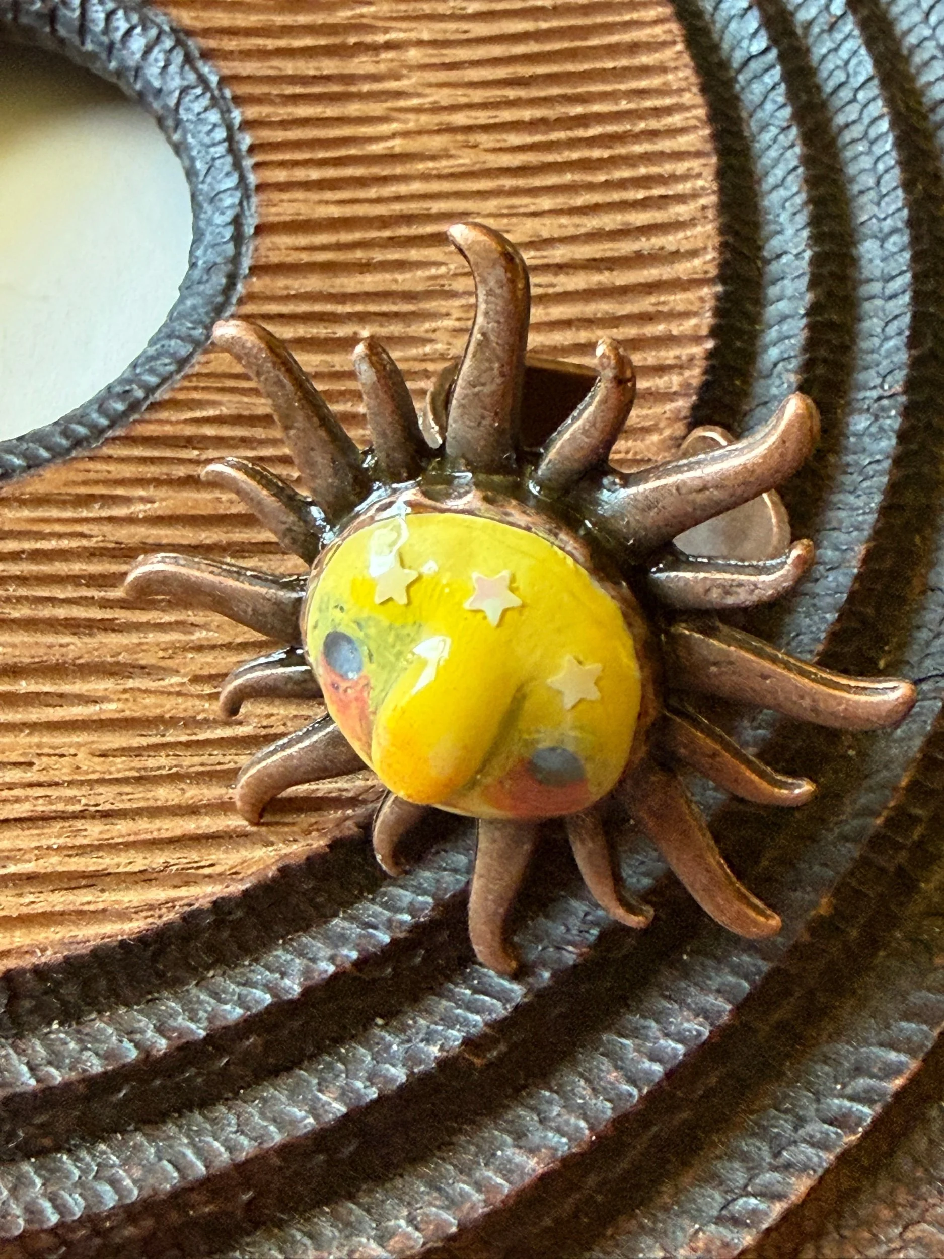 *Roughly 40mm in diameter full piece, this 15mm Art Ring is sculpted and painted in studio. Finishes with acrylic paint and layered with clear resin for durability. This sweet face is set in a rustic sturdy metal frame that we have purchased and has an adjustable band that fits most sizes, not made in studio. Our pieces are all one of a kind and might be imperfectly perfect!