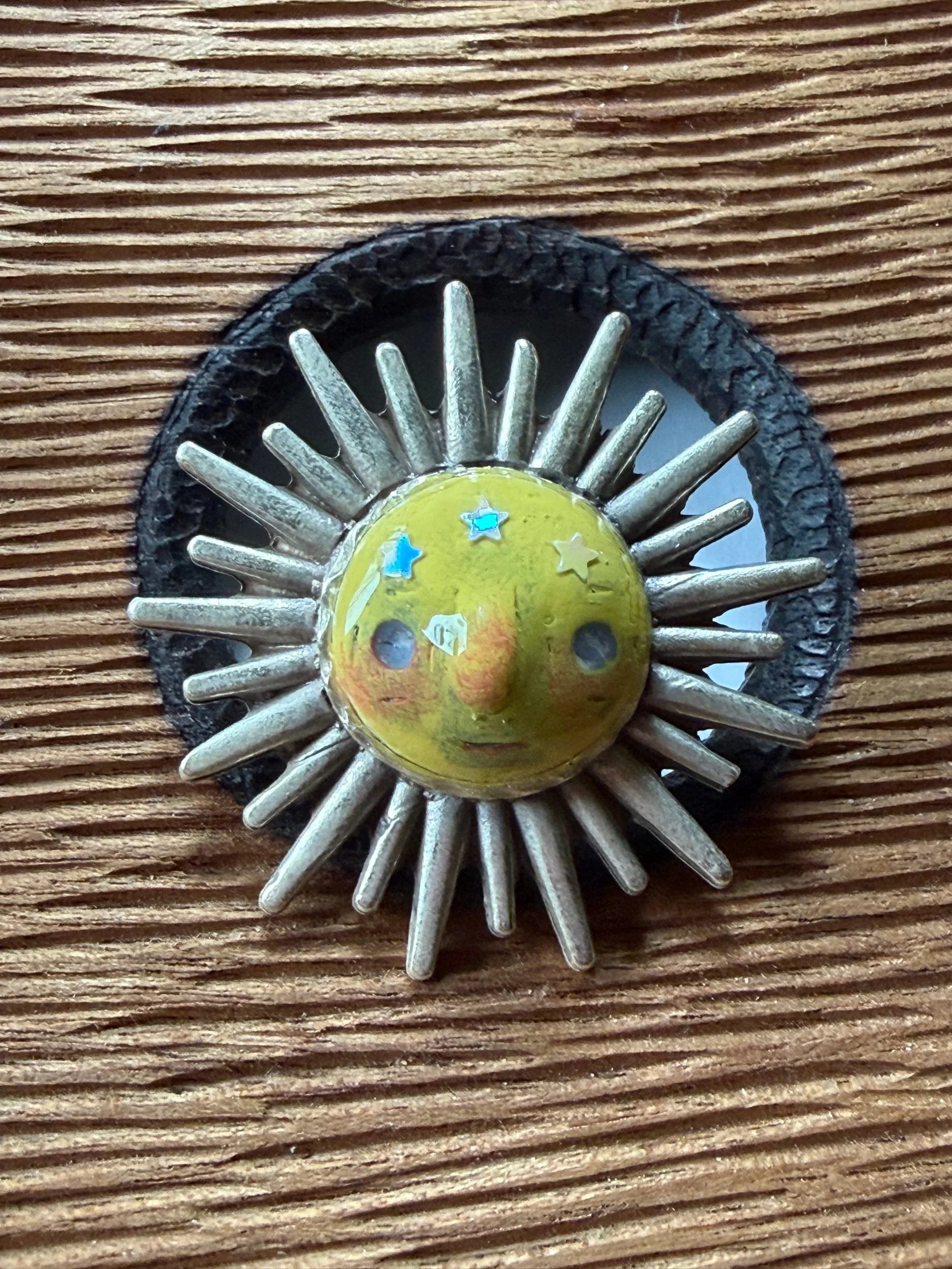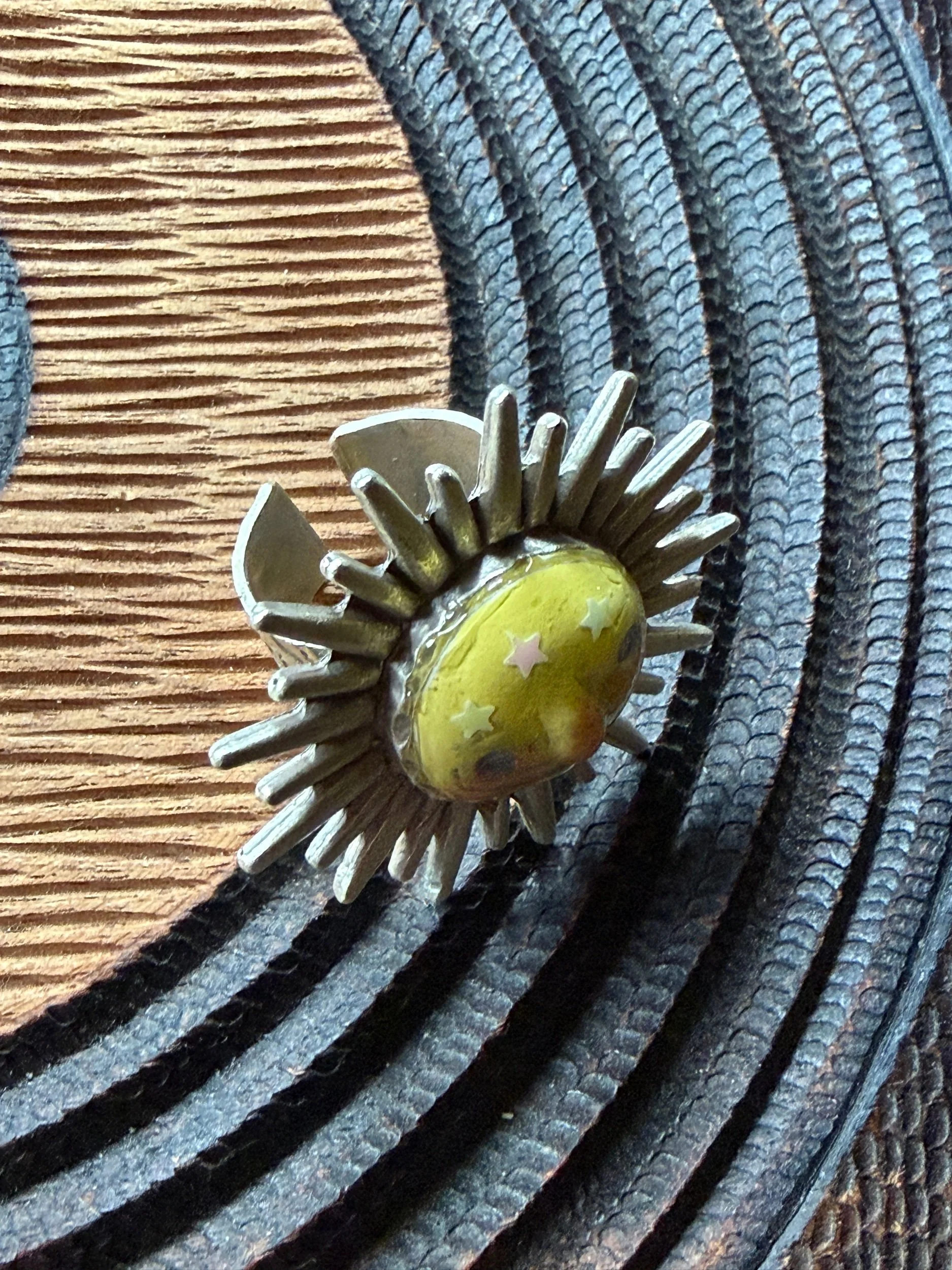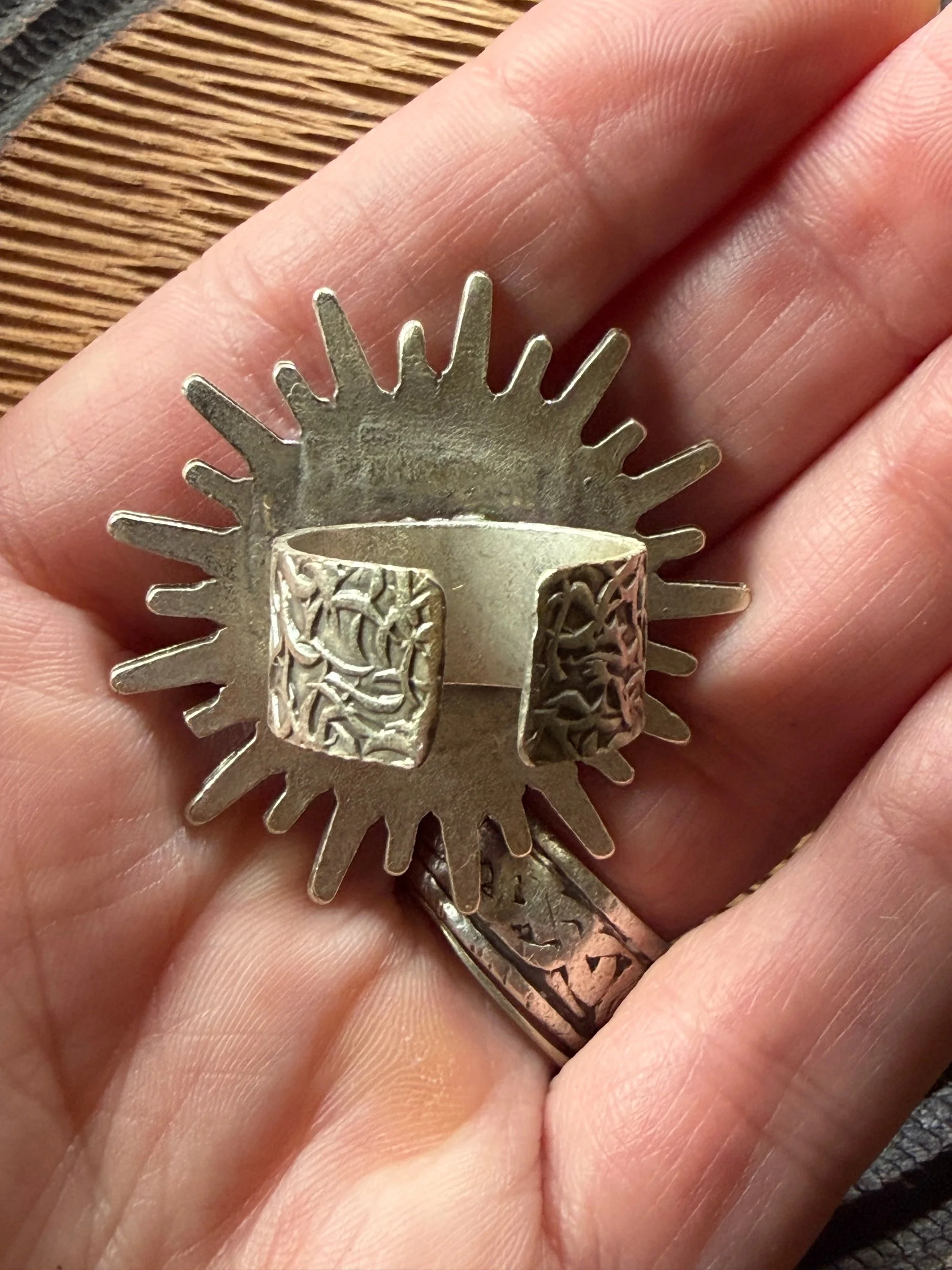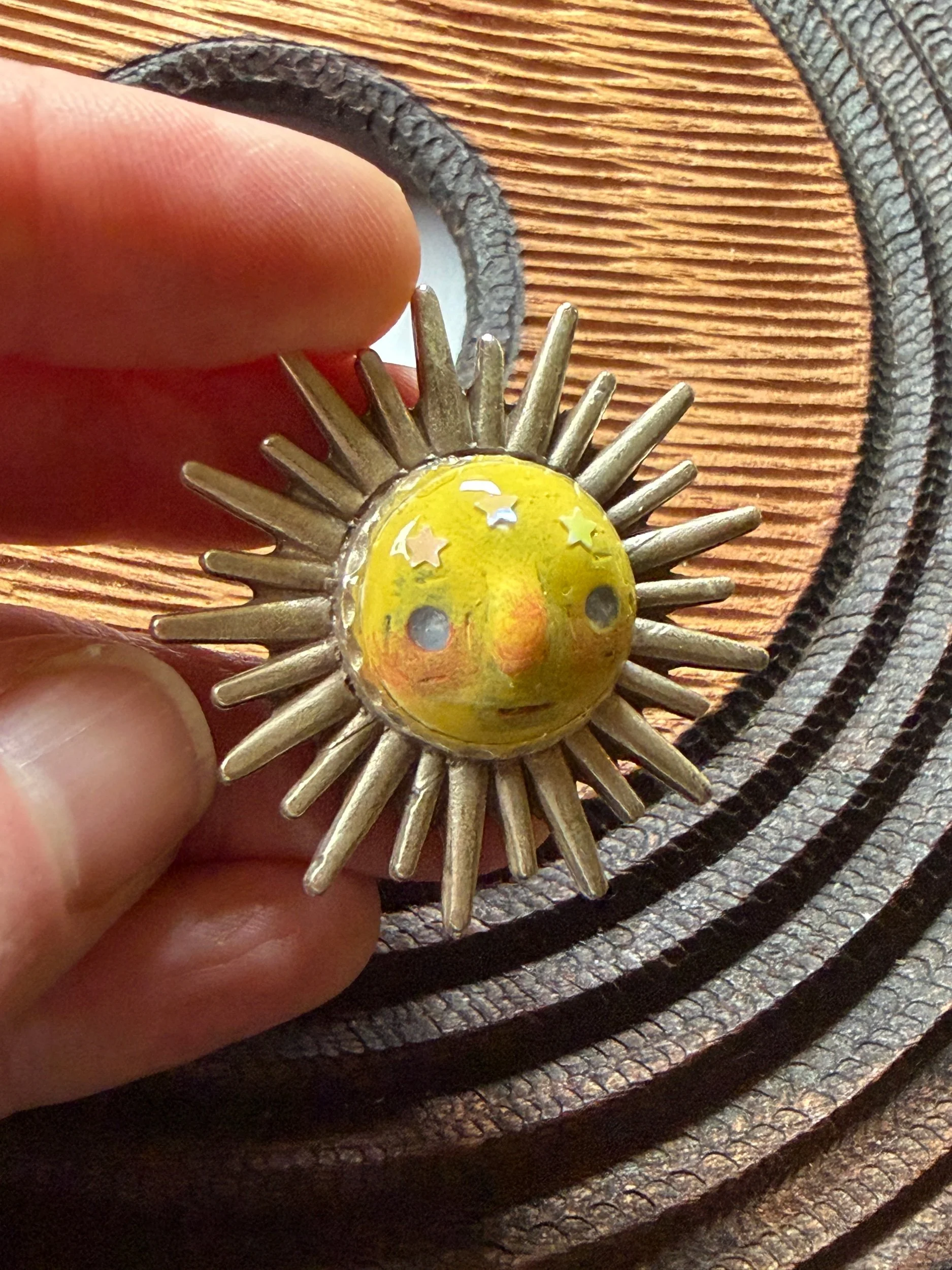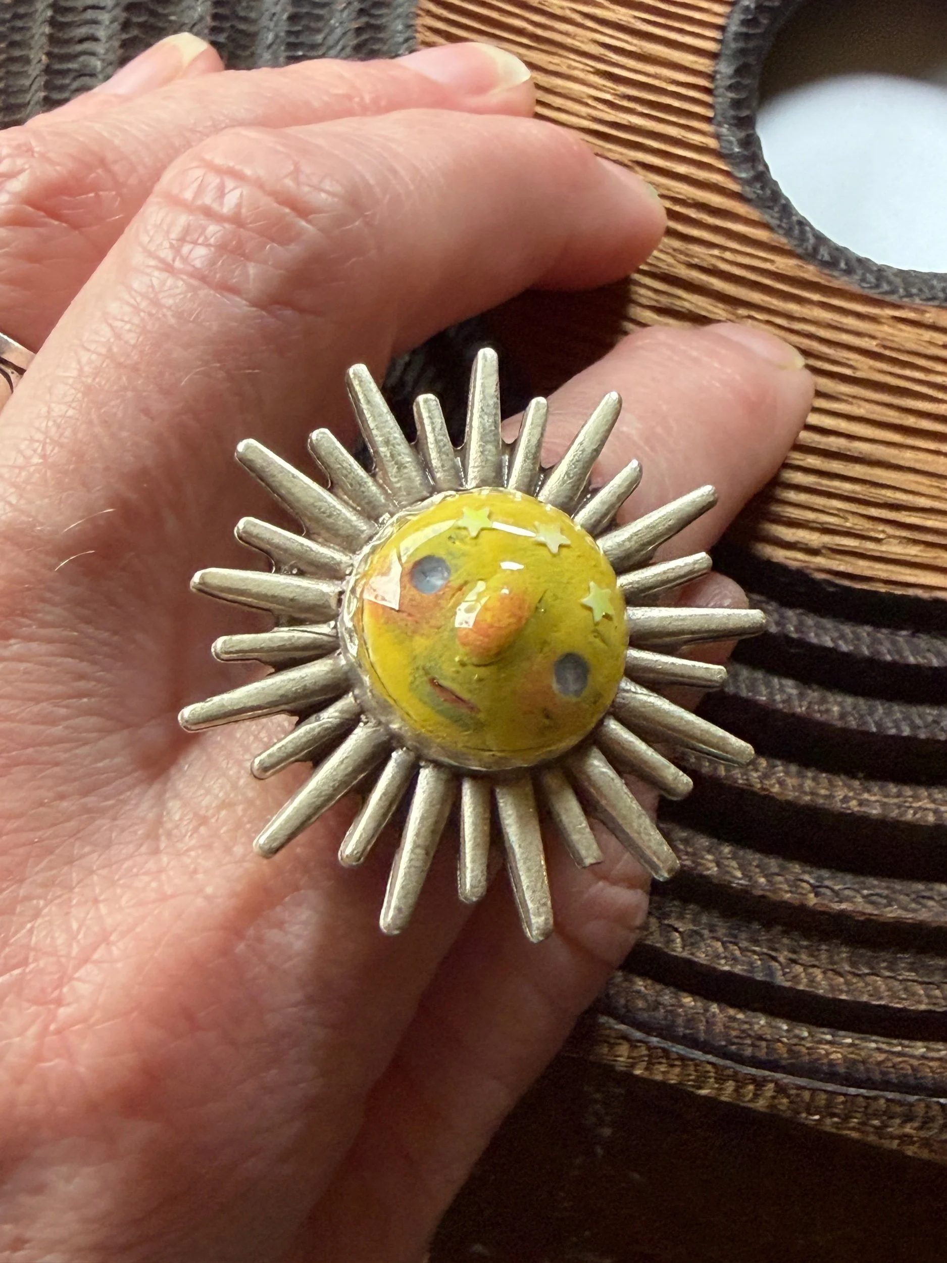 *Roughly 40mm in diameter full piece, this 15mm Art Ring is sculpted and painted in studio. Finishes with acrylic paint and layered with clear resin for durability. This sweet face is set in a rustic sturdy metal frame that we have purchased and has an adjustable band that fits most sizes, not made in studio. Our pieces are all one of a kind and might be imperfectly perfect!