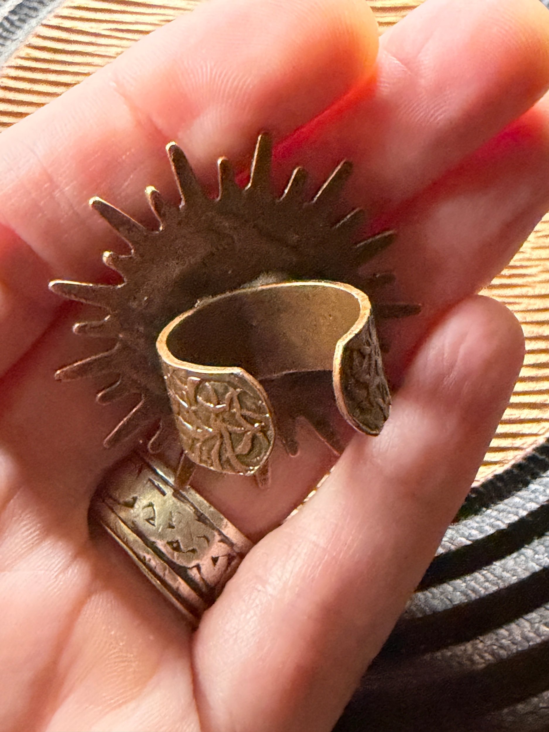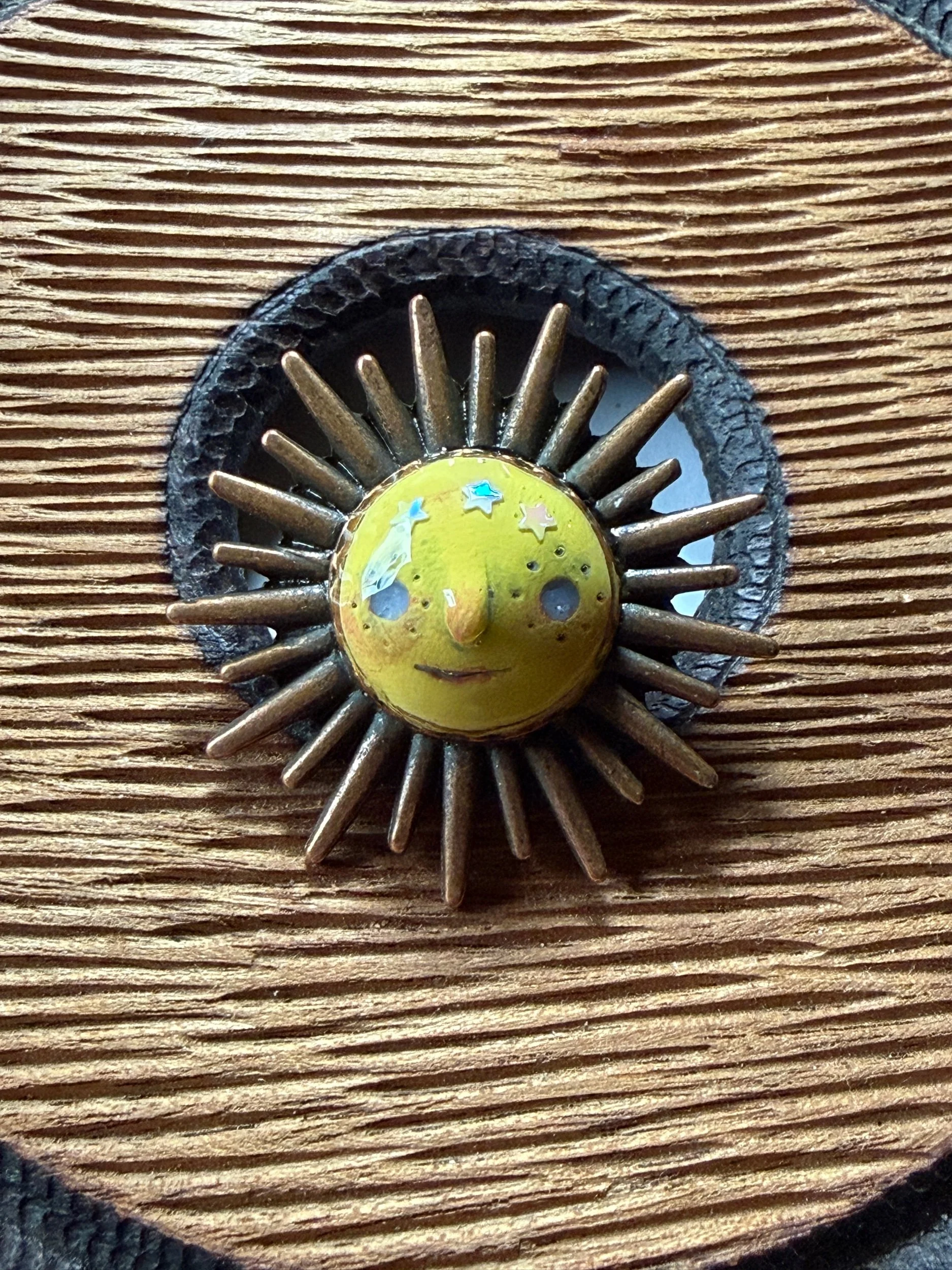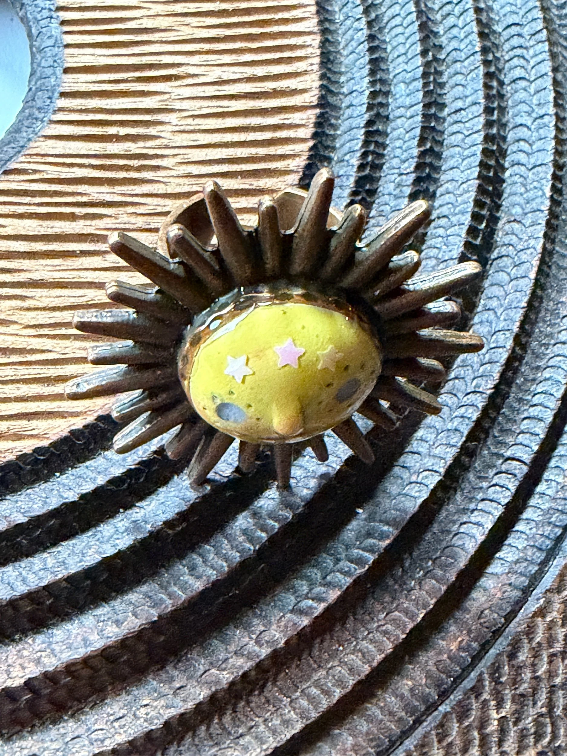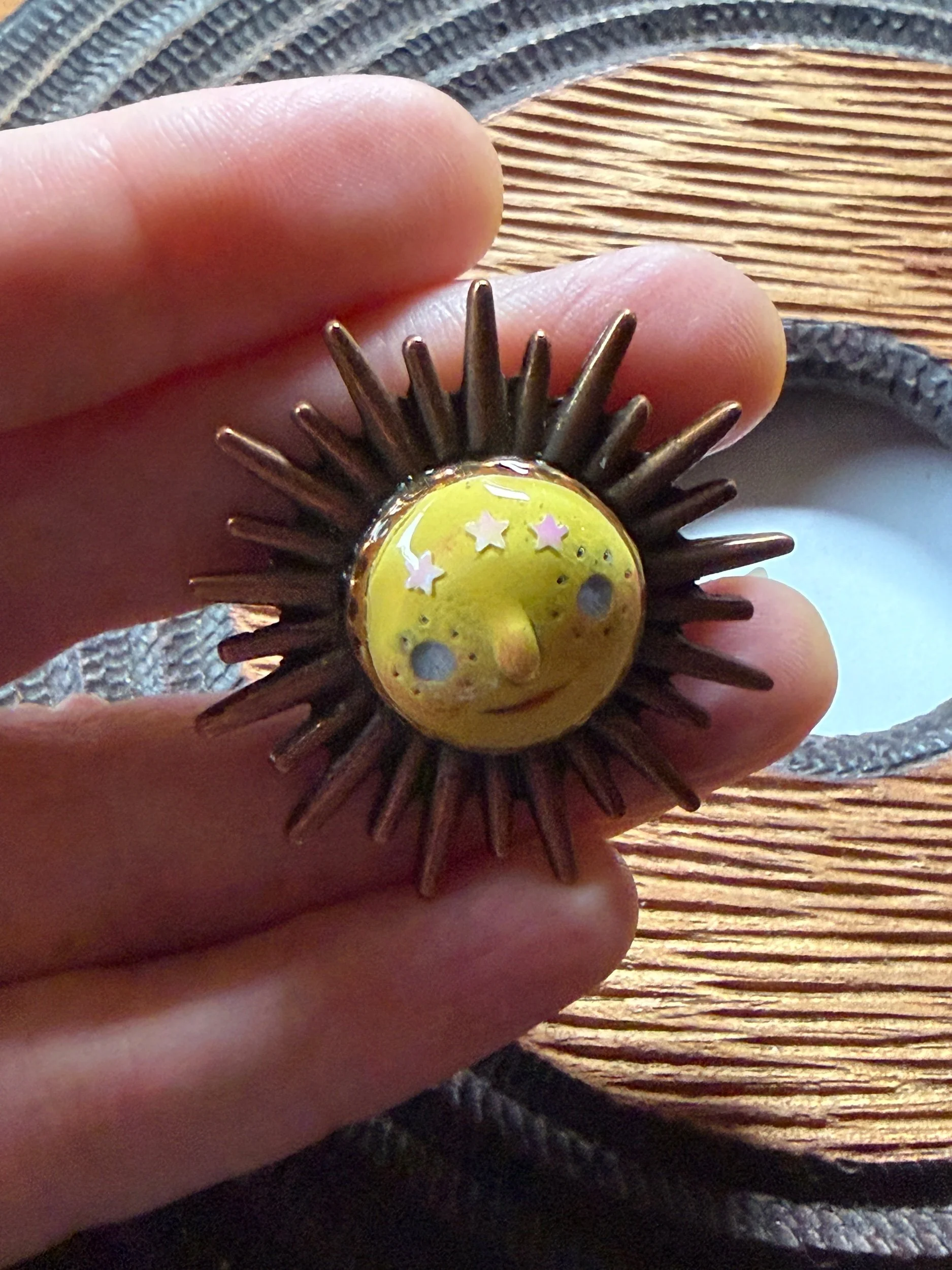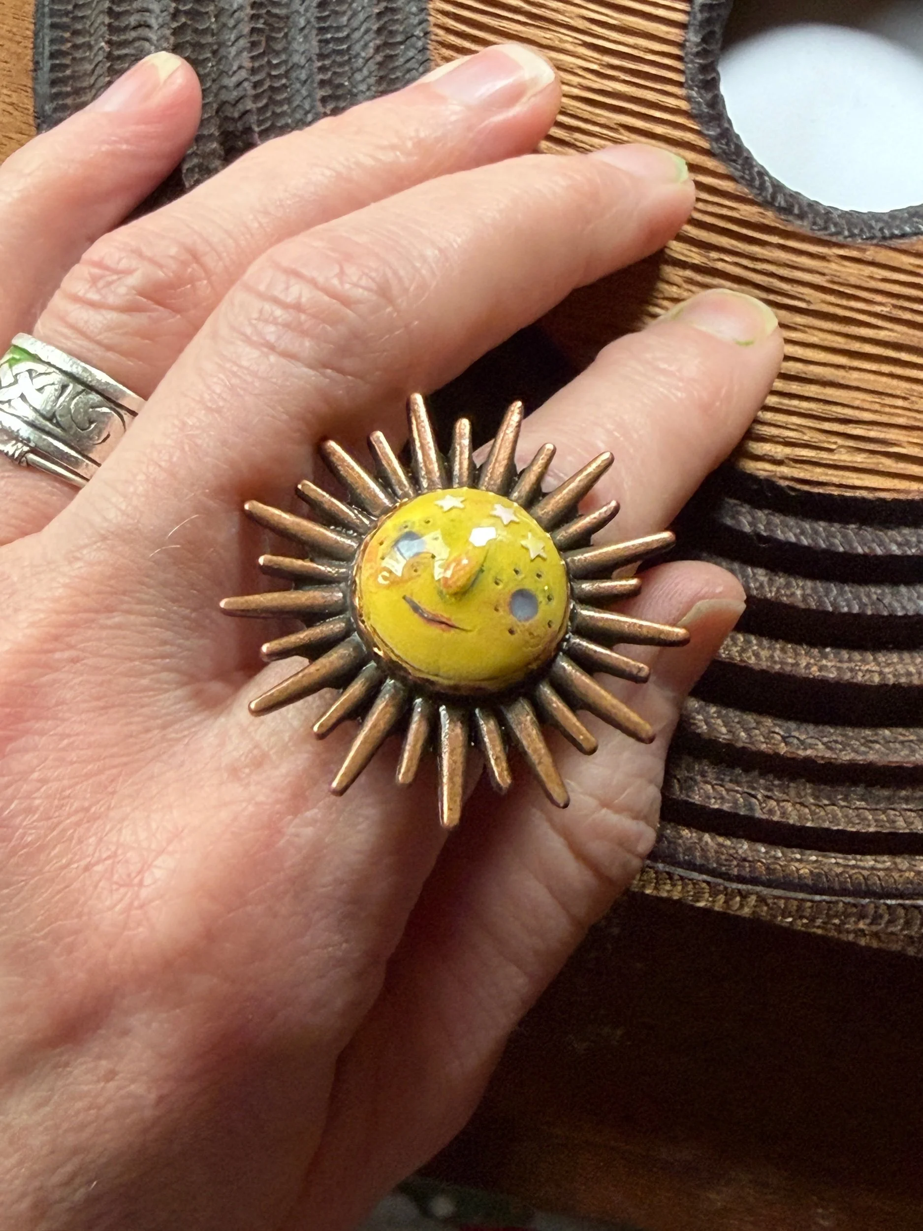 *Roughly 40mm in diameter full piece, this 15mm Art Ring is sculpted and painted in studio. Finishes with acrylic paint and layered with clear resin for durability. This sweet face is set in a rustic sturdy metal frame that we have purchased and has an adjustable band that fits most sizes, not made in studio. Our pieces are all one of a kind and might be imperfectly perfect!
