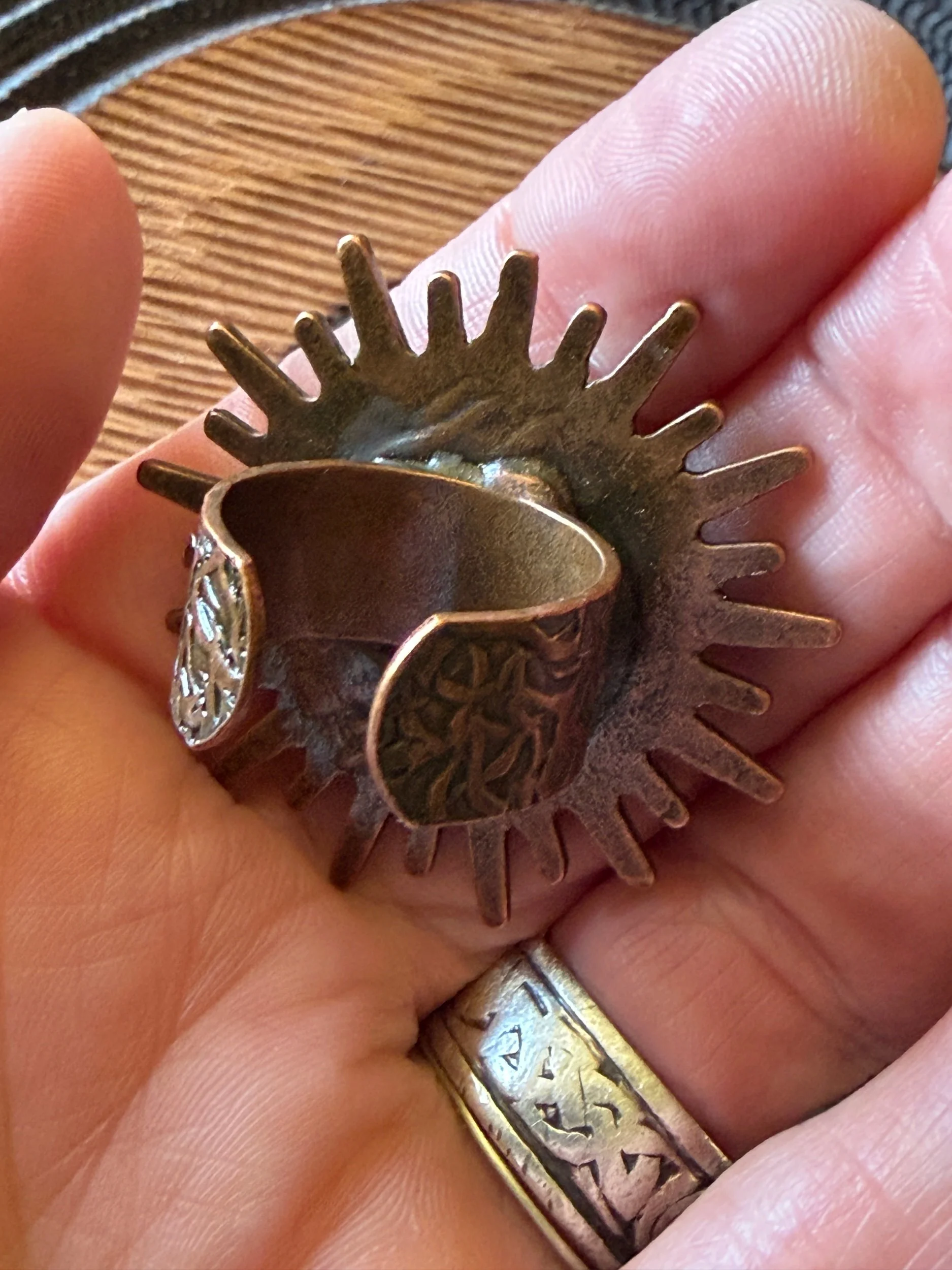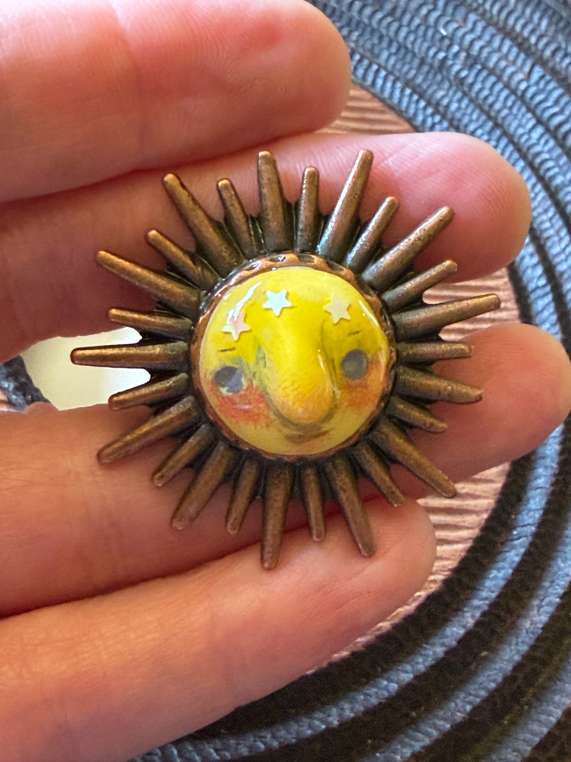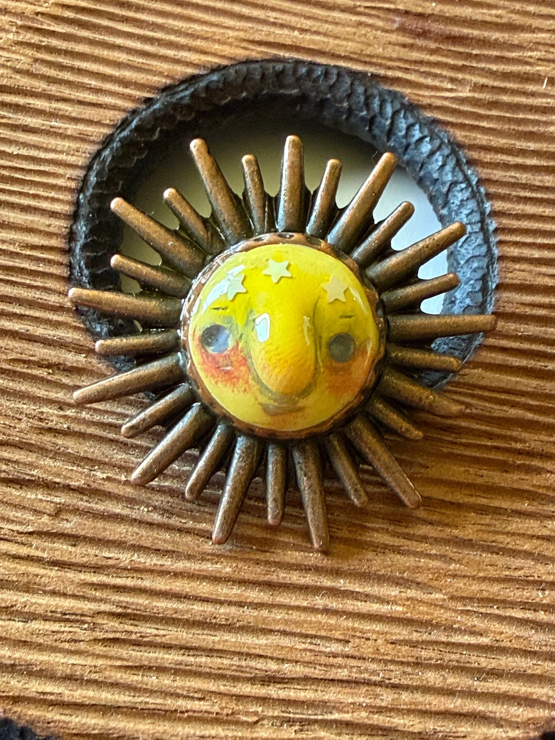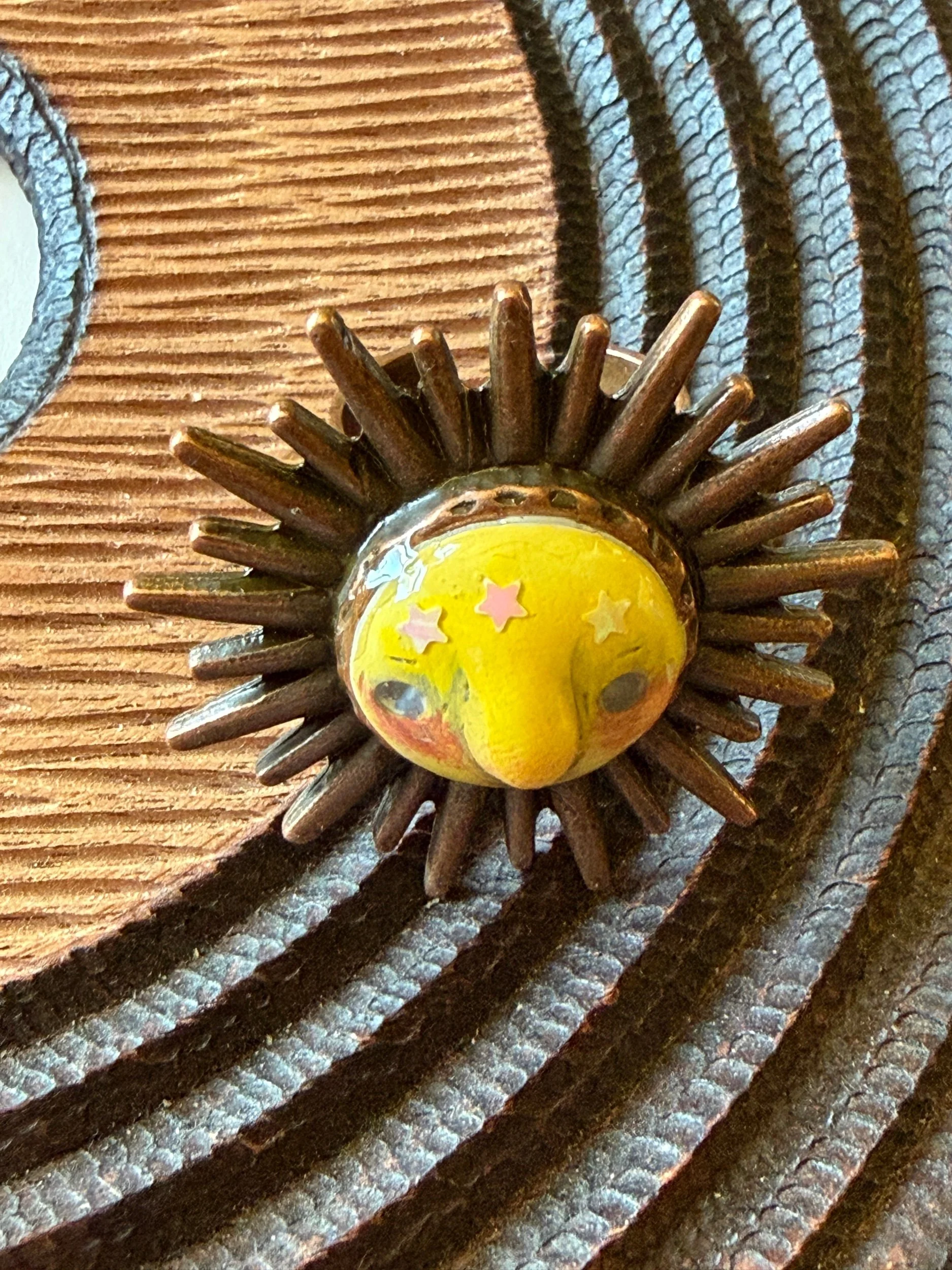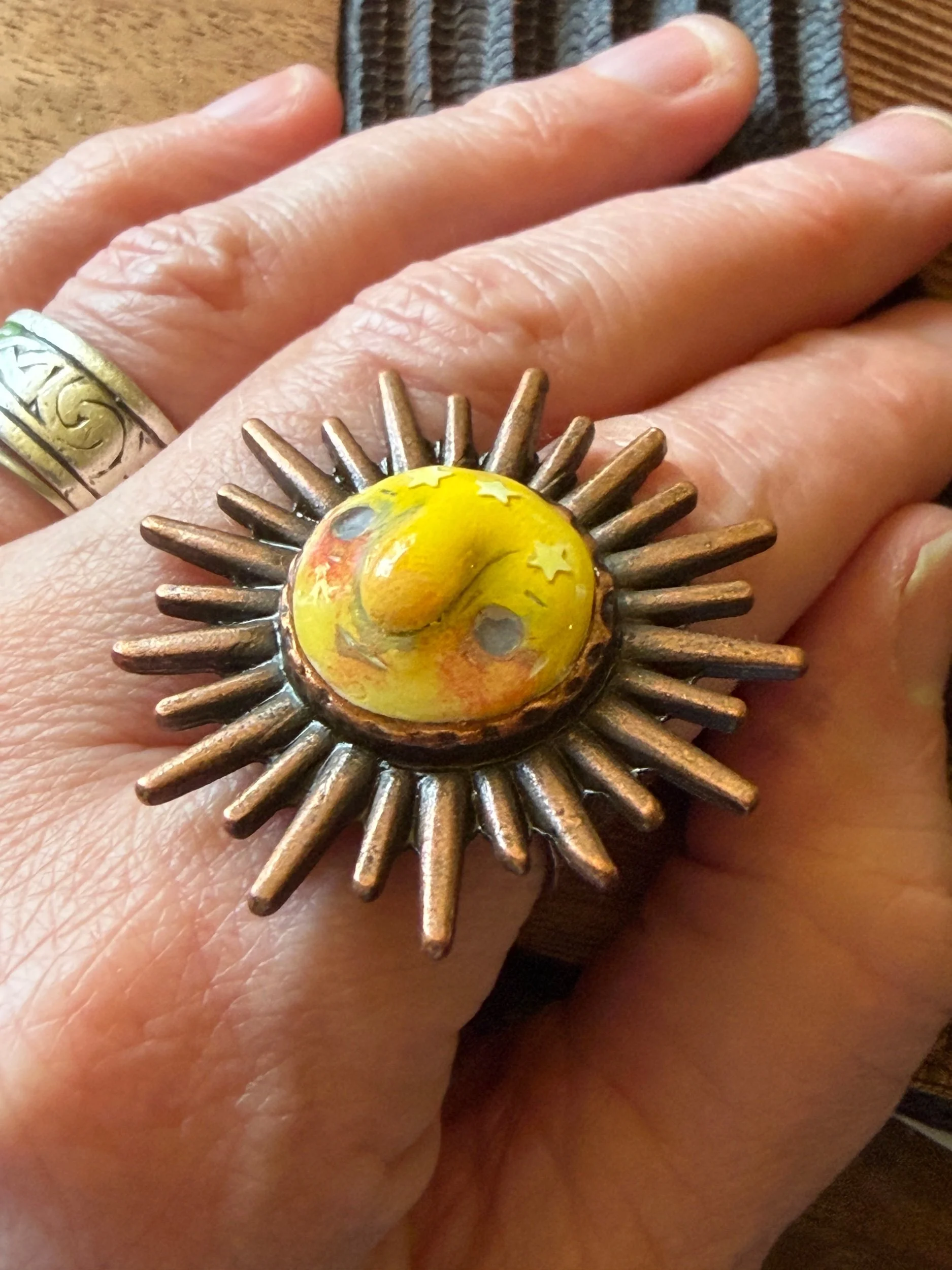 *Roughly 40mm in diameter full piece, this 15mm Art Ring is sculpted and painted in studio. Finishes with acrylic paint and layered with clear resin for durability. This sweet face is set in a rustic sturdy metal frame that we have purchased and has an adjustable band that fits most sizes, not made in studio. Our pieces are all one of a kind and might be imperfectly perfect!