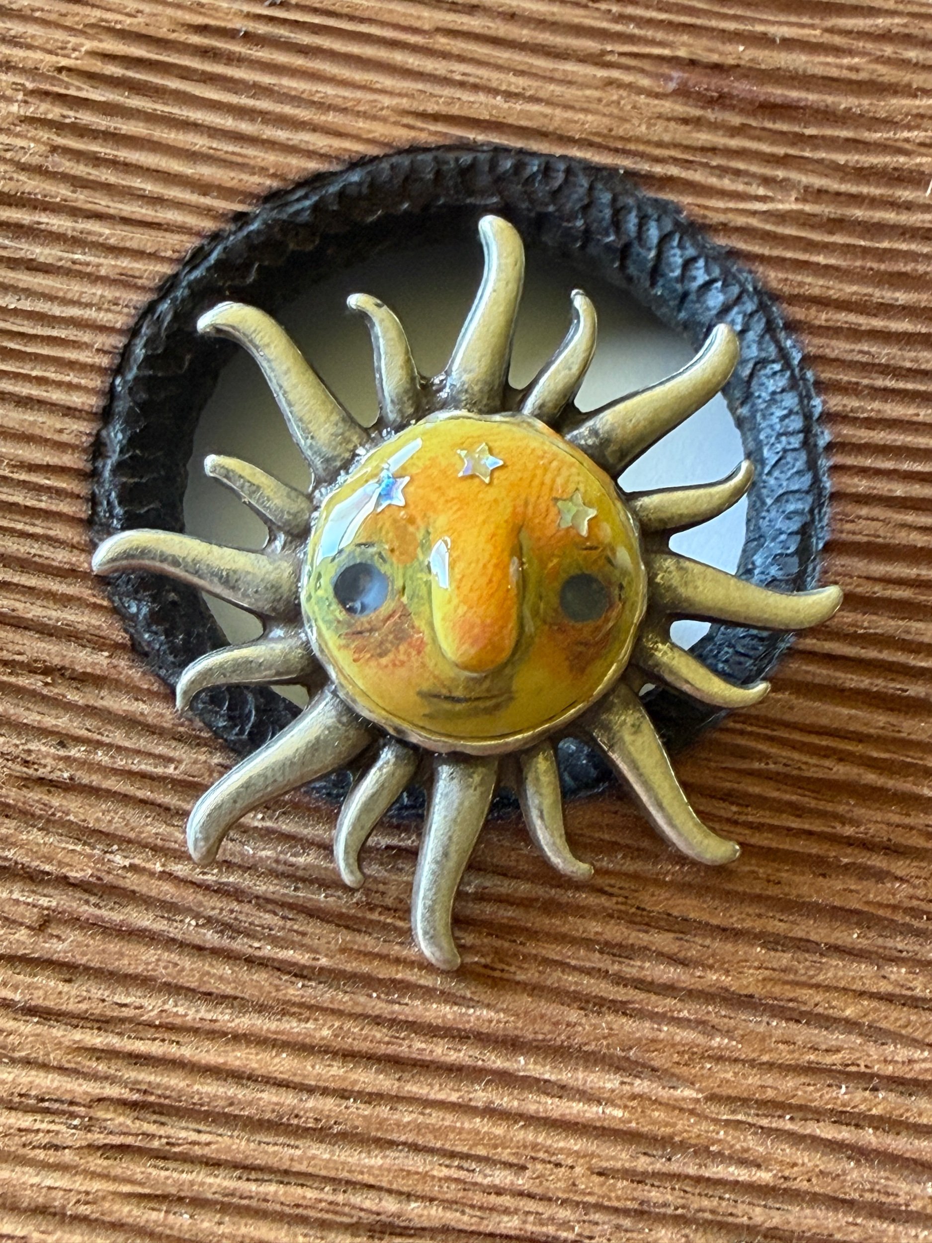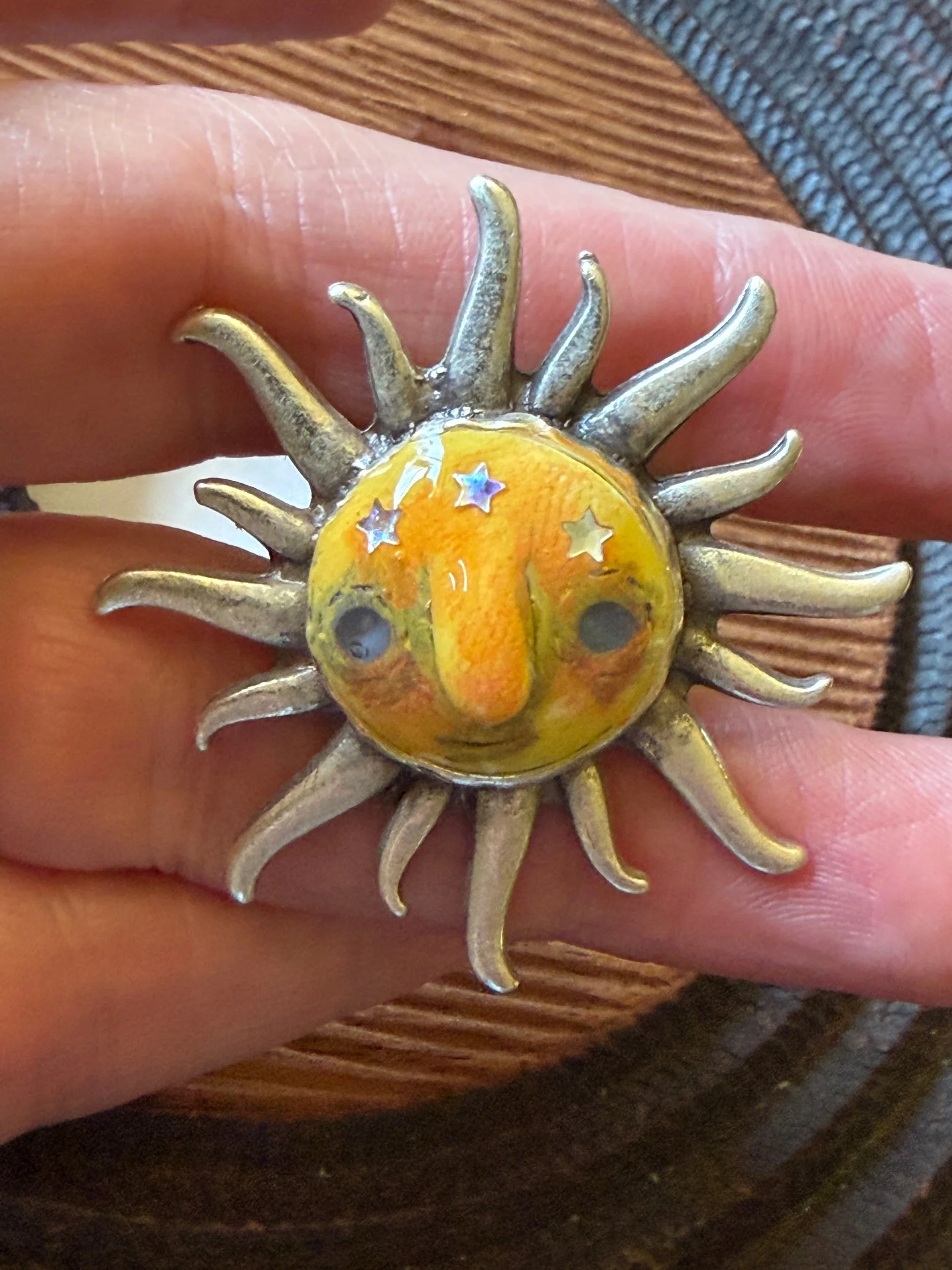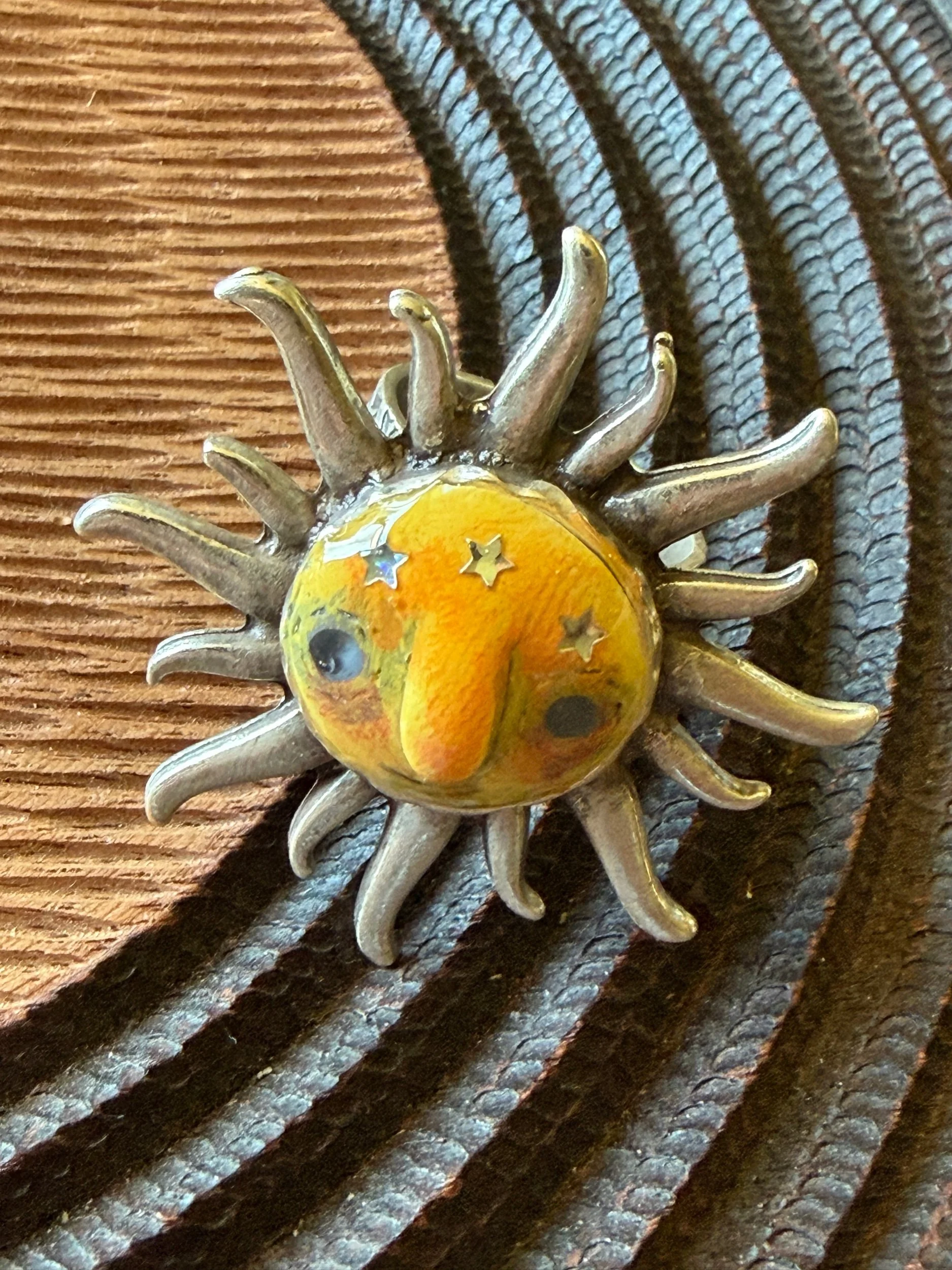 *Roughly 40mm in diameter full piece, this 15mm Art Ring is sculpted and painted in studio. Finishes with acrylic paint and layered with clear resin for durability. This sweet face is set in a rustic sturdy metal frame that we have purchased and has an adjustable band that fits most sizes, not made in studio. Our pieces are all one of a kind and might be imperfectly perfect!
