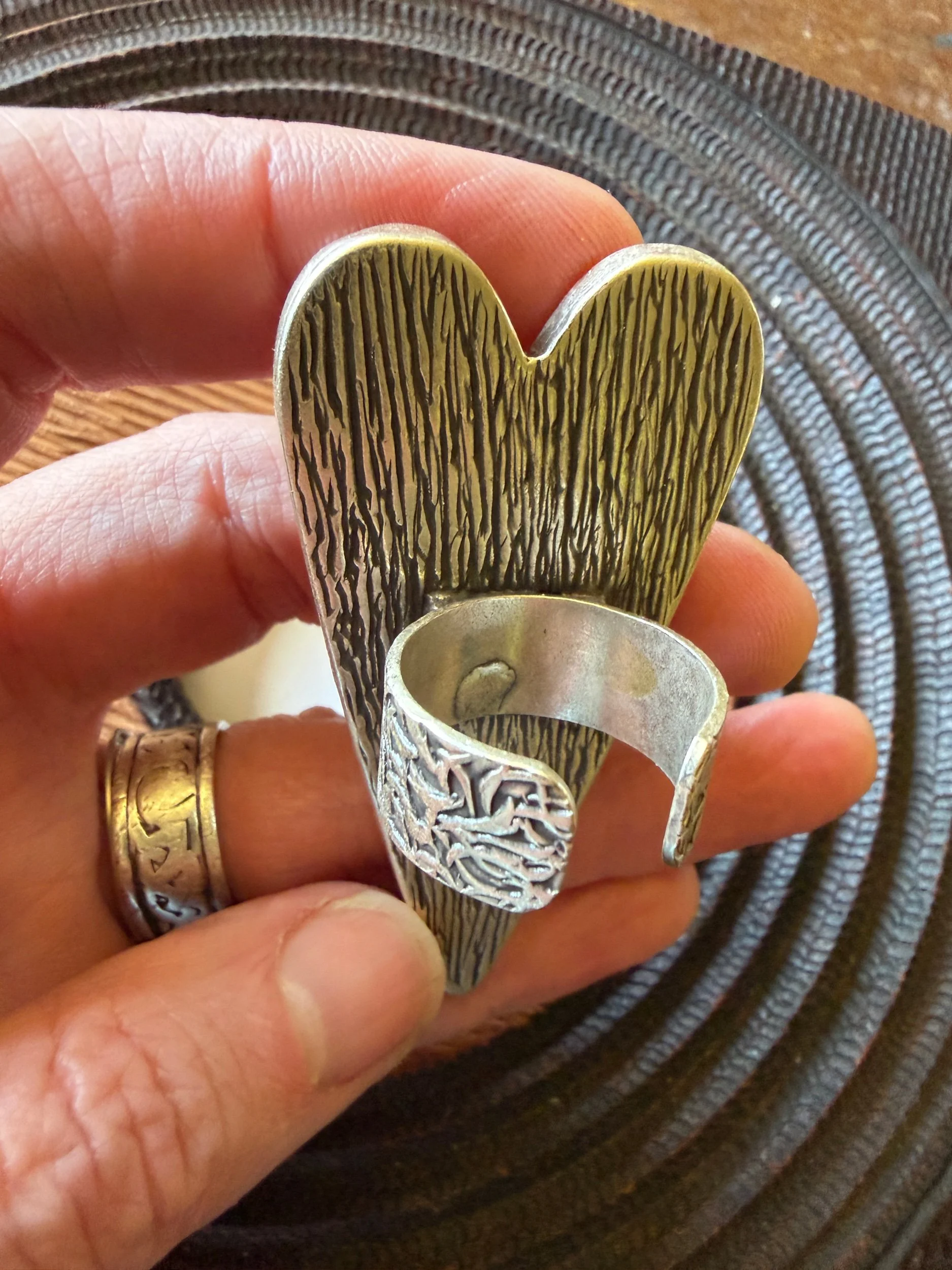 This heart ring is 2 ¾ inches long and 1 ½ inch wide, weighing approx. one ounce. This ring is hand sculpted clay, painted with acrylic paints and layered with protective clear resin coats. It is set in a fully adjustable sturdy metal bohemian style base (not handmade by us). All our pieces are perfectly (humanly) imperfect!