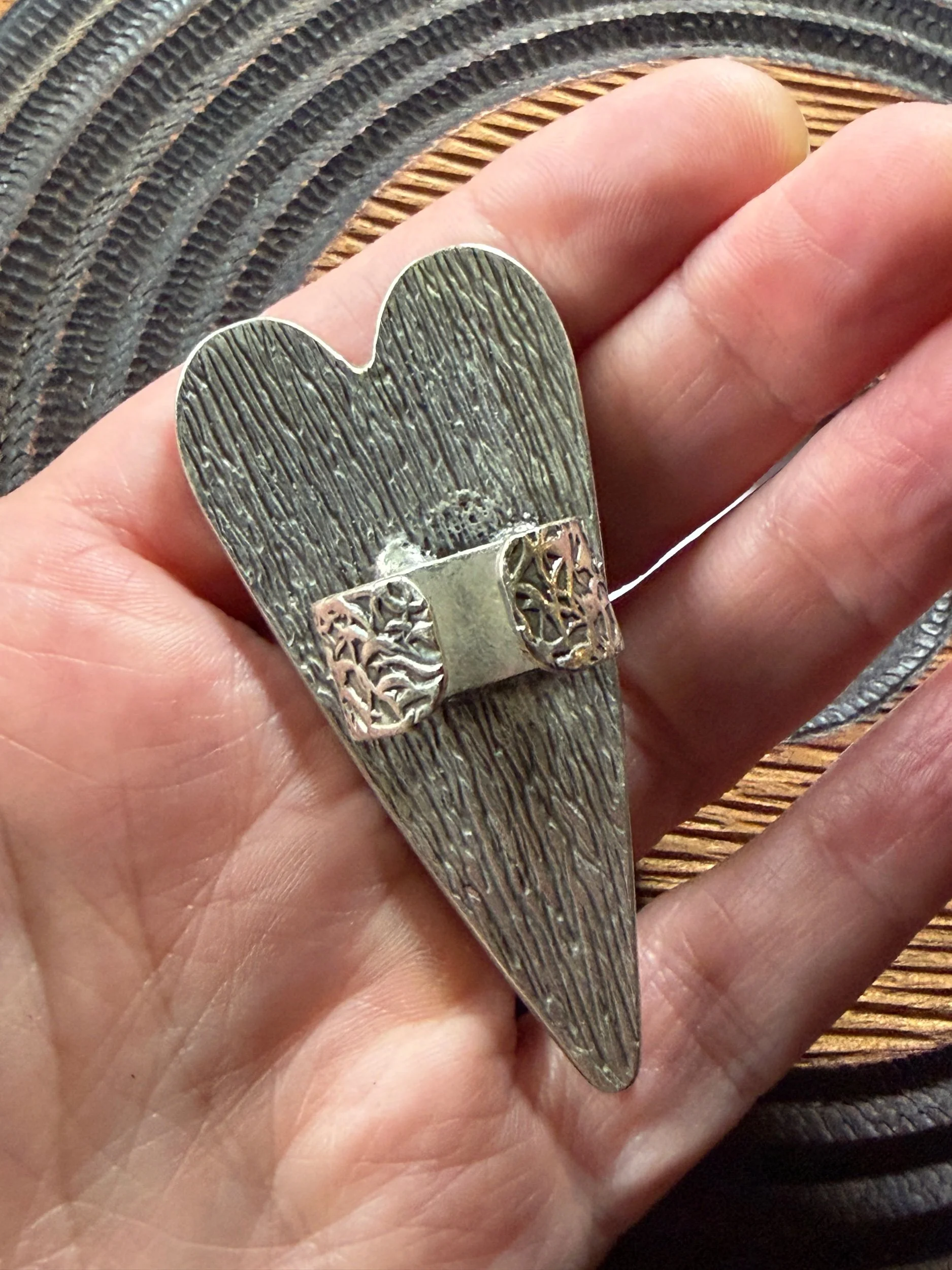 This heart ring is 2 ¾ inches long and 1 ½ inch wide, weighing approx. one ounce. This ring is hand sculpted clay, painted with acrylic paints and layered with protective clear resin coats. It is set in a fully adjustable sturdy metal bohemian style base (not handmade by us). All our pieces are perfectly (humanly) imperfect!