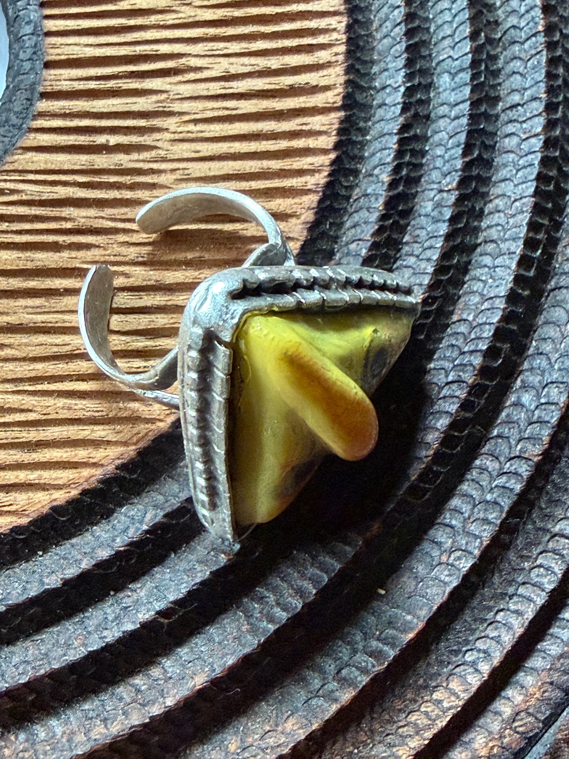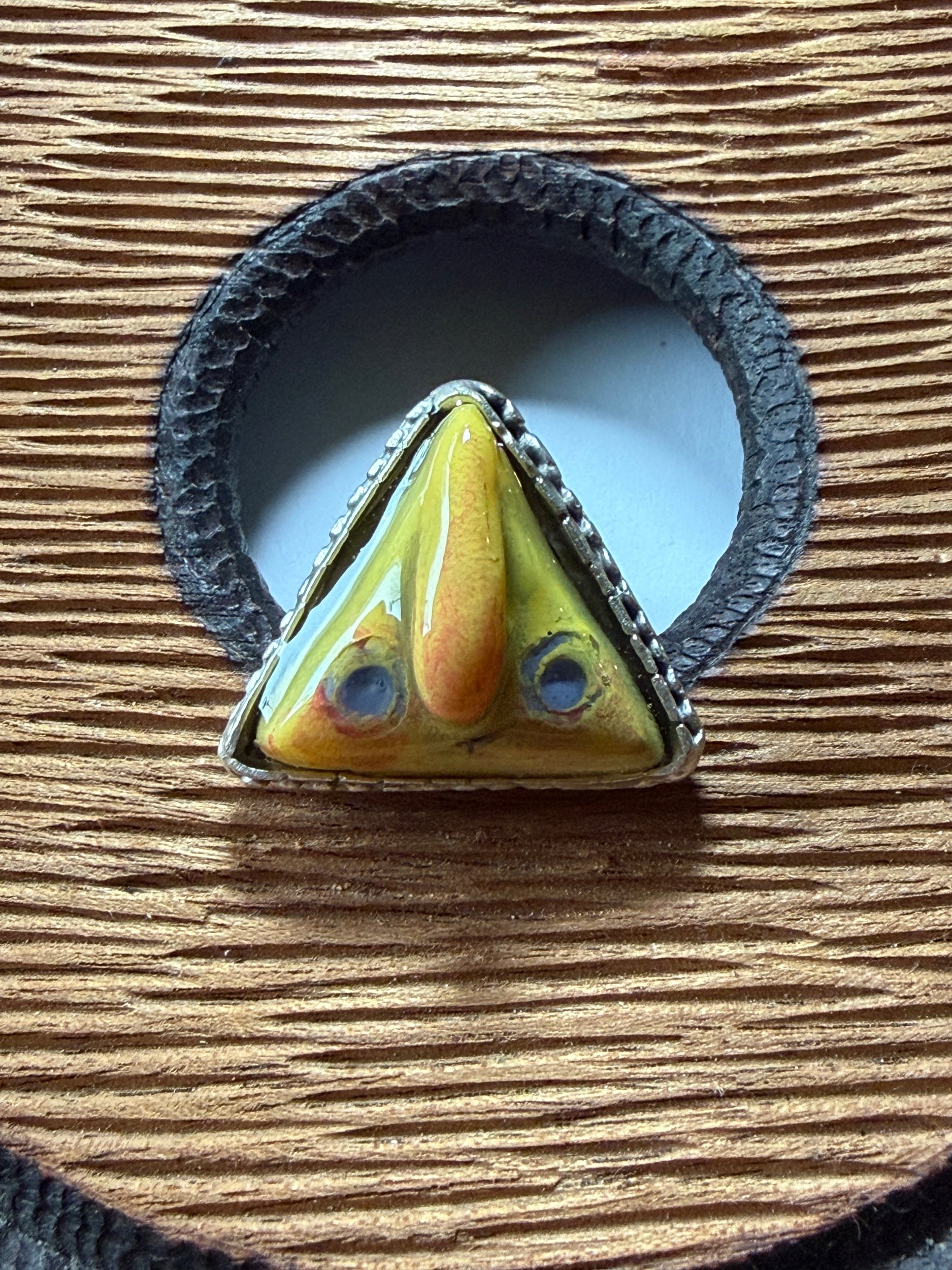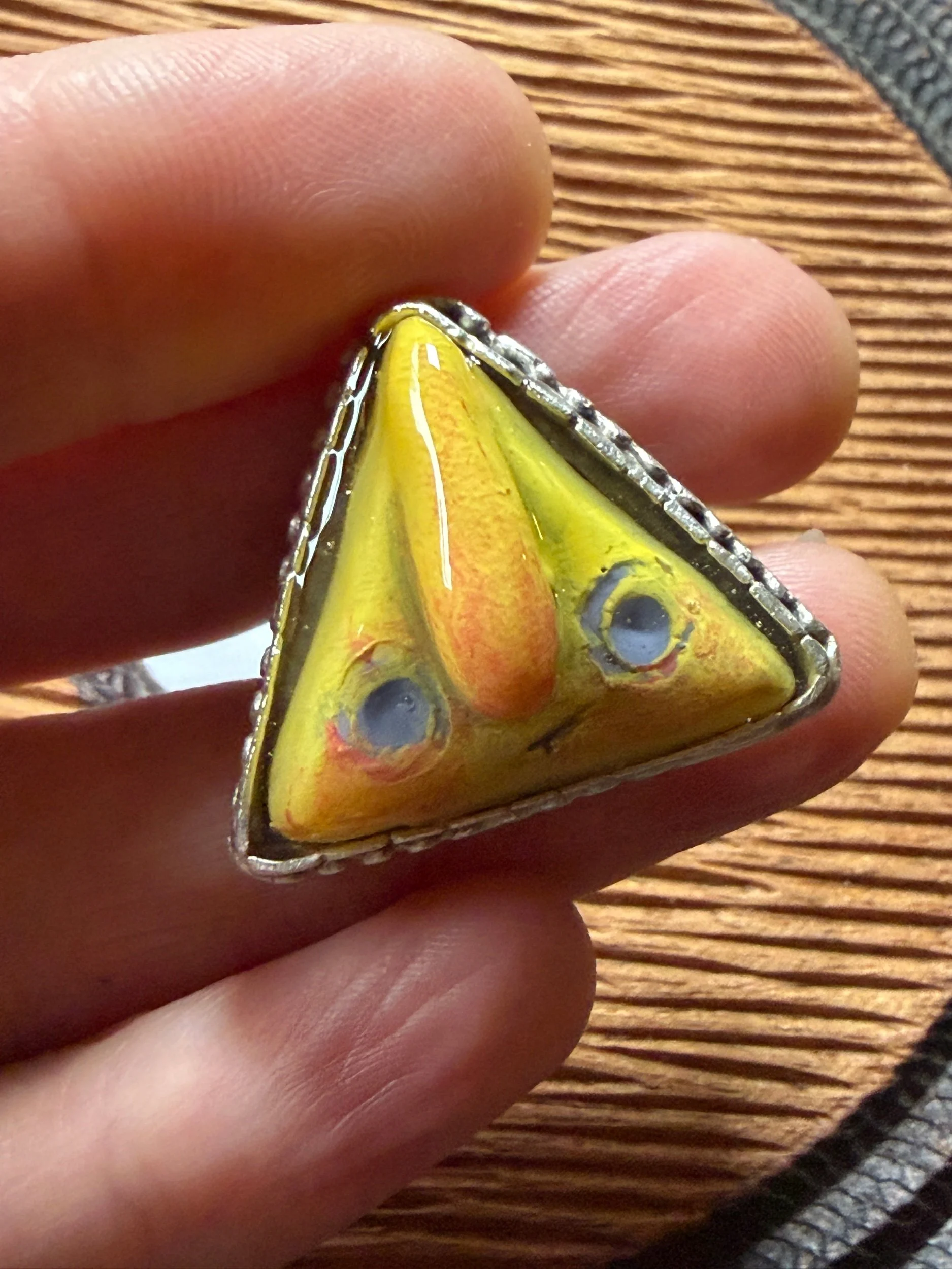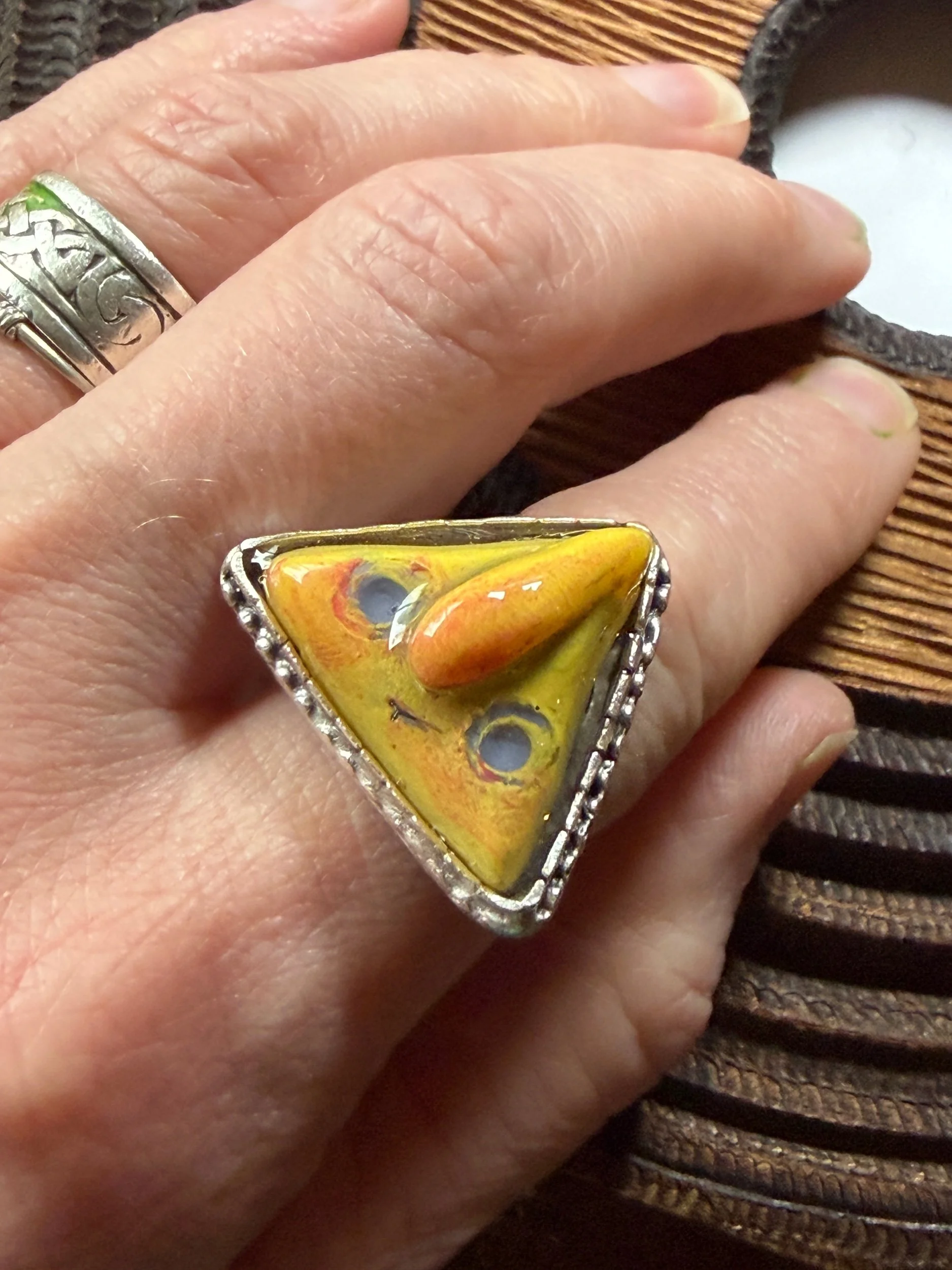 This ring is a lovingly sculpted original design, molded and poured in resin. It’s hand painted surface is finished in a thick clear coat of resin and set in a sturdy, adjustable, metal base (not precious metals) for durability. All of our pieces are handmade and may be perfectly imperfect.
