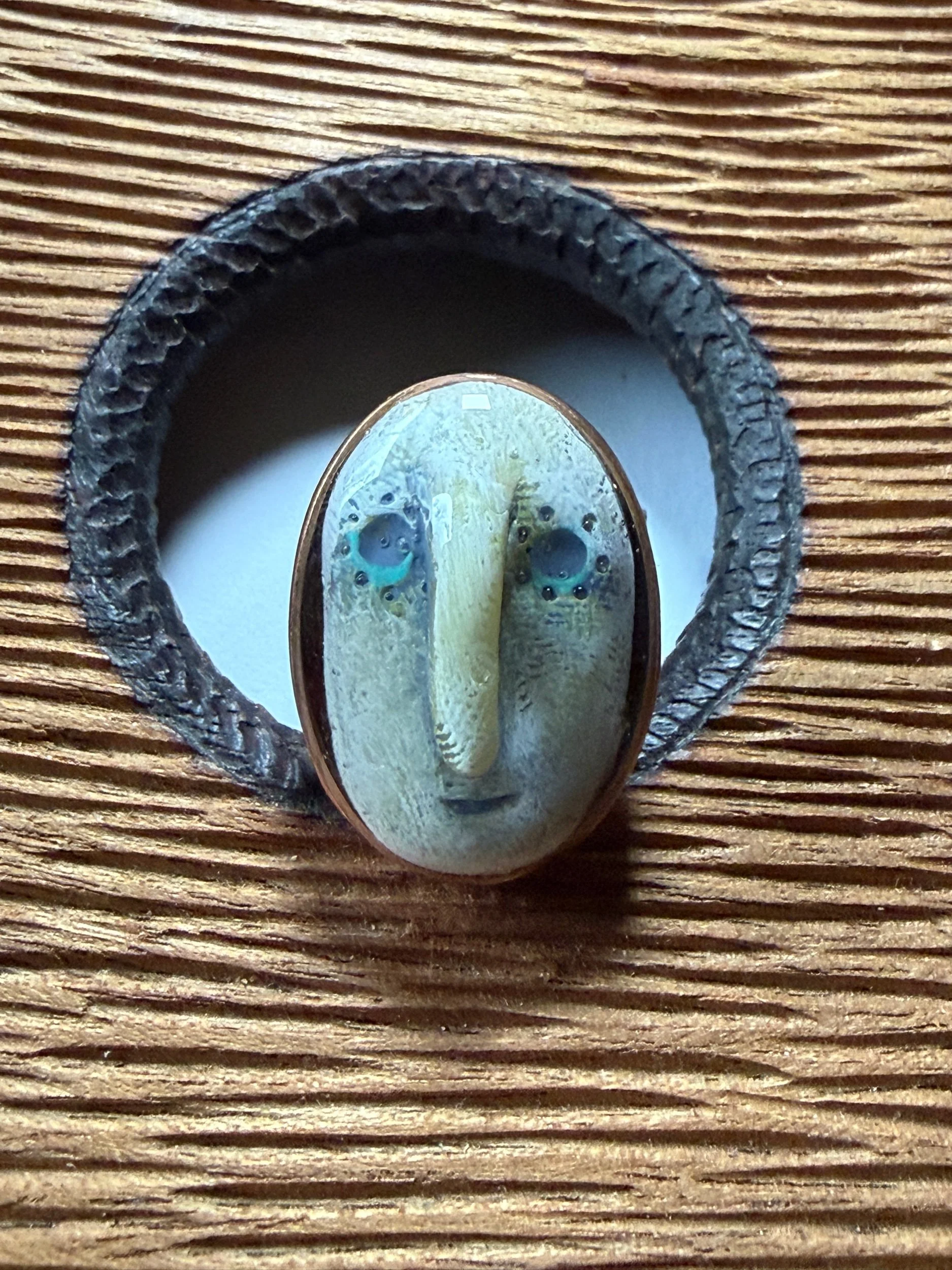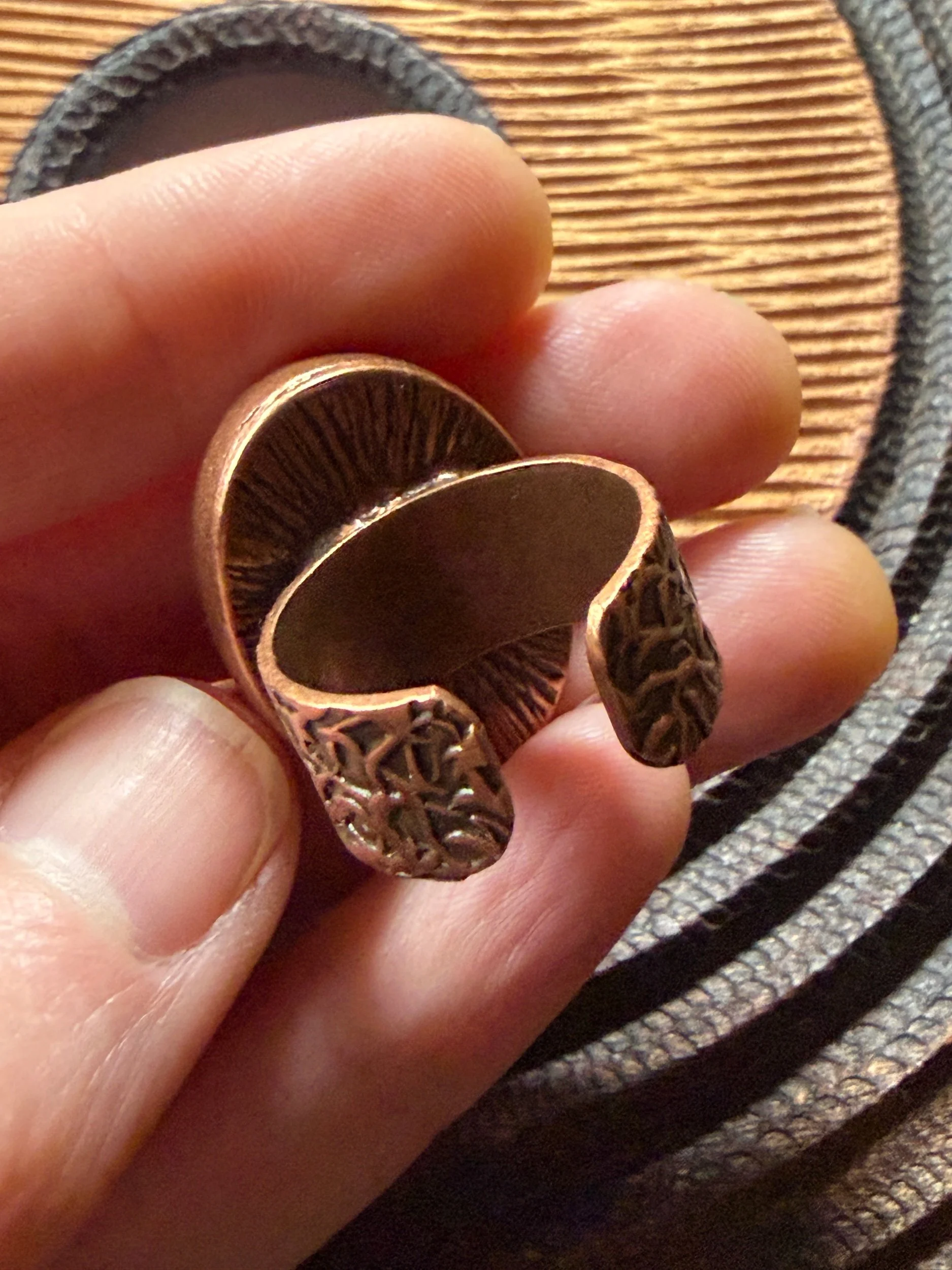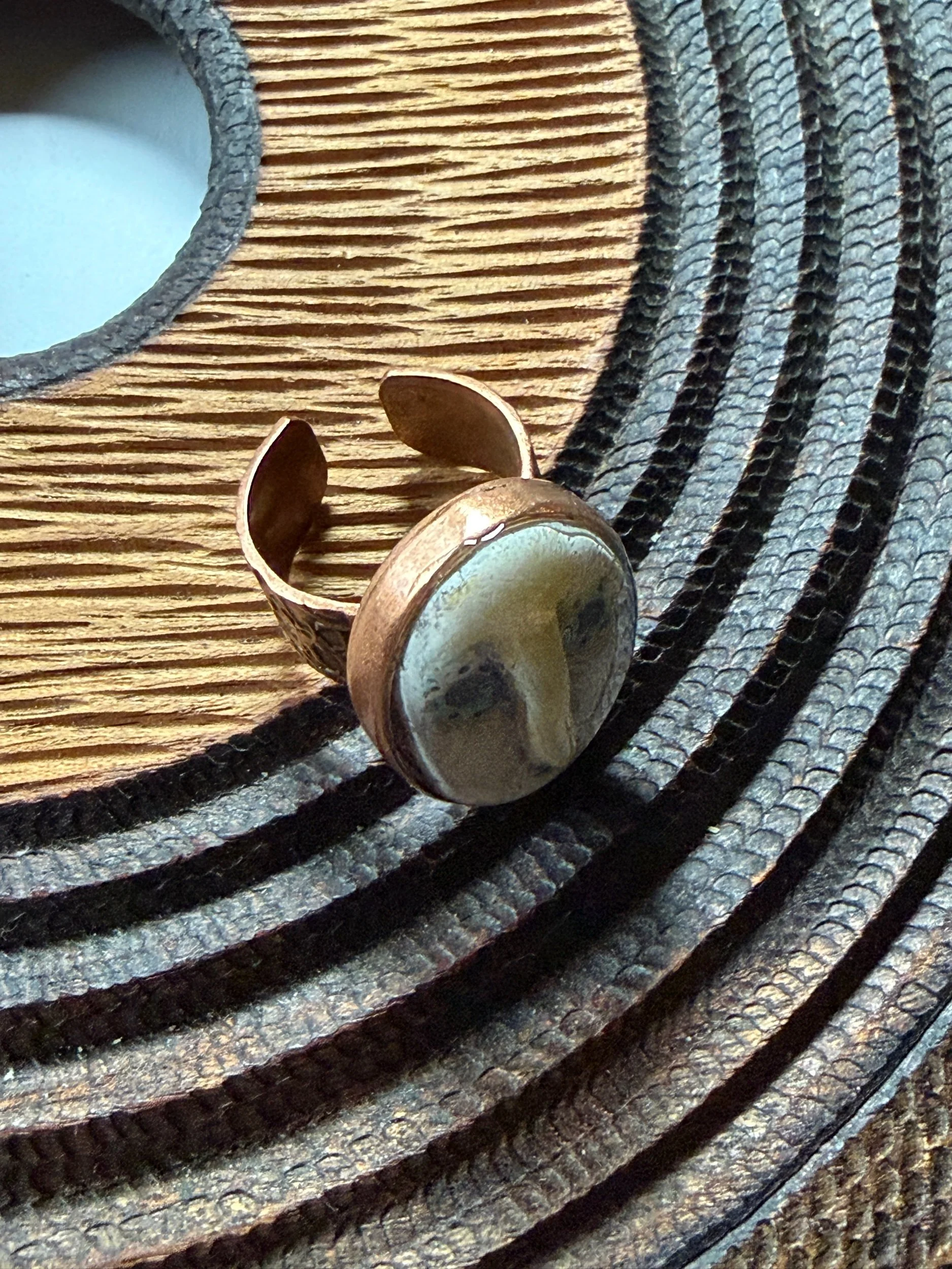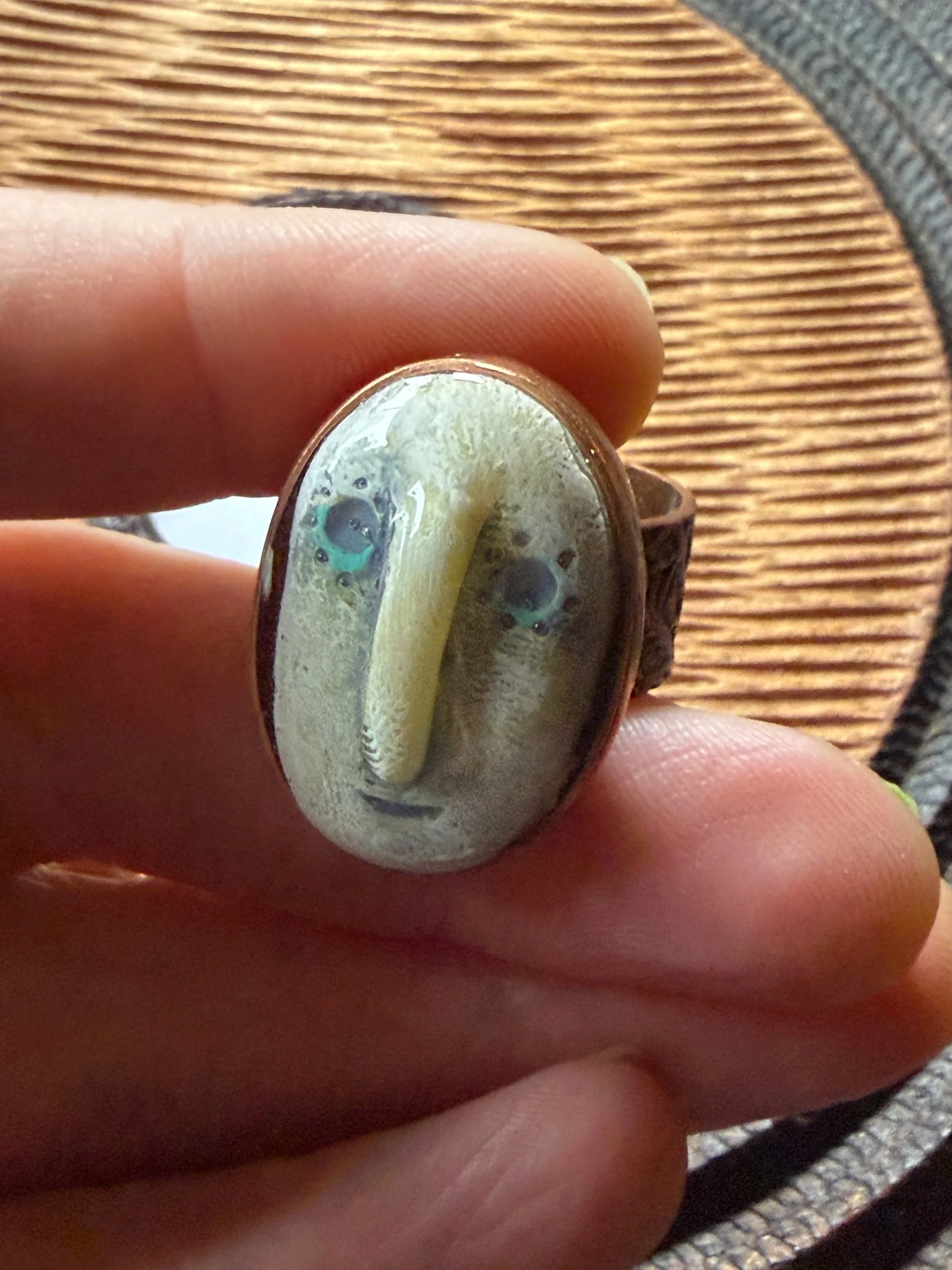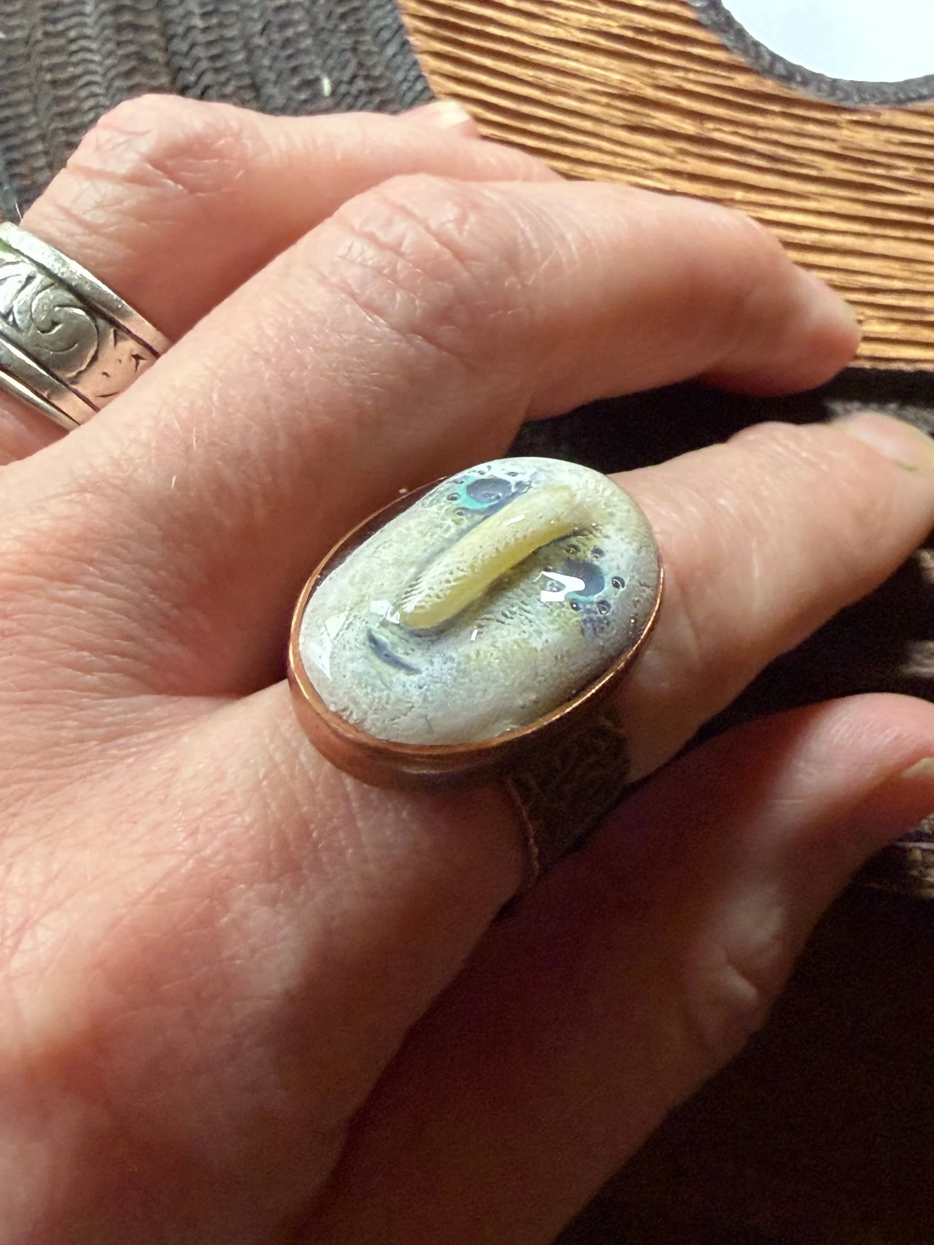 Comfortable to wear and one size fits most adjustable, this ring is 25×18mm, copper (metal parts not designed or made by us). The size is perfect for an accent ring or to wear alone! It is sculpted from polymer clay, molded and cast in resin, hand painted and then coated with several clear resin topcoats. (All of our pieces are one of a kind and may be imperfectly perfect.)