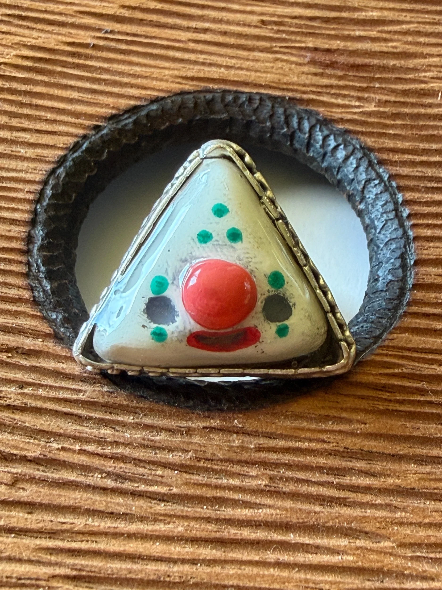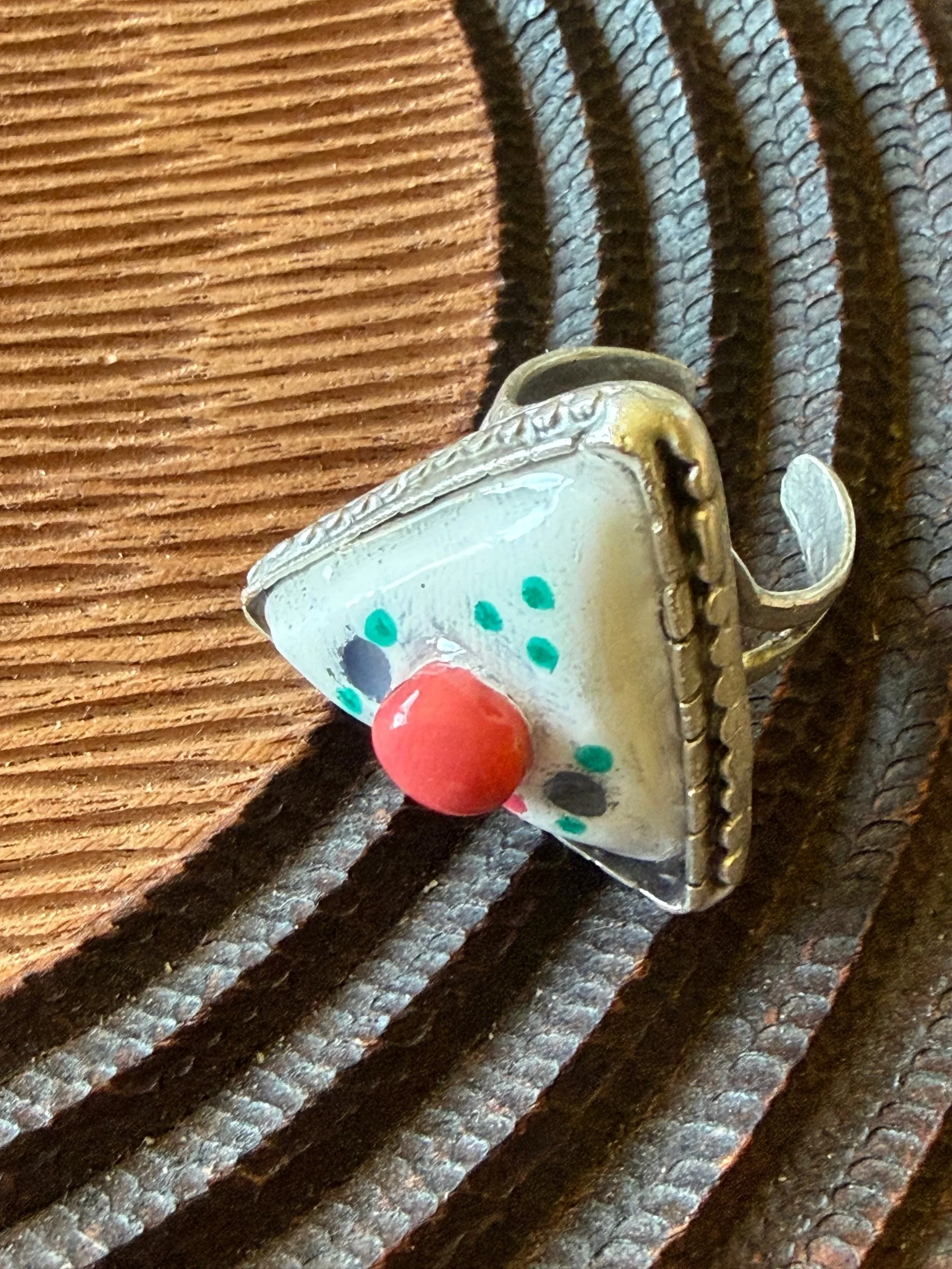 This ring is a lovingly sculpted original design, molded and poured in resin. It’s hand painted surface is finished in a thick clear coat of resin and set in a sturdy, adjustable, metal base (not precious metals) for durability. All of our pieces are handmade and may be perfectly imperfect.