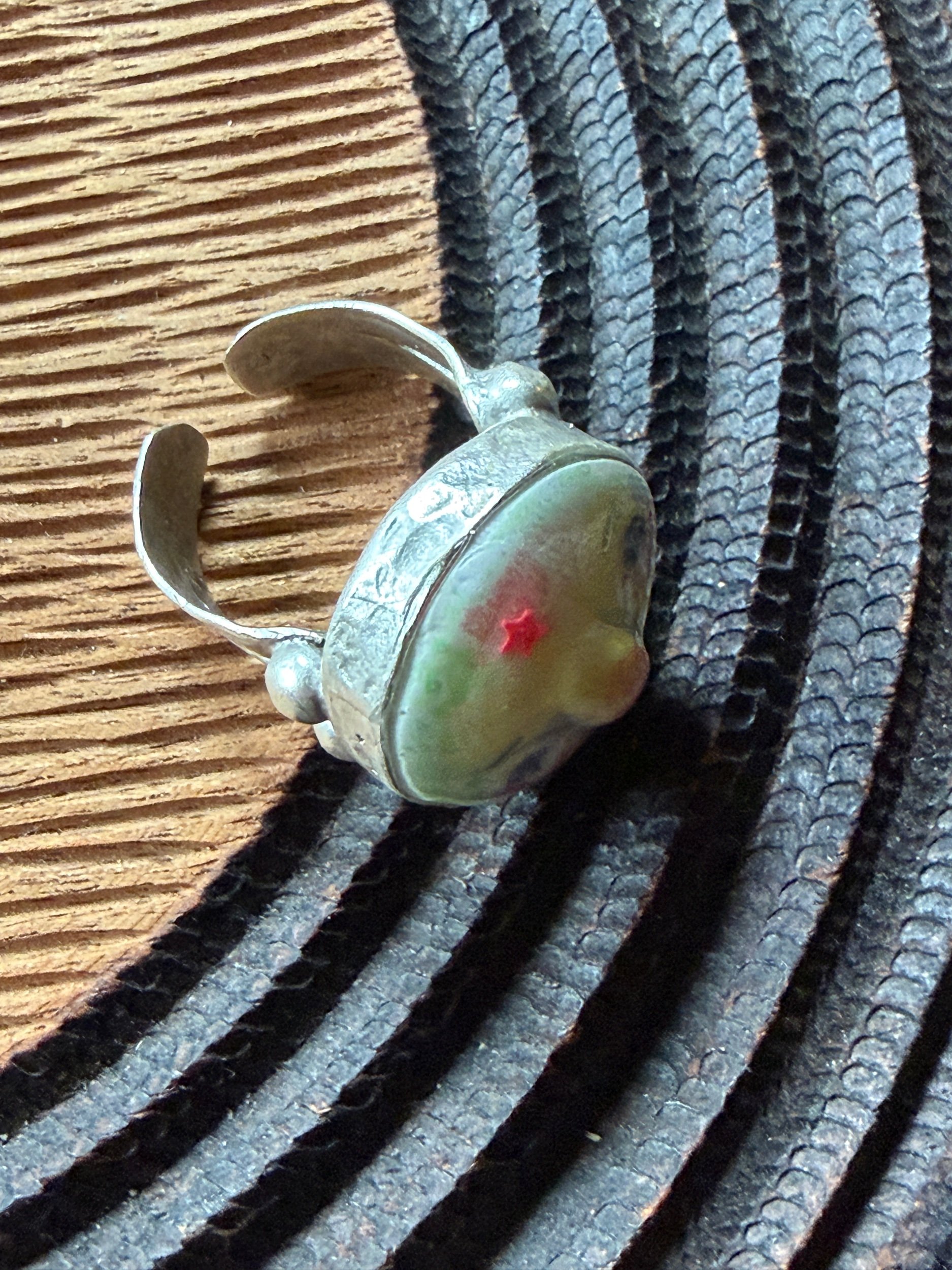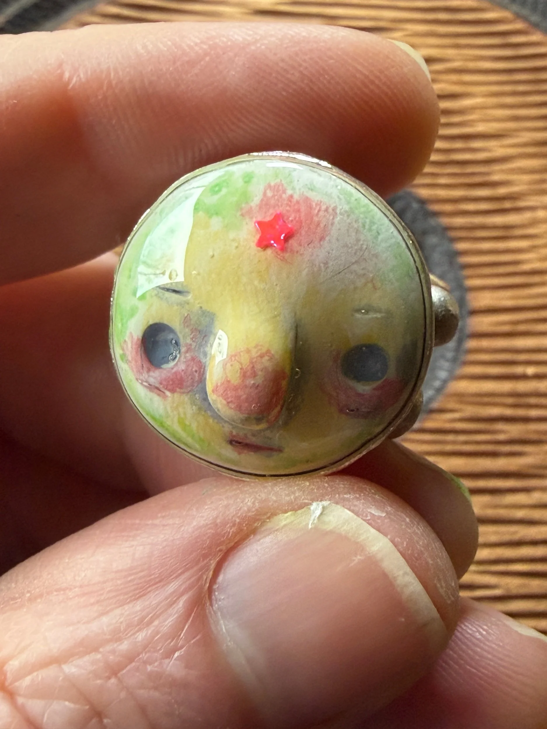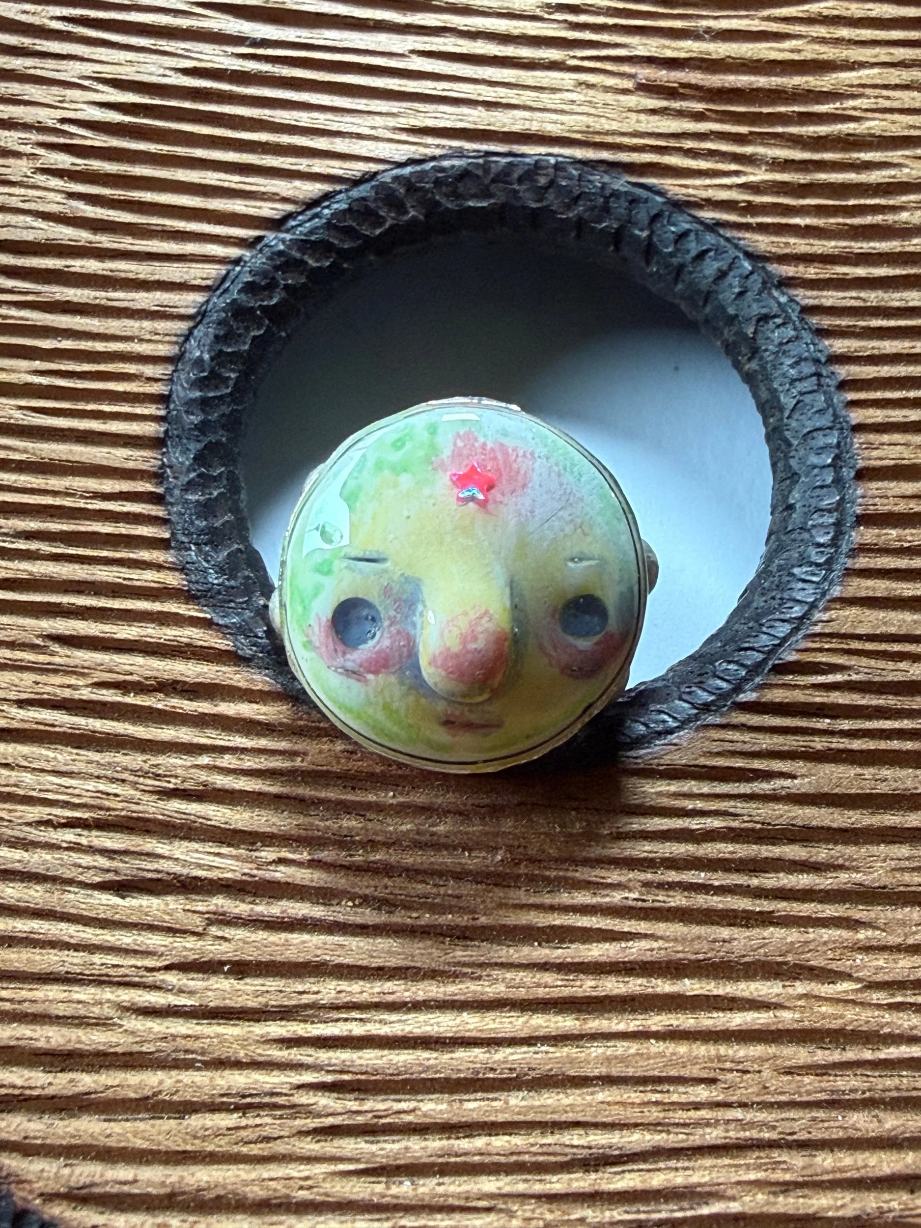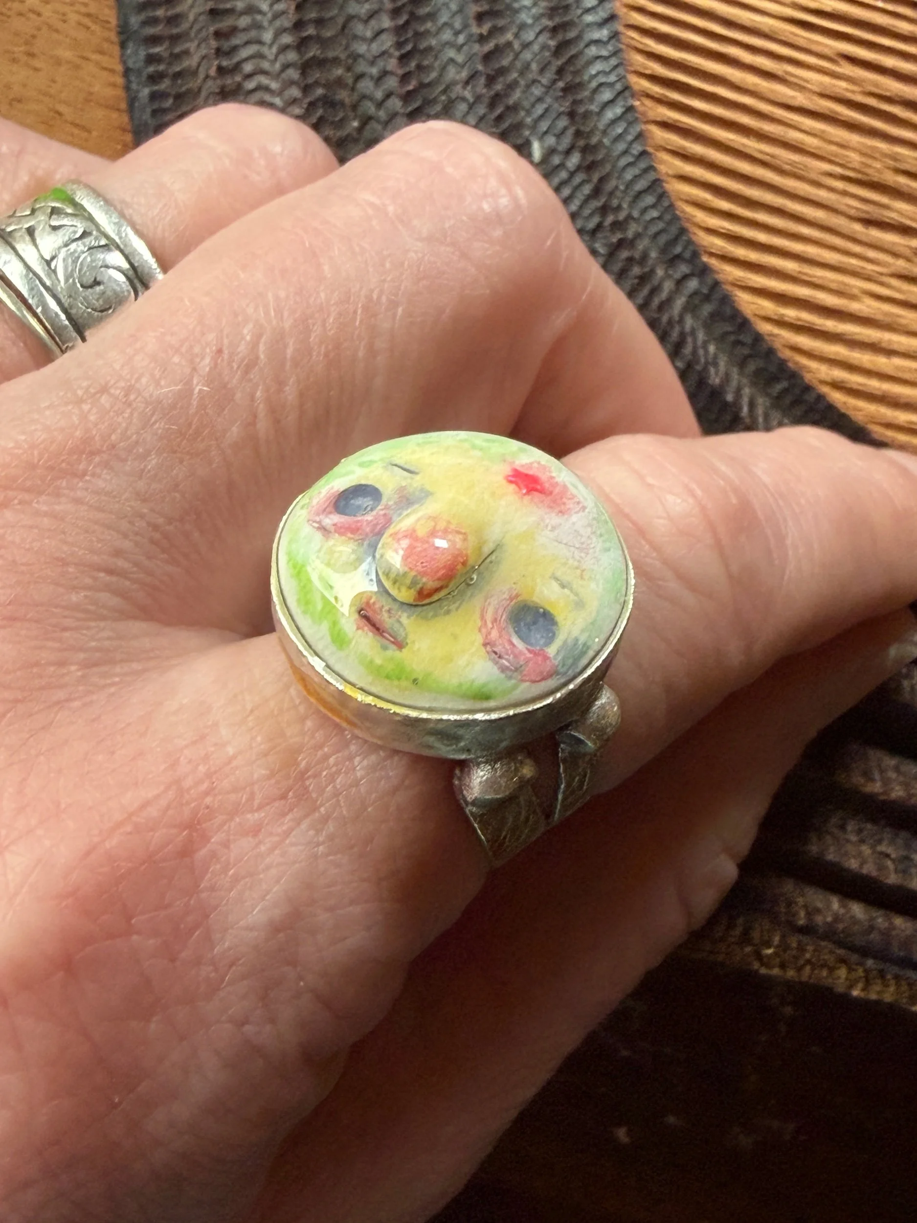 20mm in diameter, this Art ring is sculpted and cast by us, painted with acrylic paint and layered with clear resin for durability. This sweet face is set in a rustic sturdy metal frame that is one-size-fits-most adjustable. Our pieces are all one of a kind and might be imperfectly perfect! The metal parts are not made by us but were lovingly chosen for their imperfect, rustic beauty!