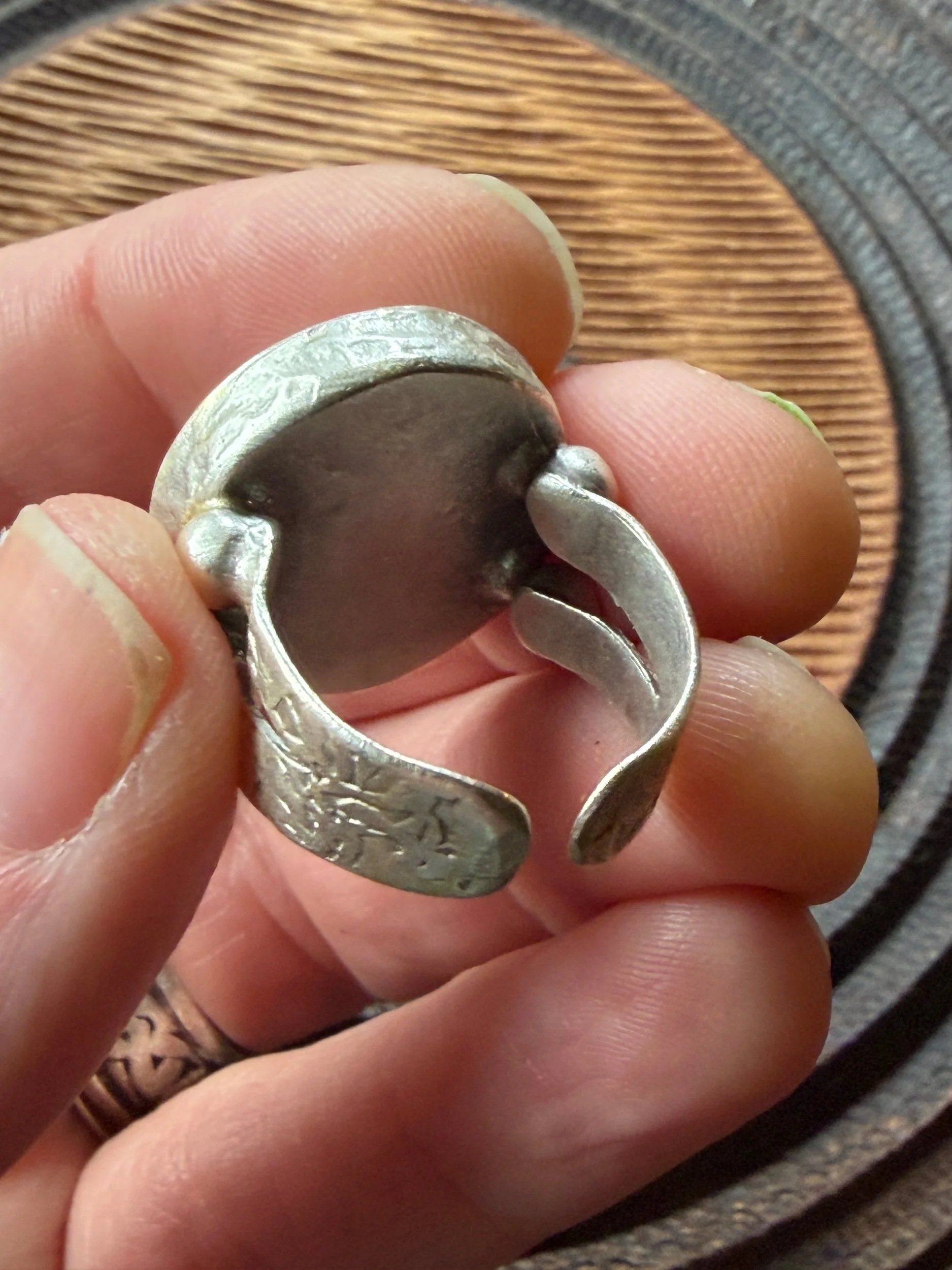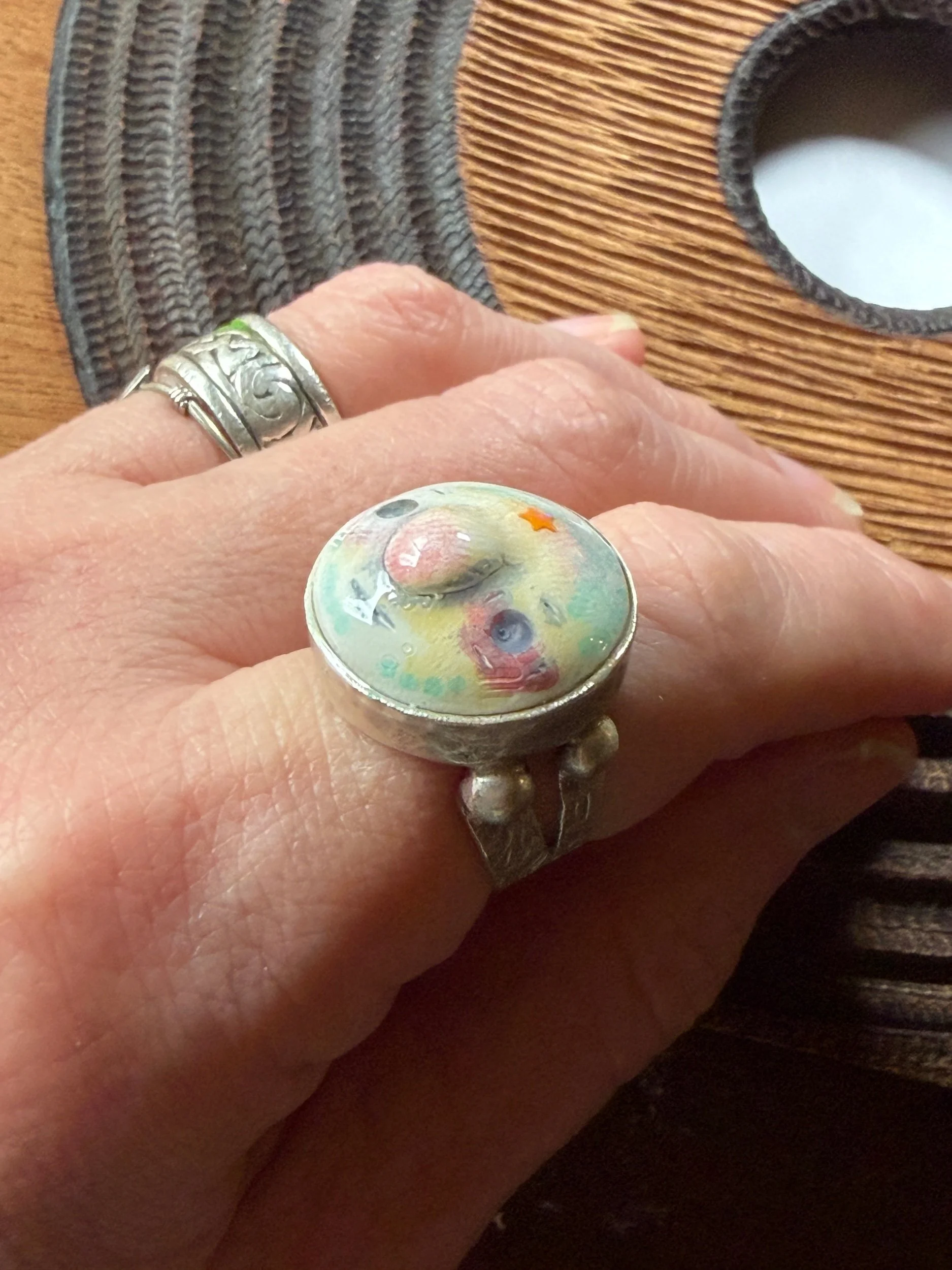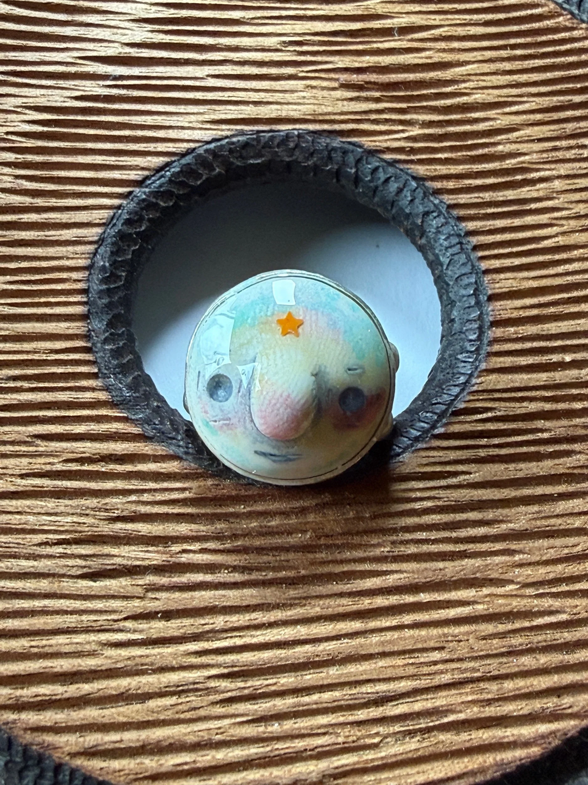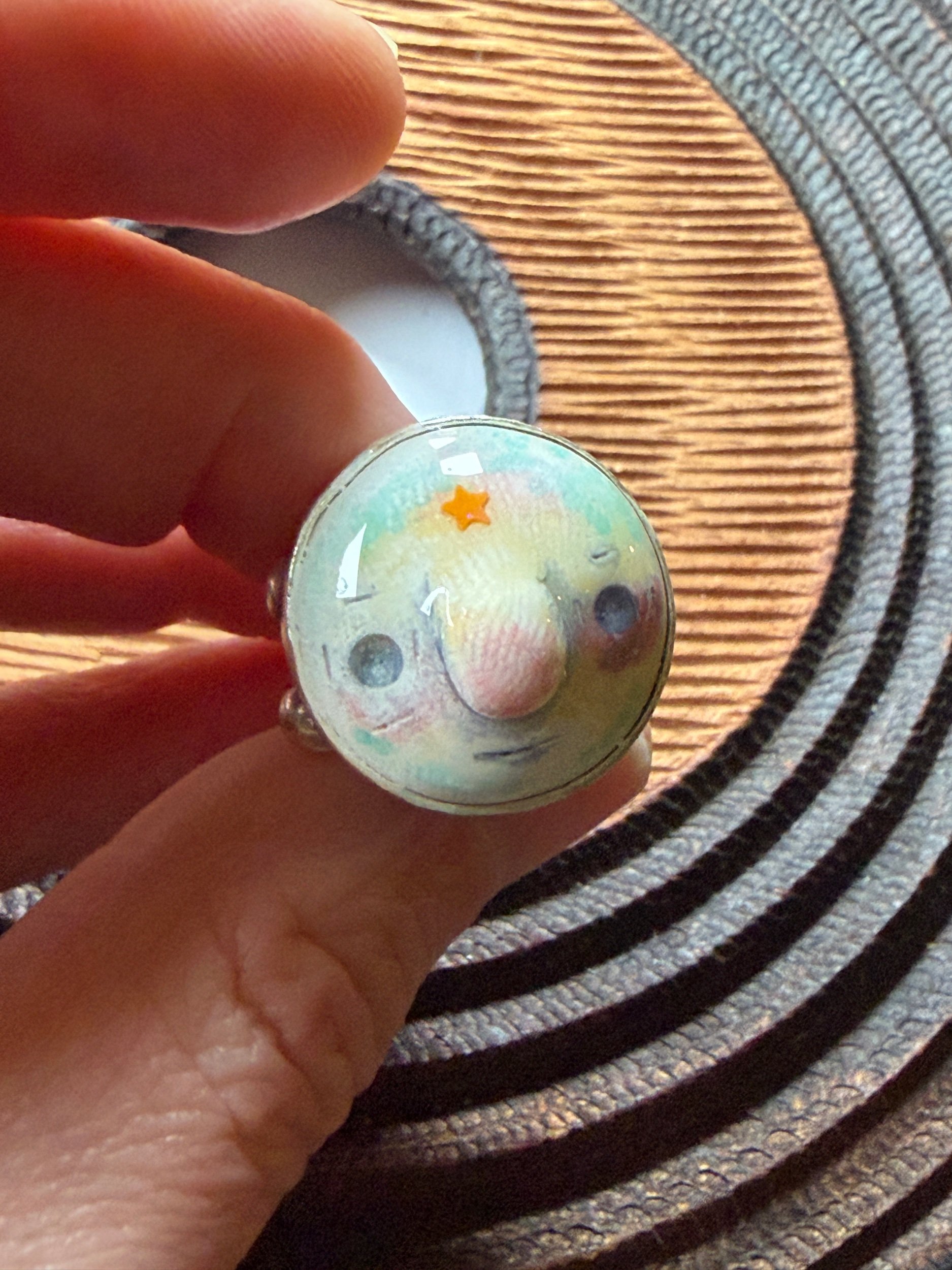 20mm in diameter, this Art ring is sculpted and cast by us, painted with acrylic paint and layered with clear resin for durability. This sweet face is set in a rustic sturdy metal frame that is one-size-fits-most adjustable. Our pieces are all one of a kind and might be imperfectly perfect! The metal parts are not made by us but were lovingly chosen for their imperfect, rustic beauty!